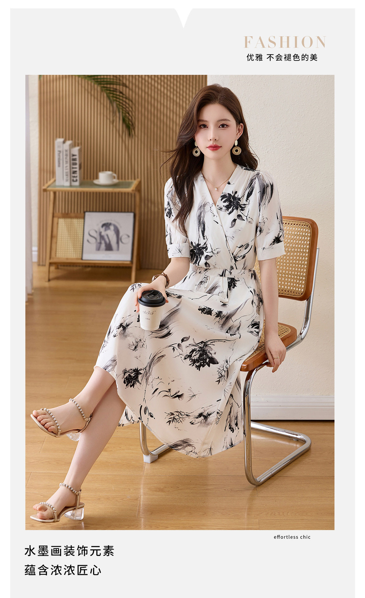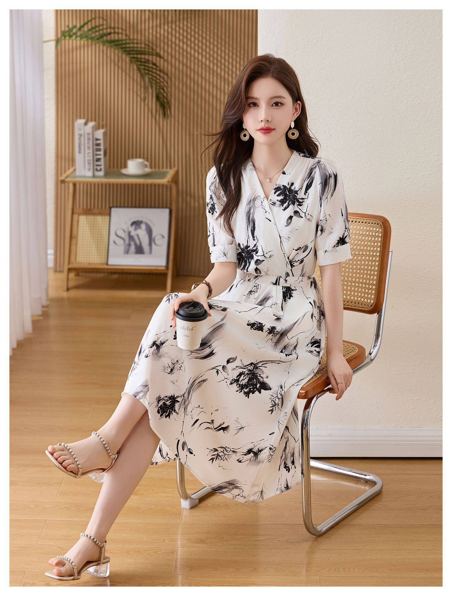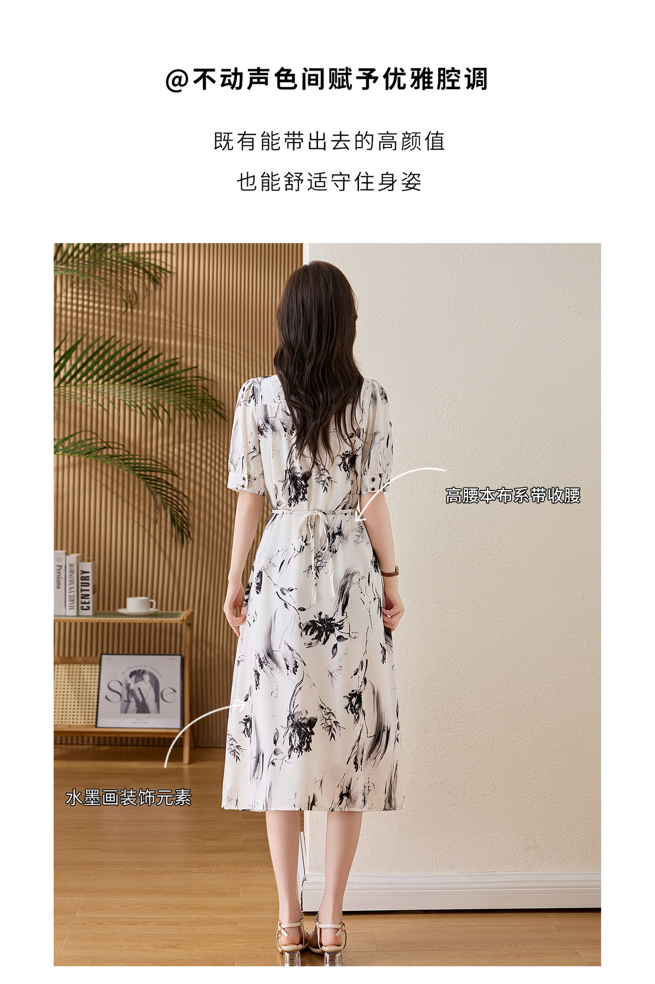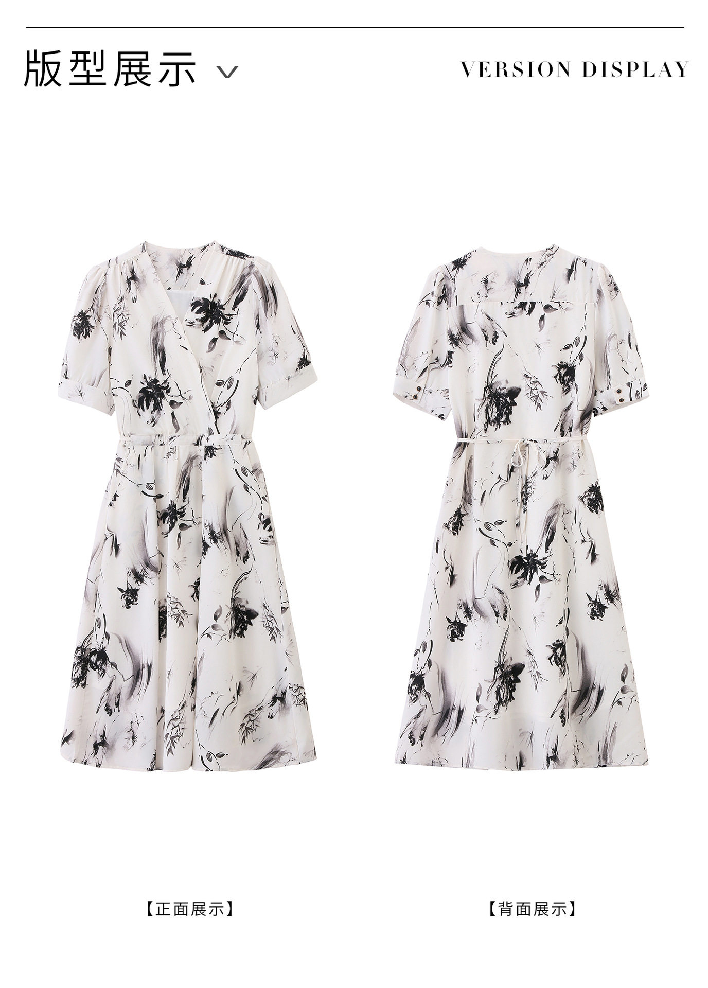 「自」全新升级【铂金会员257/天猫339/差价82】(01233)洛诗琳法式水墨印花连衣裙女2026新款气质V领收腰显瘦茶歇裙