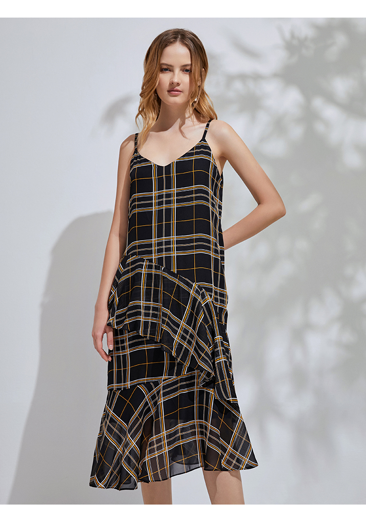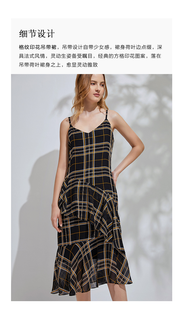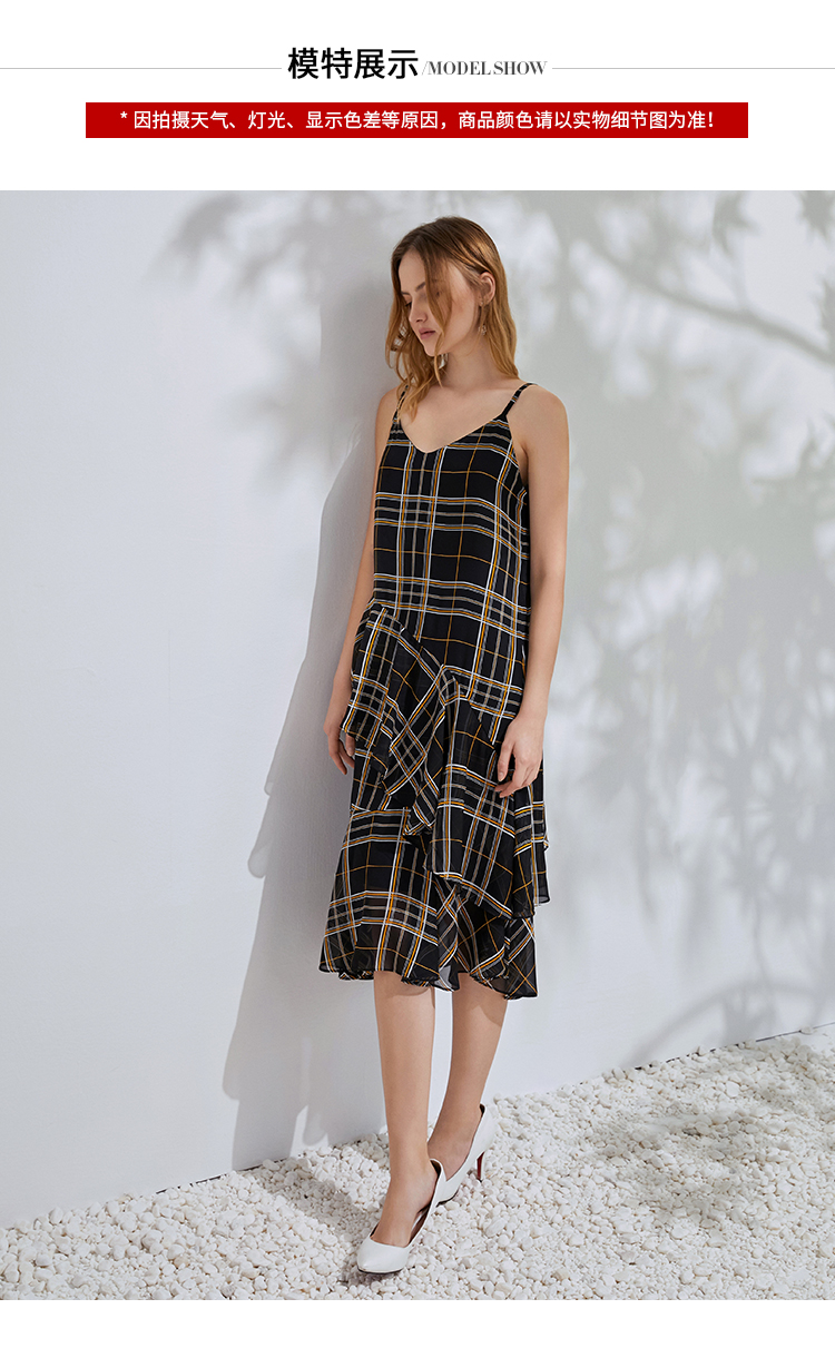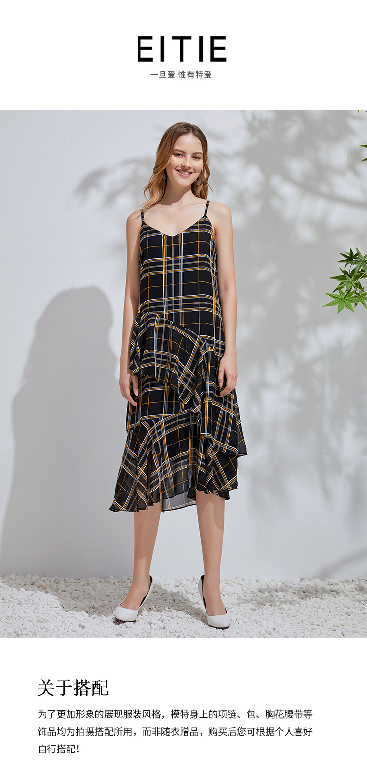 EITIE爱特爱春季新款显瘦V领洋气格纹荷叶边裙摆吊带连衣裙6107843