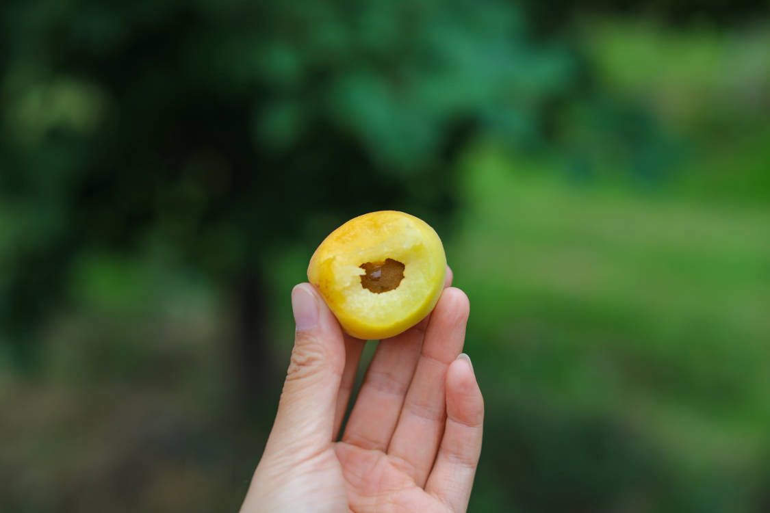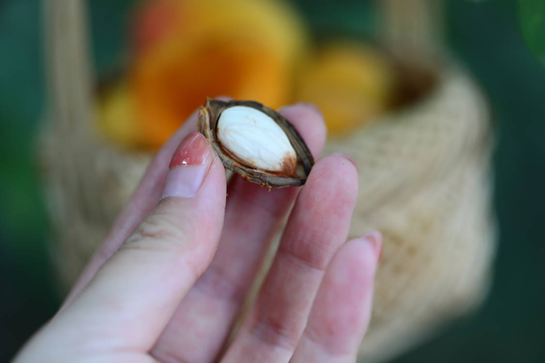离核甜仁,是崂山香蜜杏的特色,大多杏子都是苦杏仁,需要焯水后才可食用,但崂山香蜜杏杏核本身就是甜的,敲开后直接吃,清脆爽口,饱满香甜。