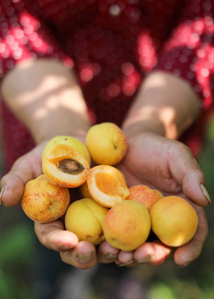 崂山香蜜杏的妙处,在于即便果子硬着,只要周身都泛黄了,吃起来也已经几乎无酸,香甜可口。完全成熟后更是纯甜流蜜汁,掰开后似一湾蜜汁盈盈。