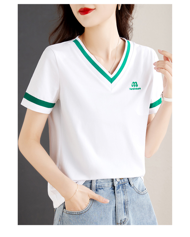 福利款~雀说撞色v领白色短袖t恤夏季女装显瘦正肩上衣高端半袖体恤AL20164
