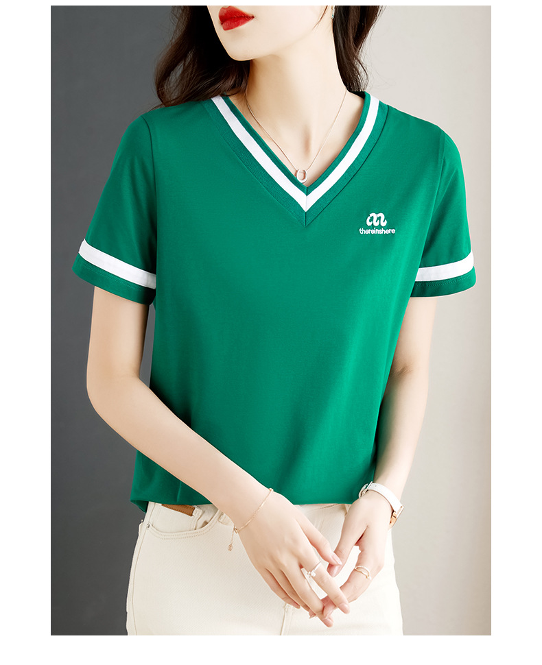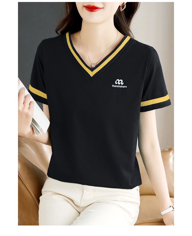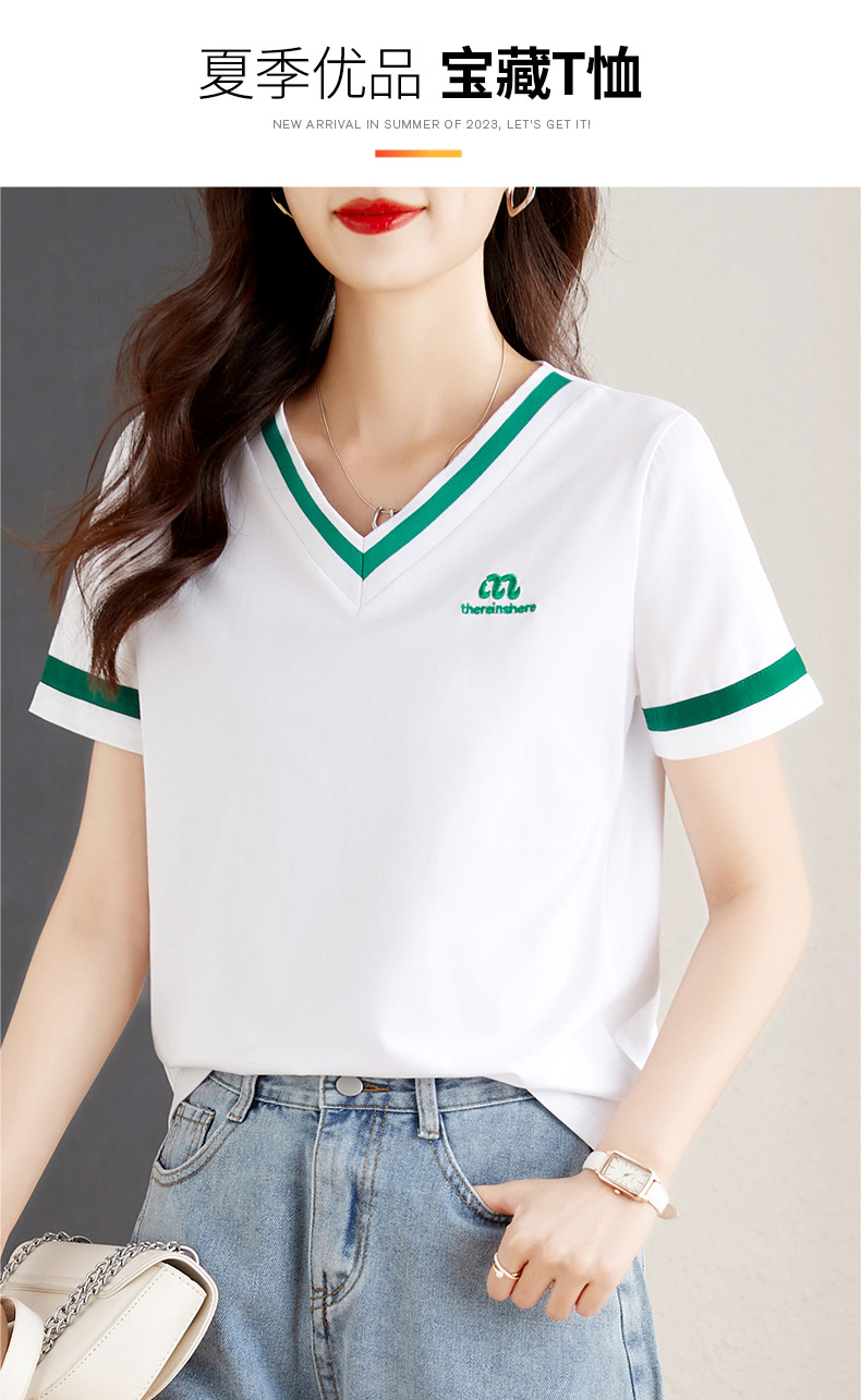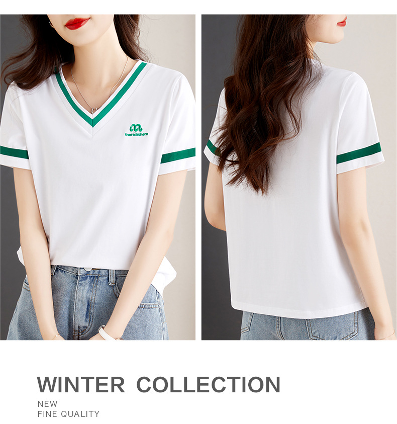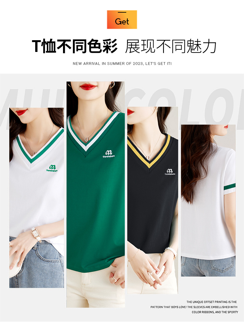 福利款~雀说撞色v领白色短袖t恤夏季女装显瘦正肩上衣高端半袖体恤AL20164 商品图0