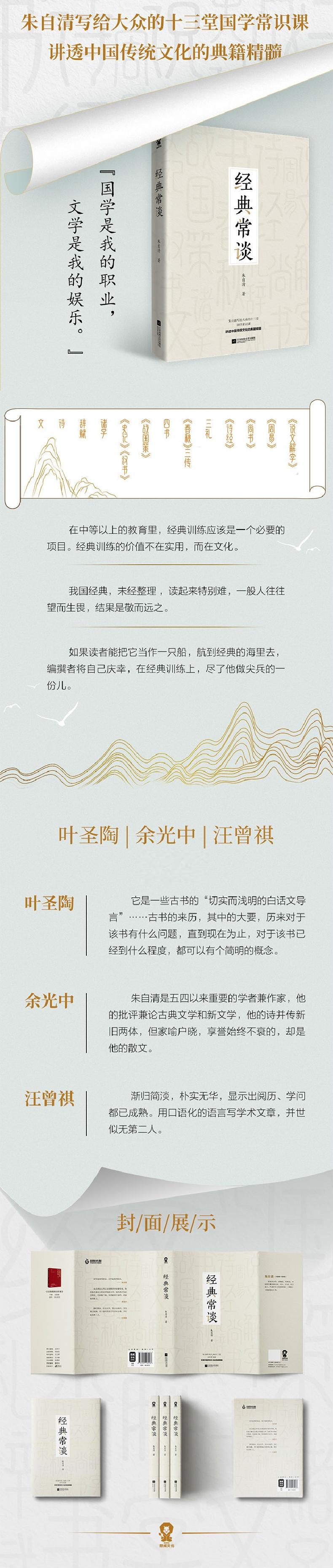 《经典常谈》包括说文解字、周易、尚书、诗经、三礼、春秋三传、四书、战国策、史记汉书、诸子、辞赋、诗、文等十三部分,详细介绍了中国古代文学的发展与历史脉络。文字要言不烦、通俗流畅,讲透我国文化遗产中的典籍精髓。《经典常谈》写于1942年,80年来广为流传,成为普及中国传统文化的启蒙经典。全书通过对经典的梳理与讲解,让读者对古文更亲近、熟悉,从而产生兴趣,是读者概览中国古典文学的佳作。此外,书中还特别收录《唐诗三百首》指导大概,以飨读者。