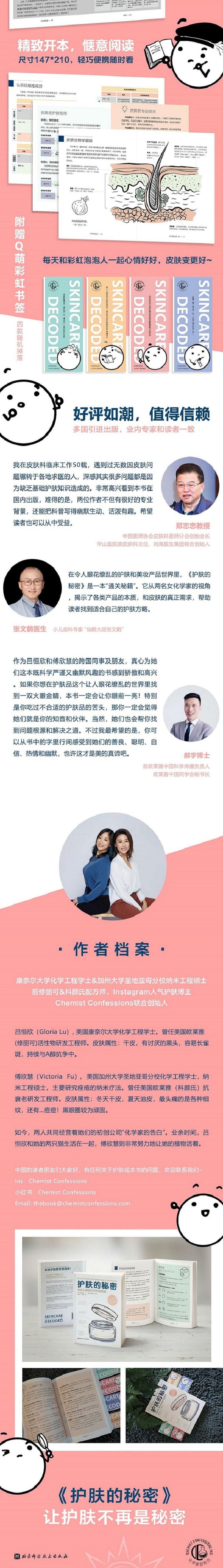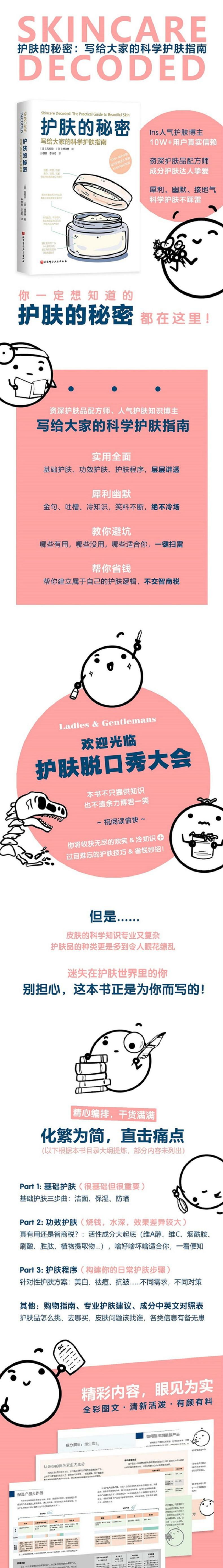 ★欢迎光临“护肤脱口秀大会”,本书不仅提供知识,也不遗余力博君一笑! ★迷失在护肤世界里的你一定想知道的护肤的秘密,都在这里! ★资深护肤品配方师、Ins人气知识博主写给大家的科学护肤指南 ★全彩印刷,轻巧开本,随书附赠Q萌彩虹泡泡人书签(4款随机掉落) 实用全面:基础护肤、功效护肤、护肤程序,层层讲透 犀利幽默:金句、吐 槽、冷幽默,笑料不断,绝不冷场 教你避坑:哪些有用、哪些没用、哪些适合你,一键扫雷 帮你省钱:带你建立属于自己的护肤逻辑,不交智商税
