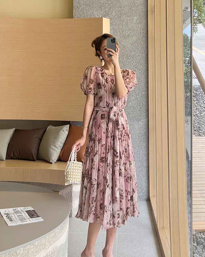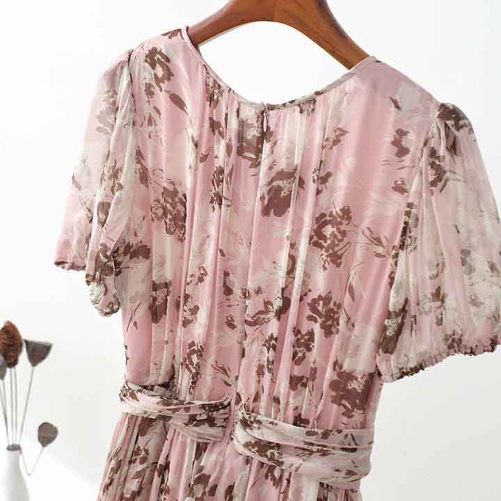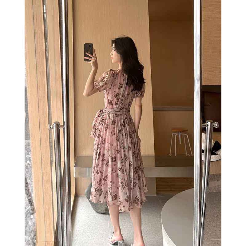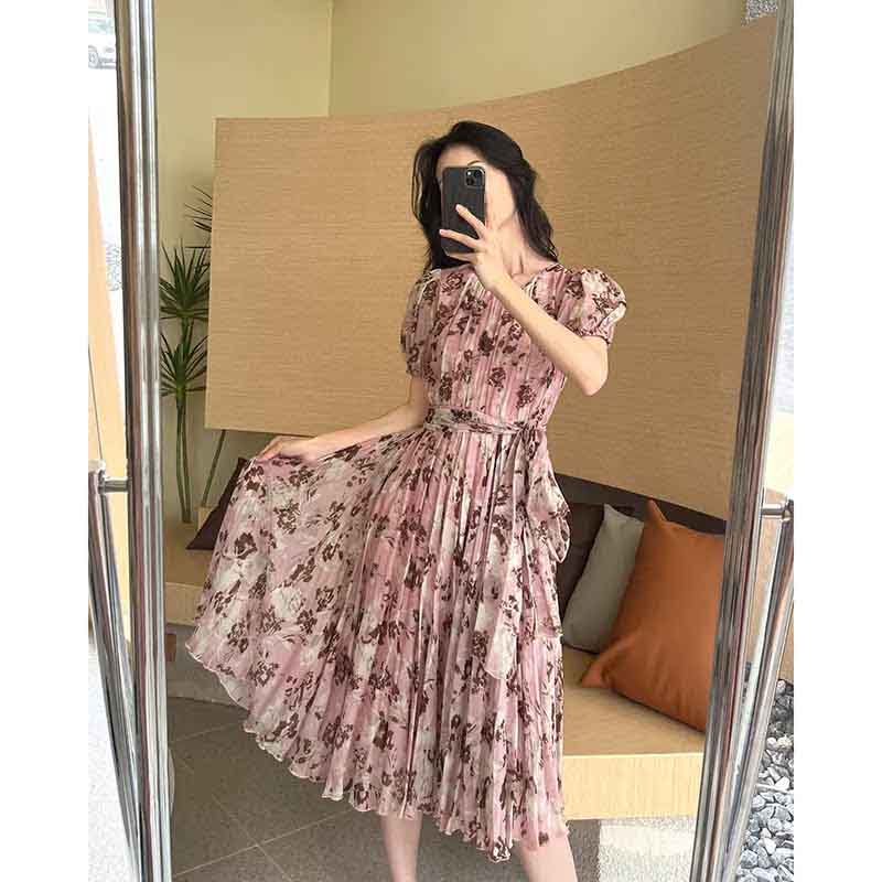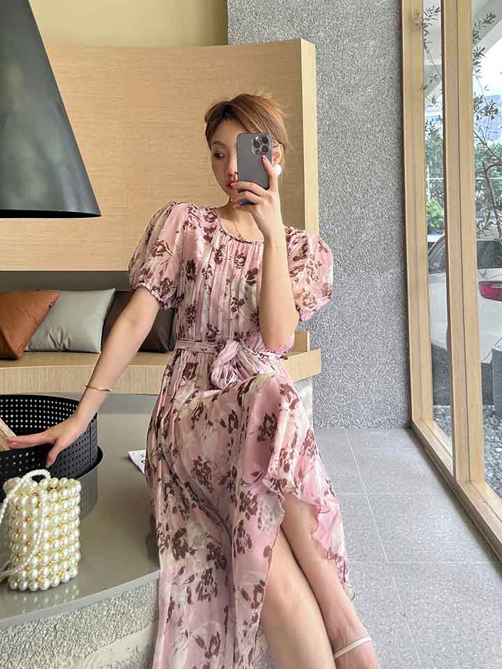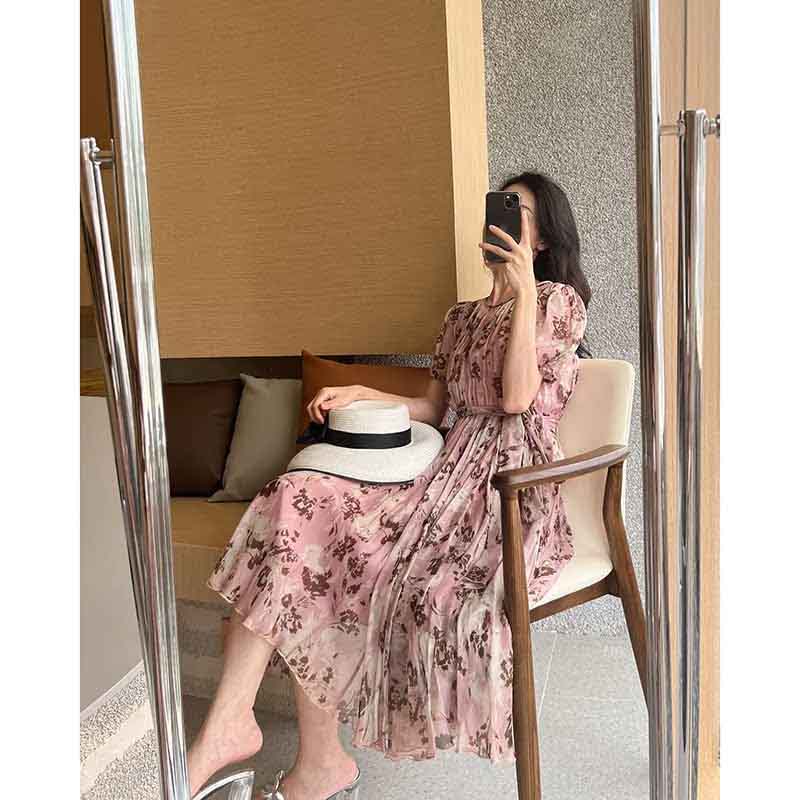 顺丰包邮洛诗琳64048夏季新款气质印花收腰大摆真丝连衣裙0099