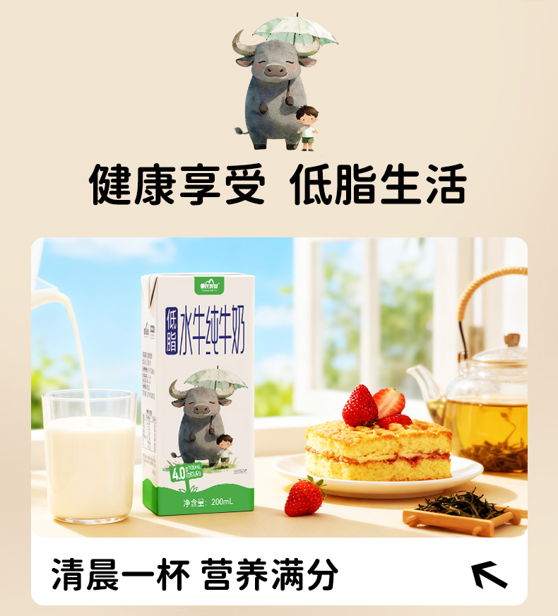 皇氏乳业低脂水牛纯牛奶 添加水牛奶 4.0g蛋白/100ml 健康低脂 200ML*10盒 减脂不减味 自带手提