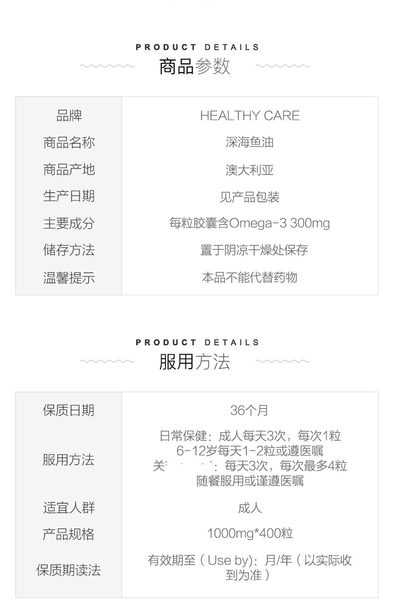 【跨境】澳洲Healthy Care澳世康 深海鱼油胶囊 1000mg*400粒(28年3月 )
