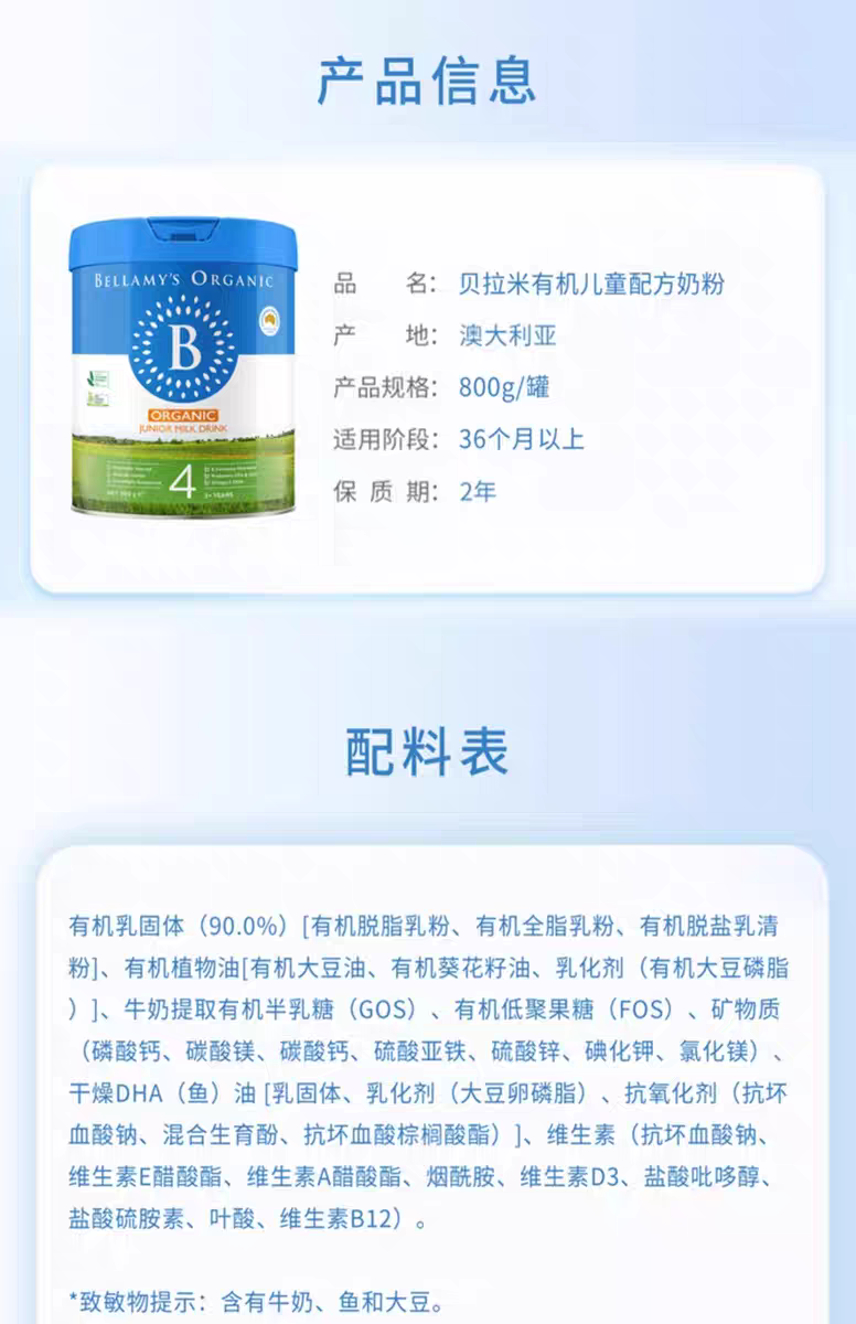 澳洲贝拉米有机经典婴幼儿奶粉4段 900g 跨境购
