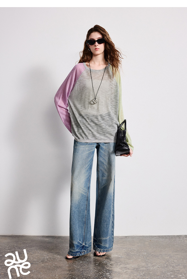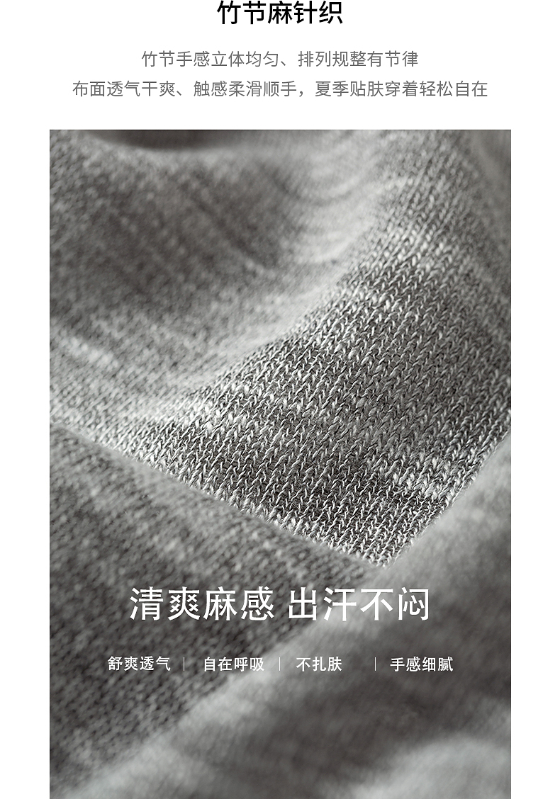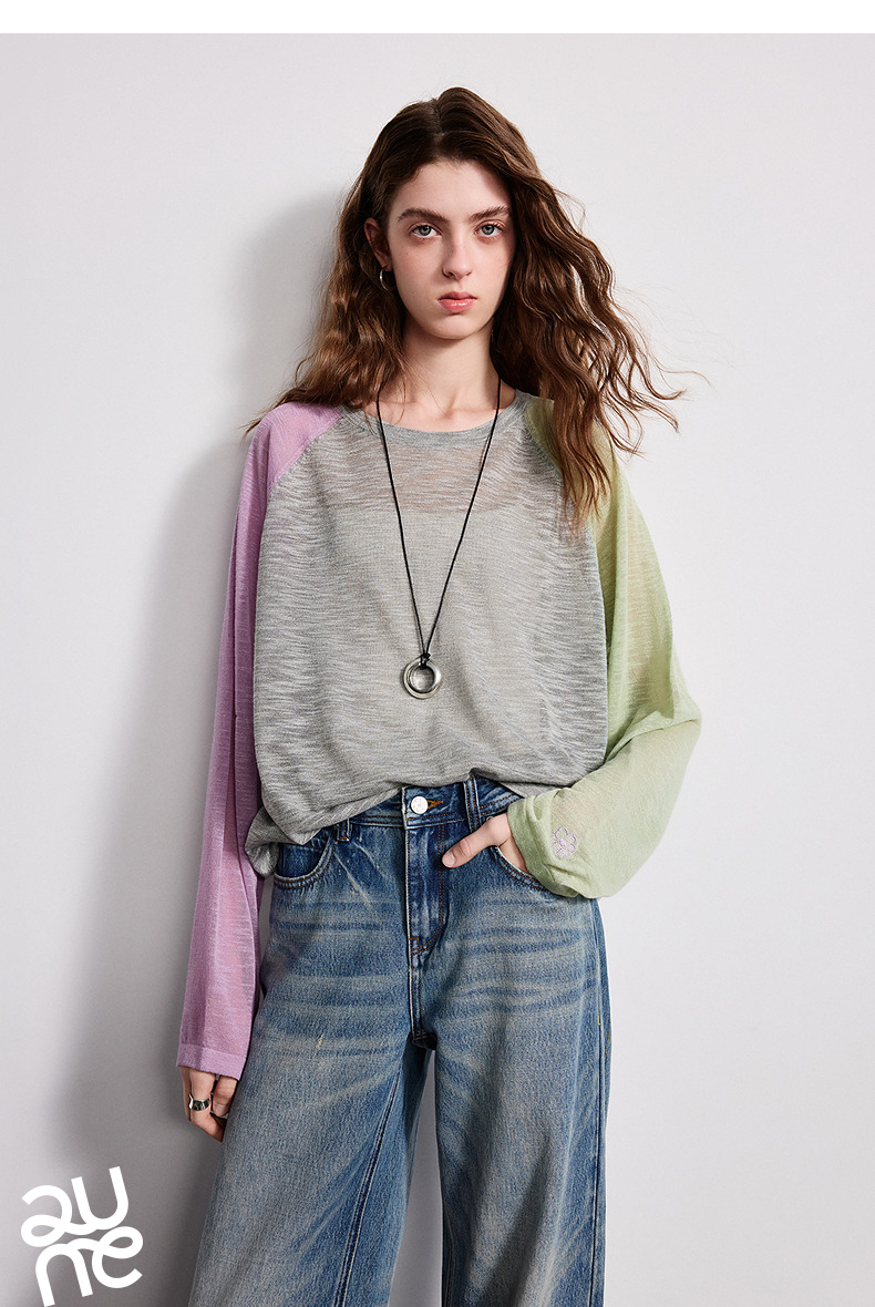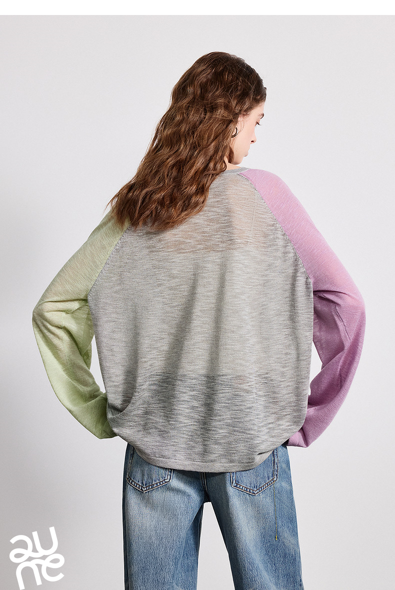 初语空气感竹节麻针织衫女2026新款圆领宽松不对称撞色上衣