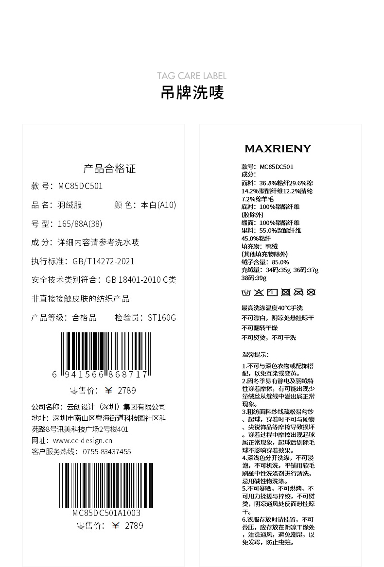 【贵雅日常-商场同款】MAXRIENY珍珠流苏毛须羽绒外套秋冬新款(货号:MC85DC501)