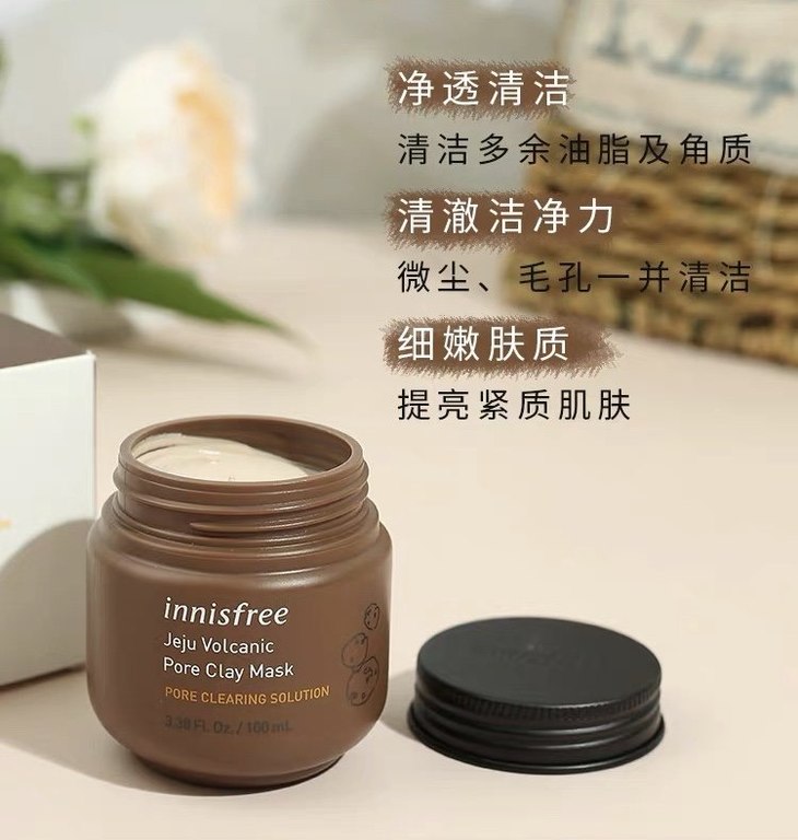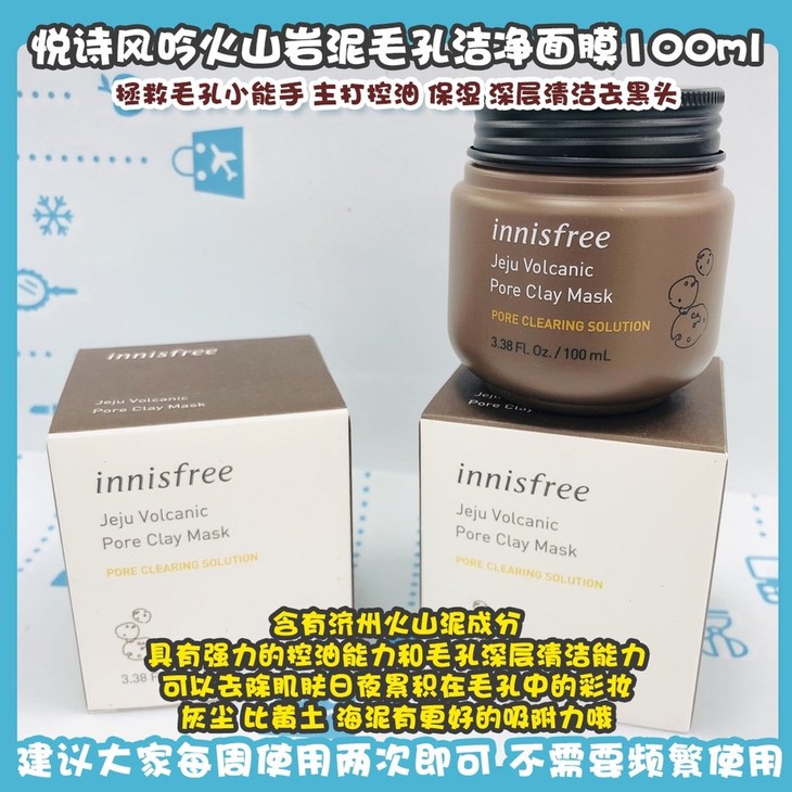 悦诗风吟火山岩泥毛孔洁净面膜100ml(2019年新版)👍拯救毛孔小能手😉,主打控油➕保湿➕深层清洁去黑头。含有济州火山泥成分🌋,具有强力的控油能力和毛孔深层清洁能力♻。可以去除肌肤日夜累积在毛孔中的彩妆、灰尘🌬,比黄土、海泥有更好的吸附力哦👏。非常适合皮肤粗糙、暗黄、角质厚、毛孔粗大、偏油和油黑头的MM。🌟建议大家每周使用两次即可,不需要频繁使用!