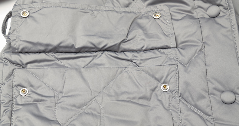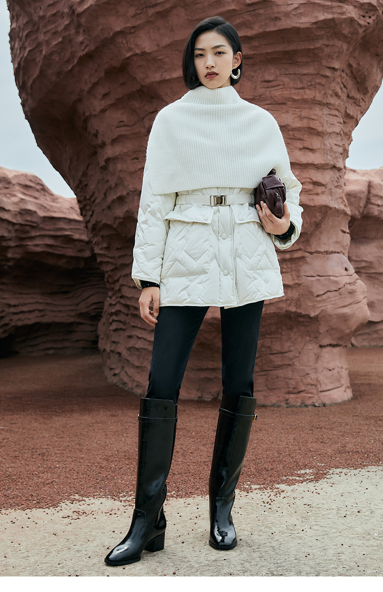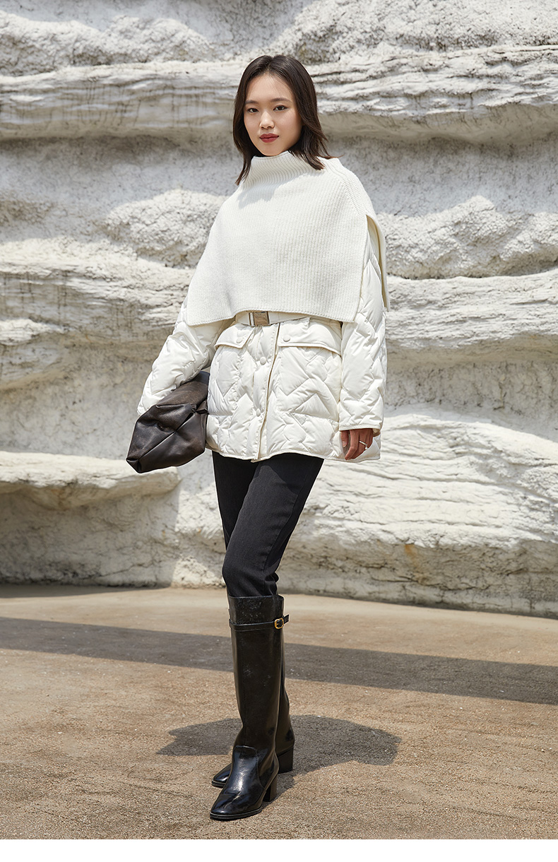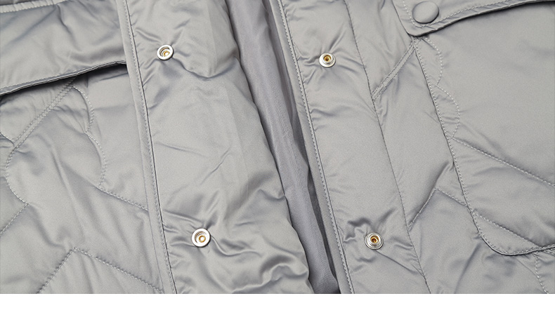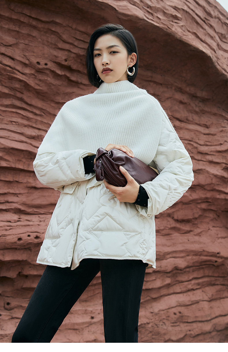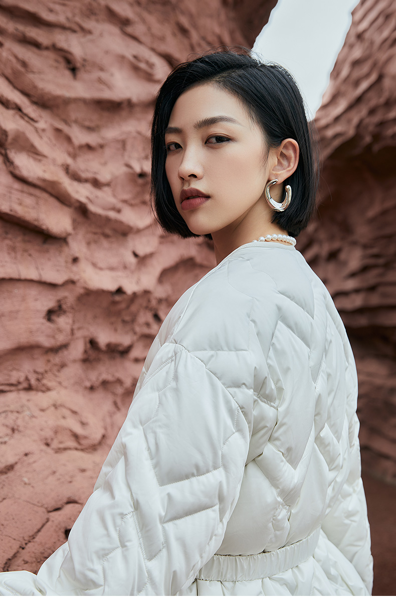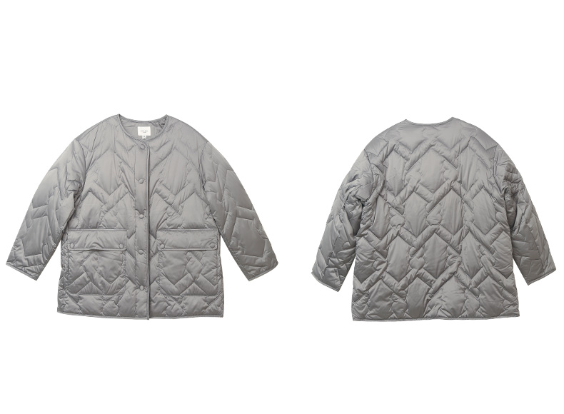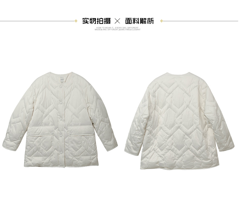 奶白色菱形格纹中长款棉服 圆领单排扣大口袋外套 简约通勤风秋冬宽松保暖轻薄羽绒服