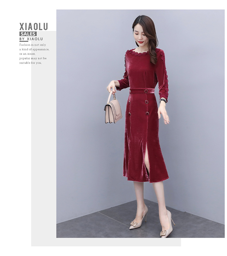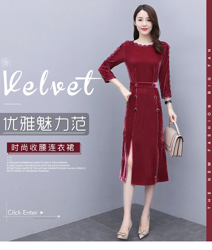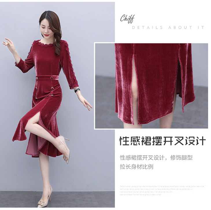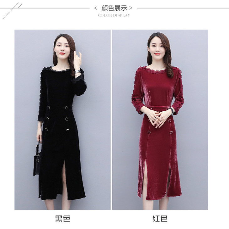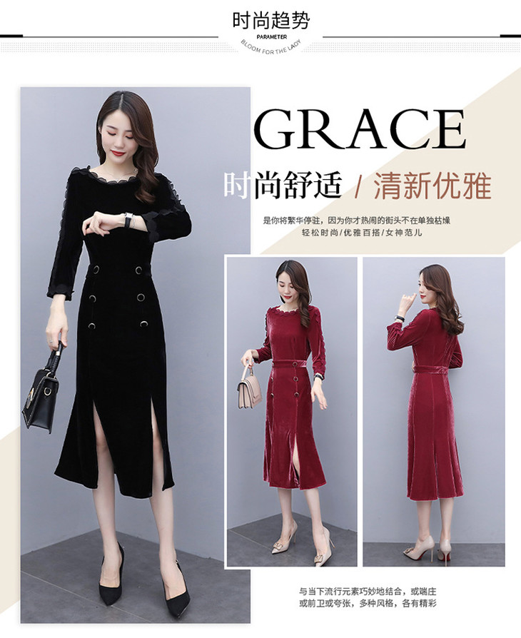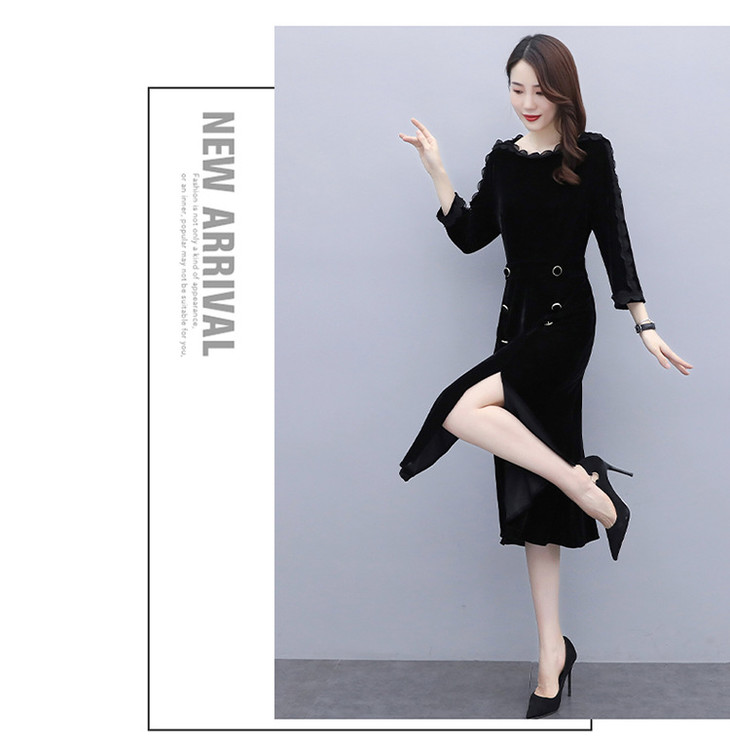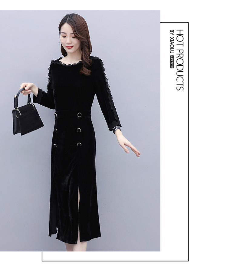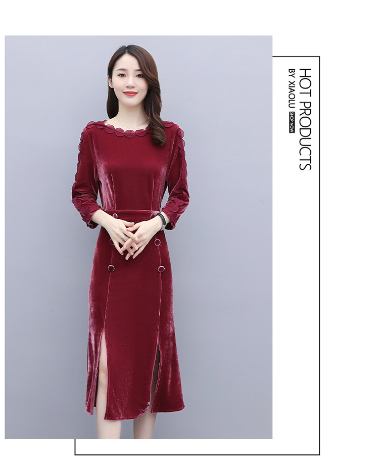 HRFS-WY61299新款时尚优雅气质修身圆领长袖中长款金丝绒开叉连衣裙
