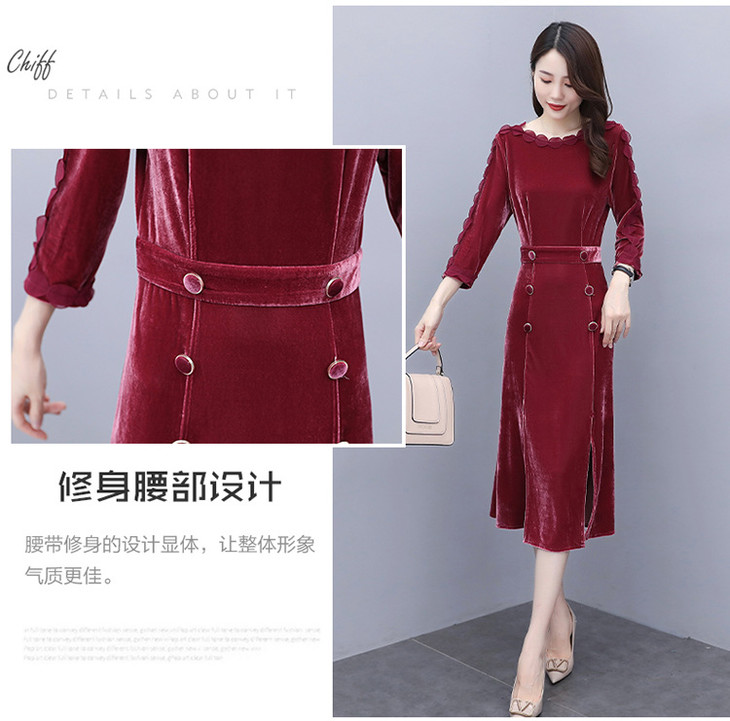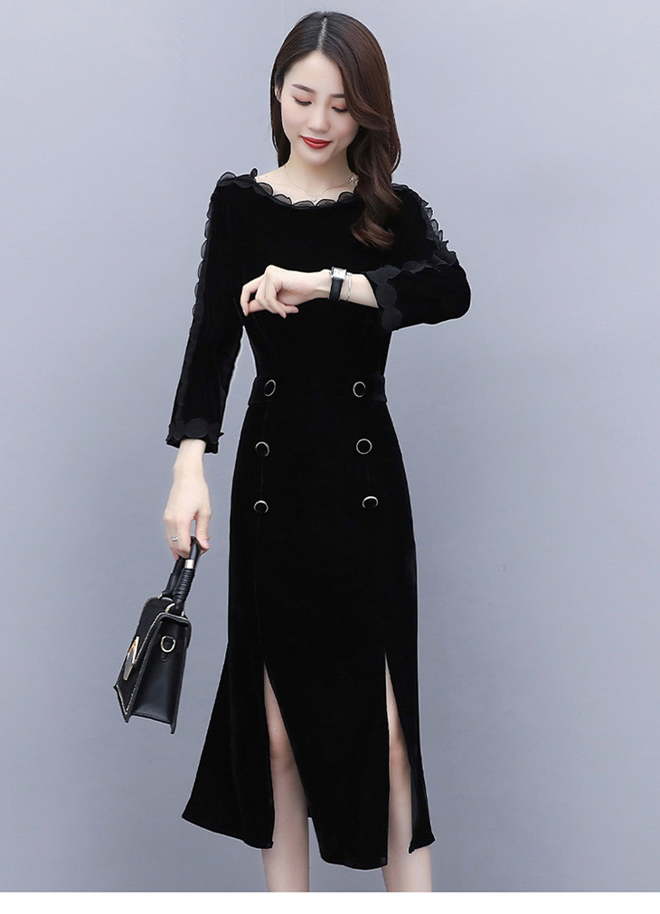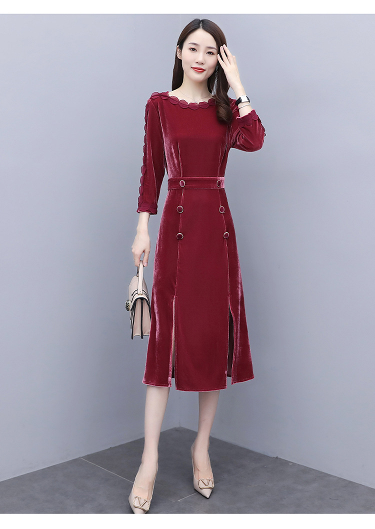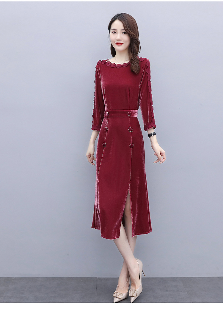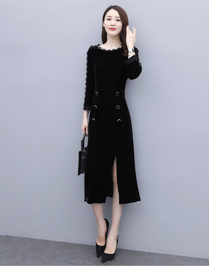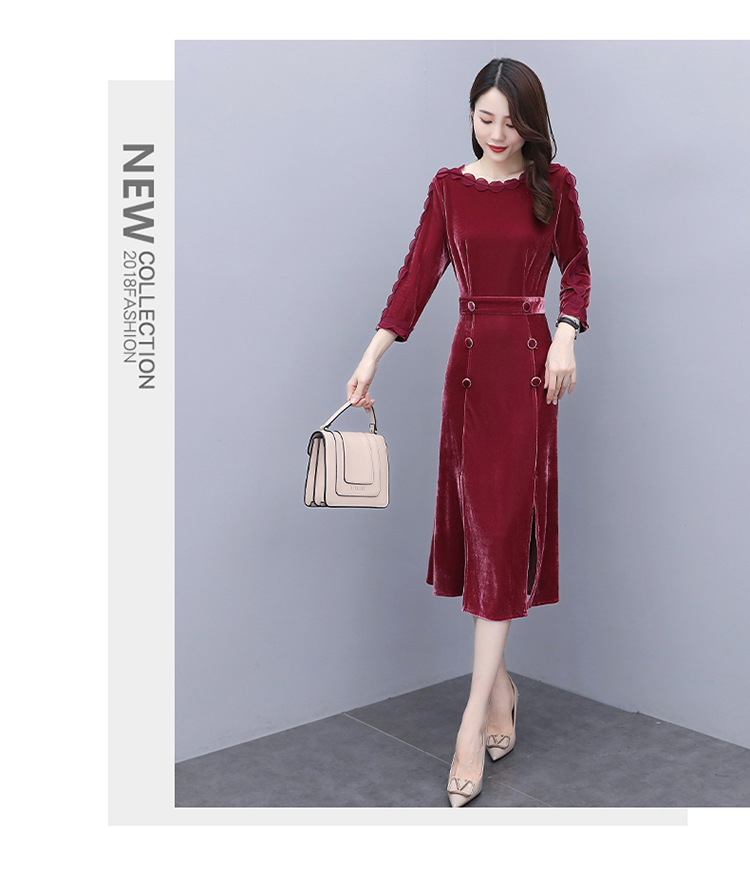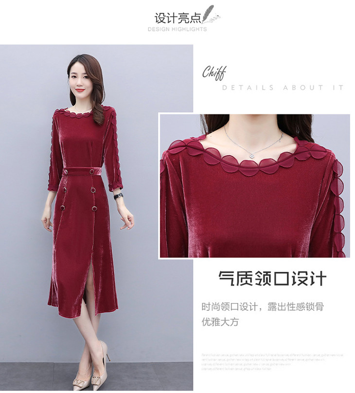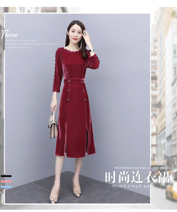 HRFS-WY61299新款时尚优雅气质修身圆领长袖中长款金丝绒开叉连衣裙
