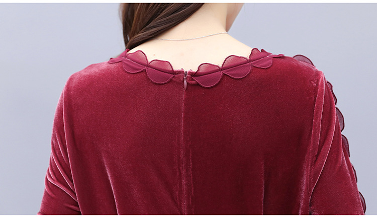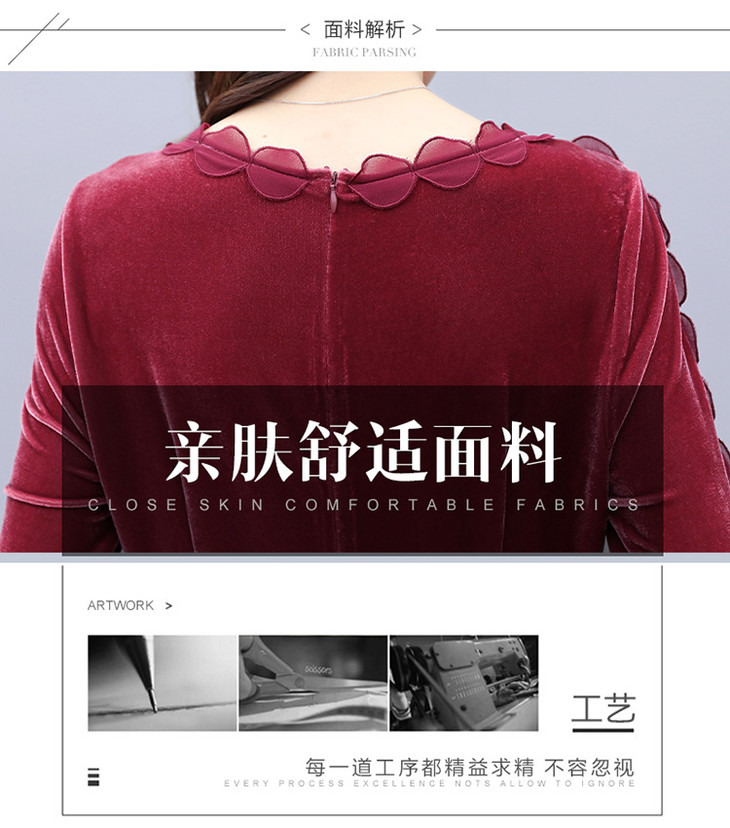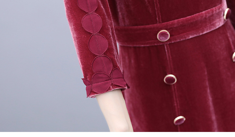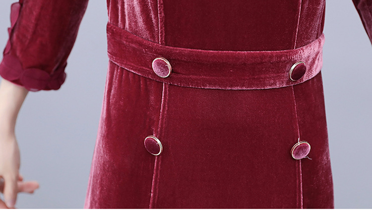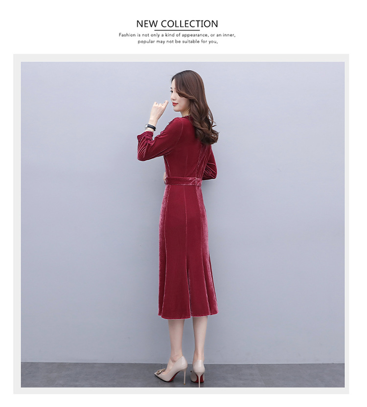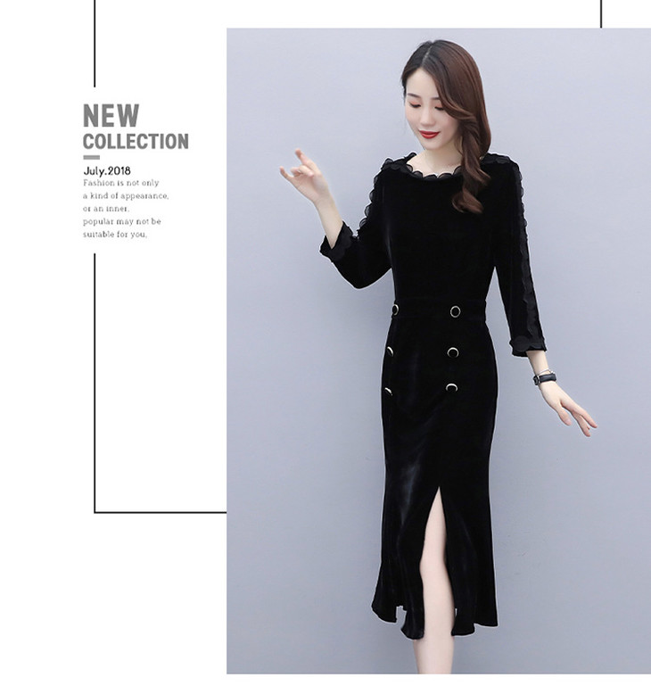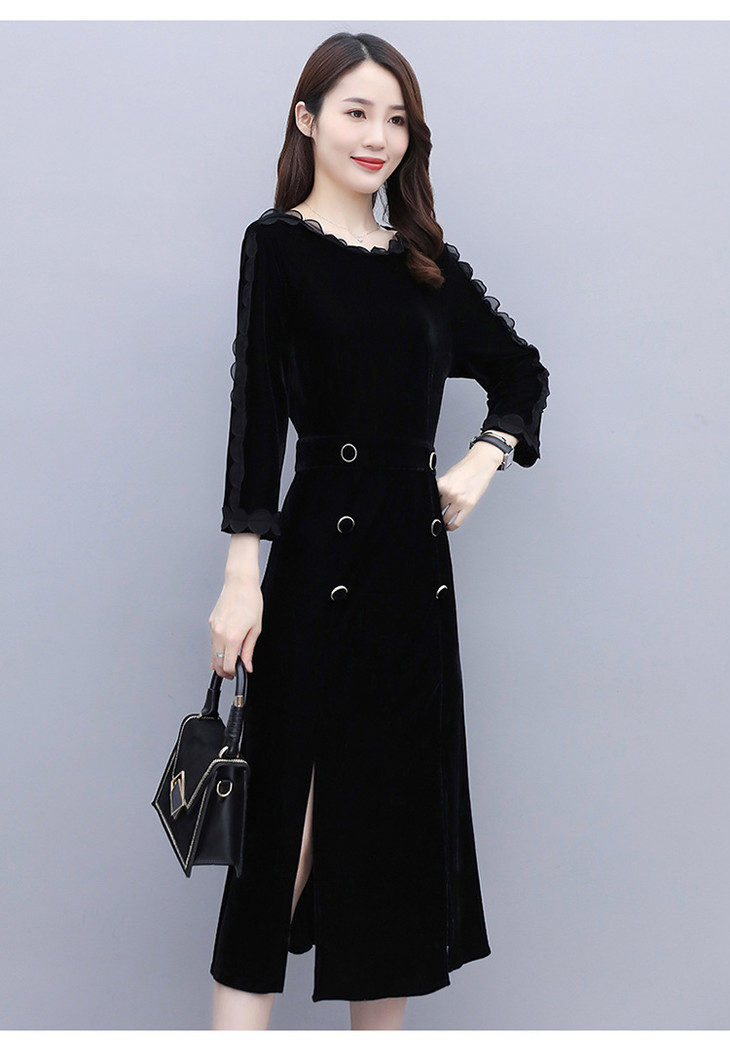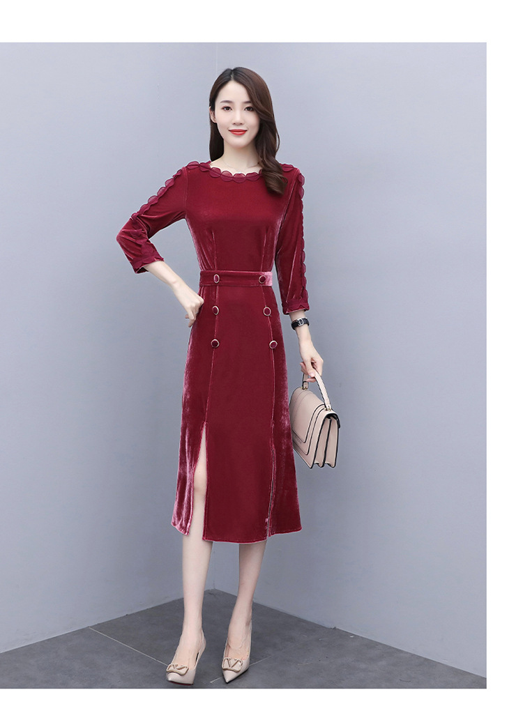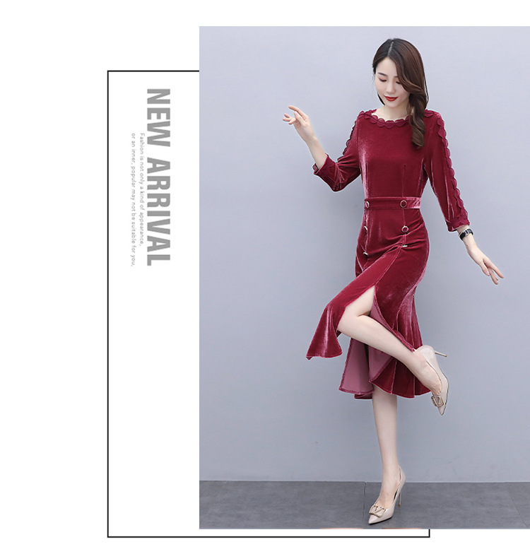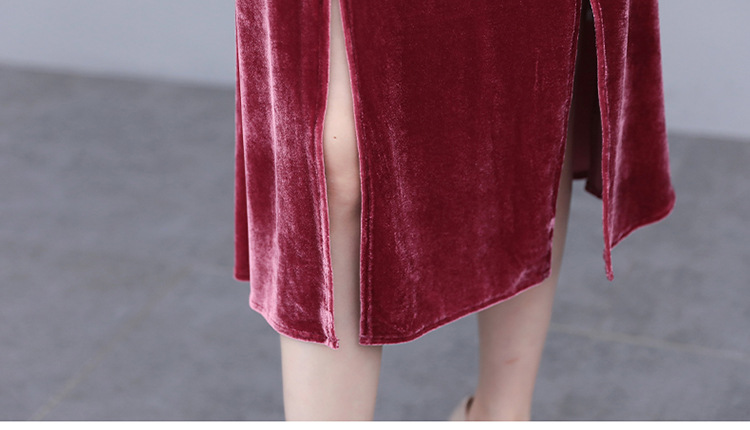HRFS-WY61299新款时尚优雅气质修身圆领长袖中长款金丝绒开叉连衣裙