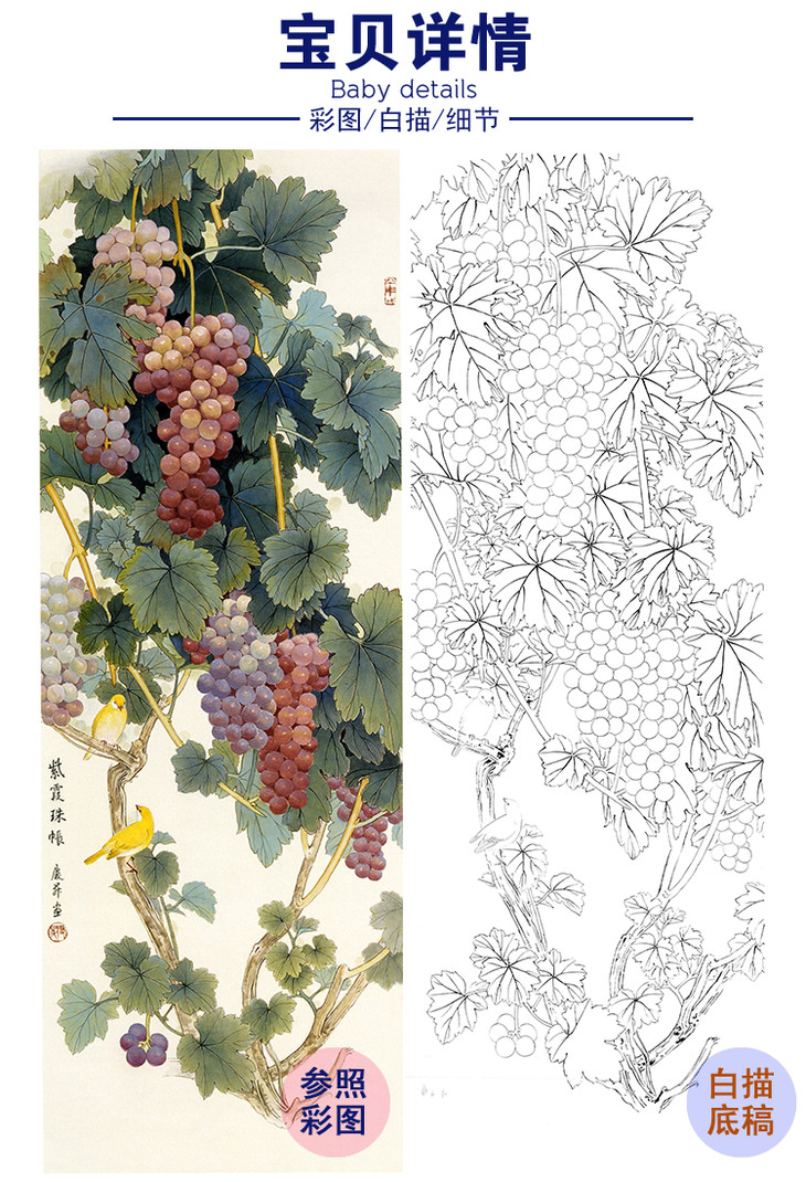 竖幅条屏工笔花鸟白描底稿-葡萄-王庆升水果对屏之一-RT11