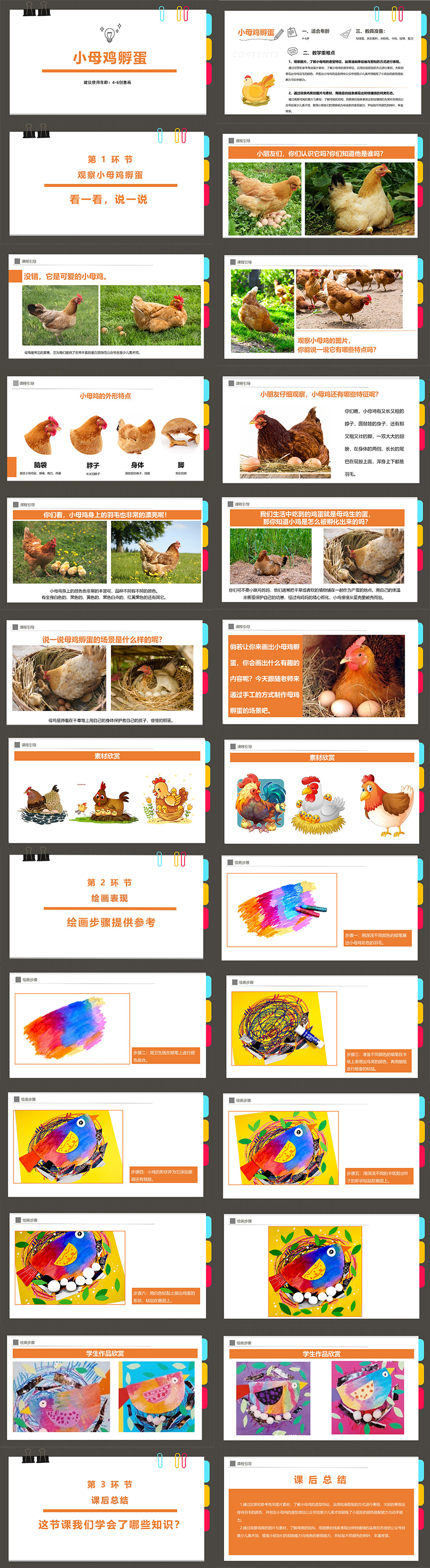 1、观察图片,了解小母鸡的造型特征,运用油画棒绘画与剪贴的方式进行表现。