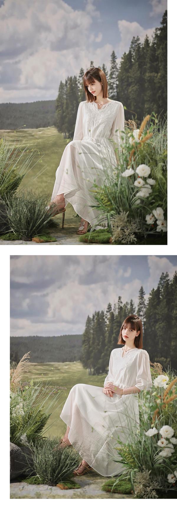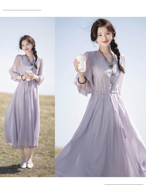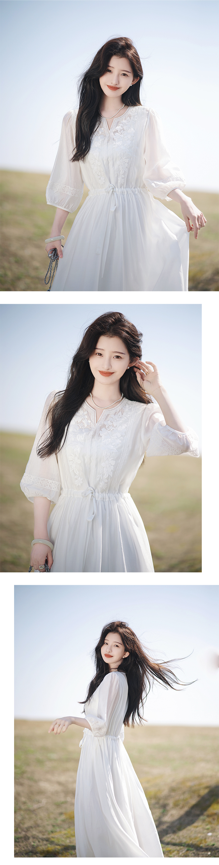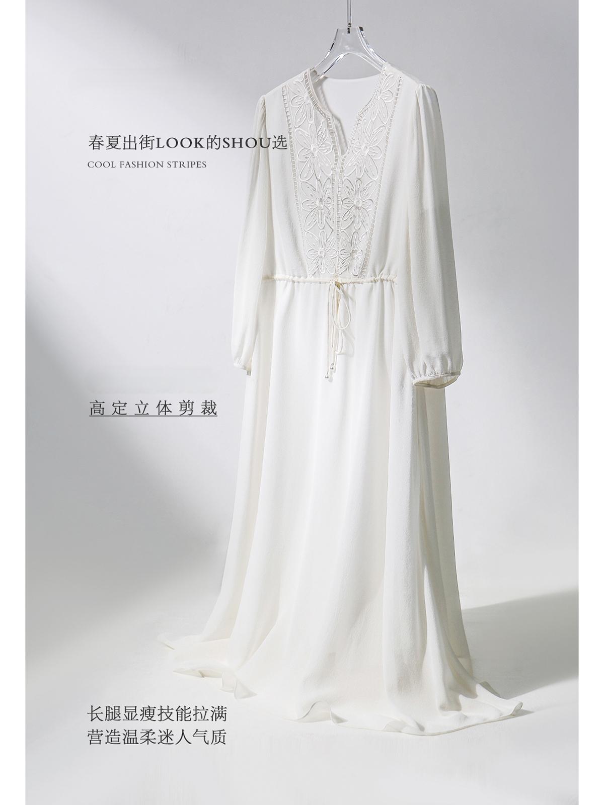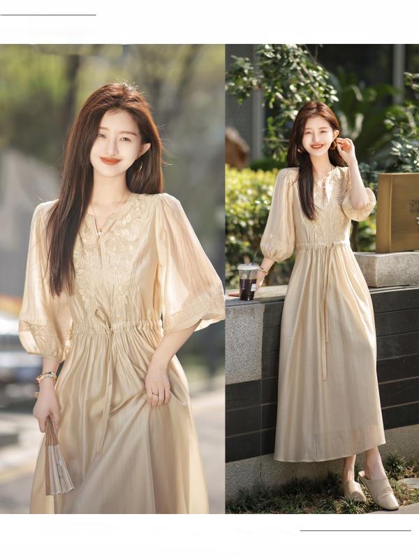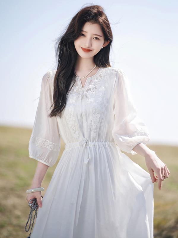 【轻奢】2024夏季 维多利亚仙女风刺绣裙 2款可选 天丝飘逸连衣裙 天丝刺绣小V领腰带连衣裙