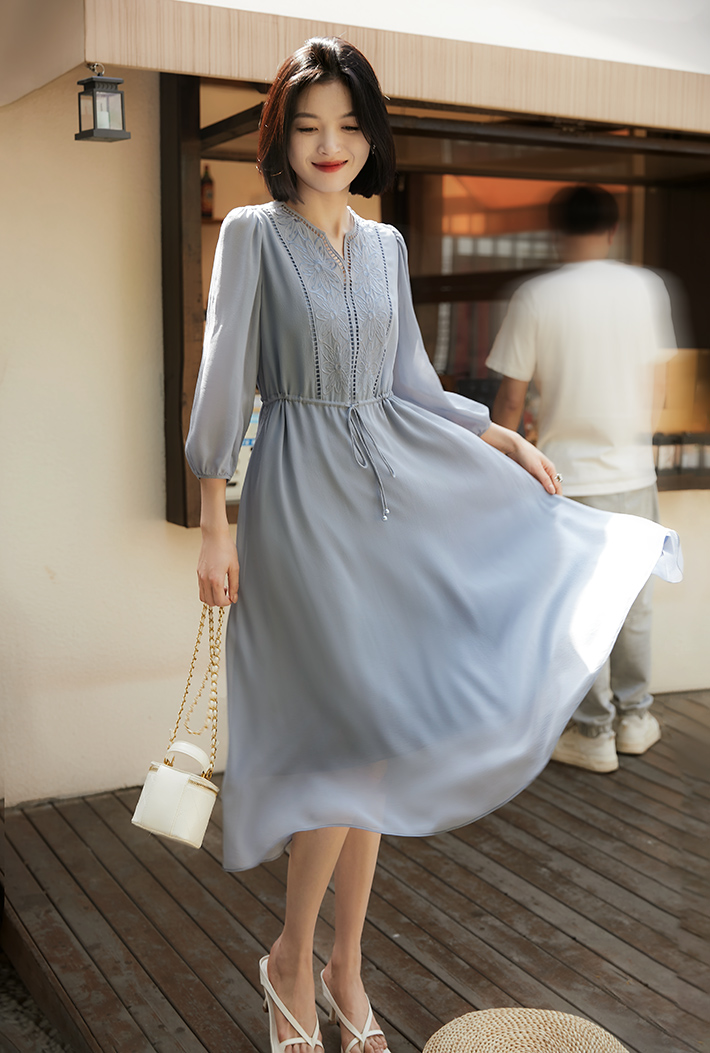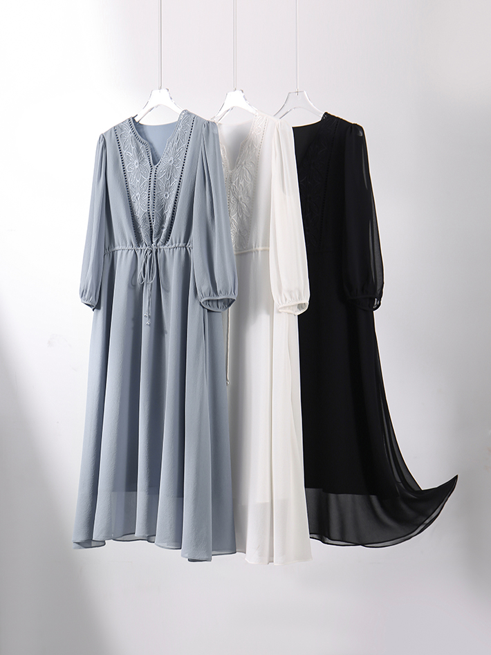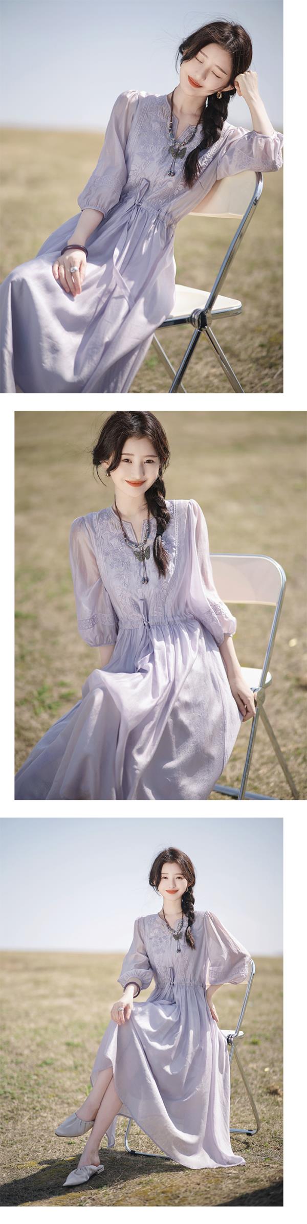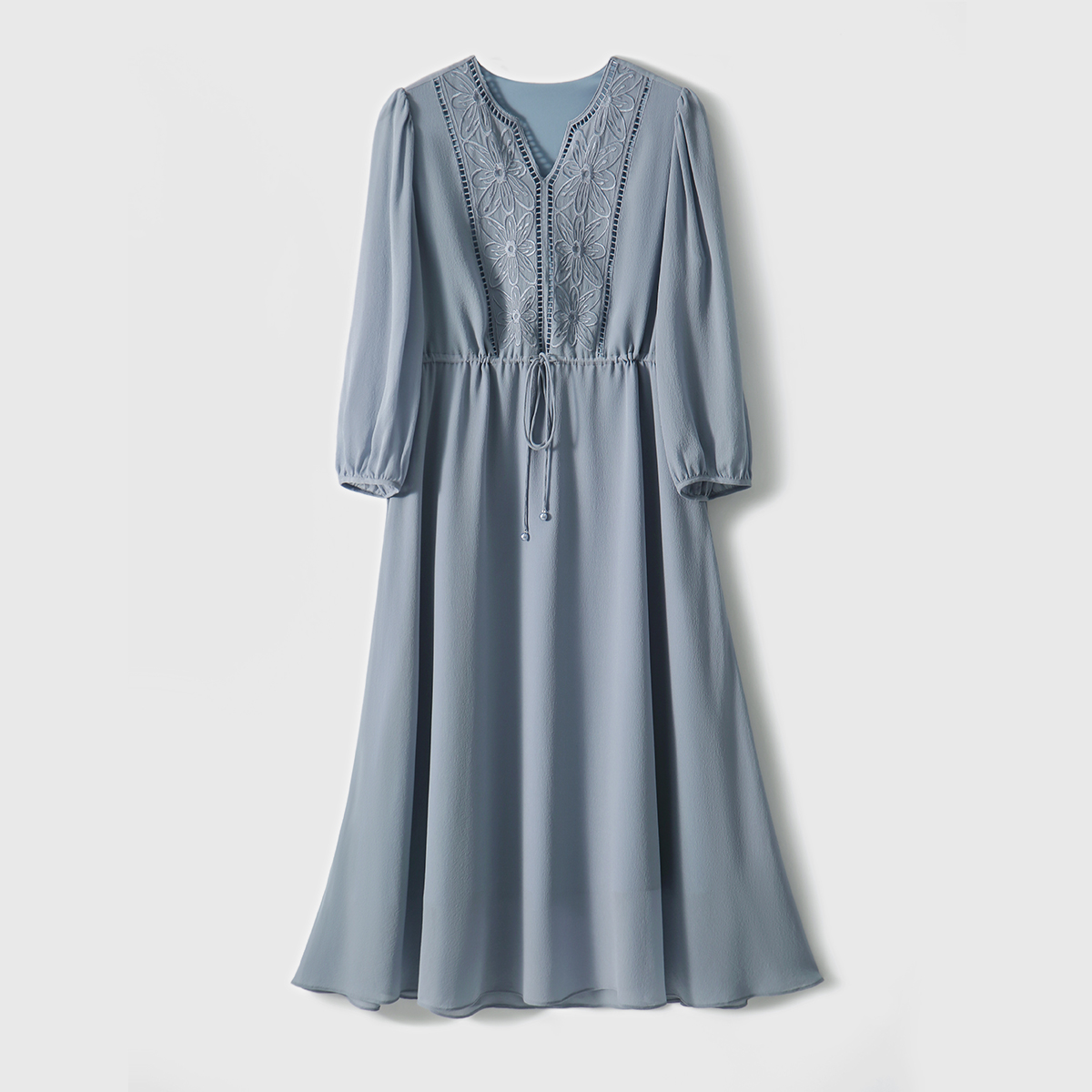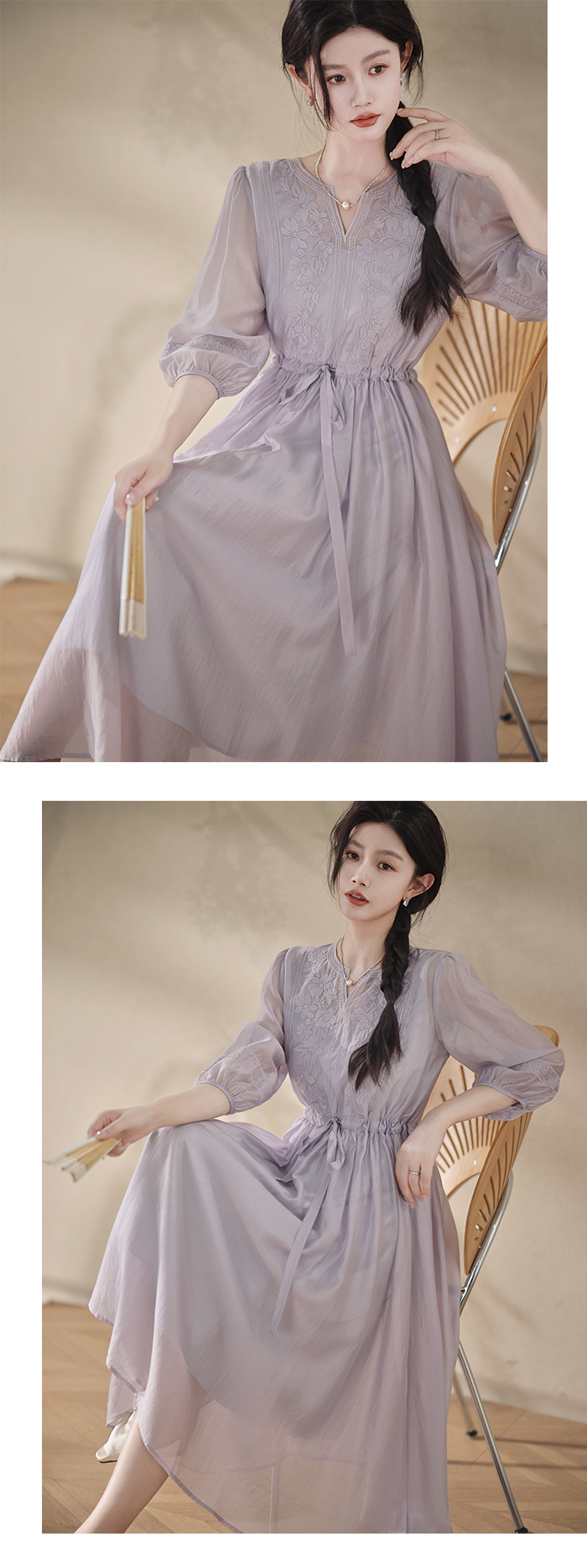 天丝刺绣小V领腰带连衣裙(两件套)2915