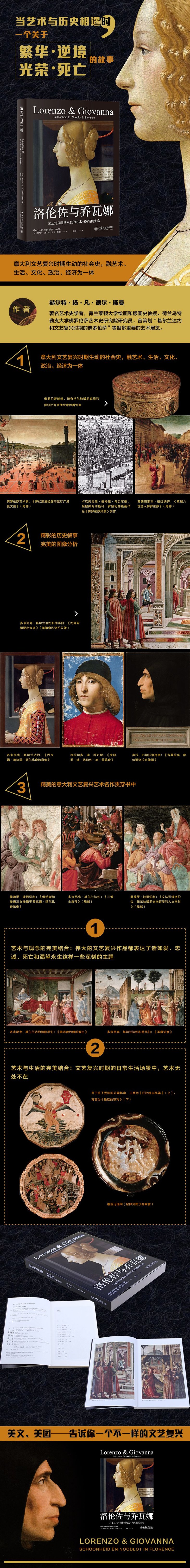 二人家族档案中未曾公开的文件(传记、账本、公证事件、财产清单记录、私人书信)使我们得以窥见他们的日常生活,而同时代的作家、艺术家献给他们诗歌和艺术作品则提供了他们对爱情、婚姻、生命、死亡和永生信念的见解。作者将文本文献和视觉资料紧密结合勾勒出这对夫妇的一生,展示了文艺复兴时期生活和艺术是如何完全交织在一起的——作为委托之作的波提切利和基尔兰达约等同时代艺术家作品在洛伦佐和乔瓦娜生活中具有举足轻重的地位,这些由著名艺术家或不太知名的艺术家所创作的作品都表达了诸如爱、忠诚、死亡和渴望永生这样一些深刻的主题,它们丰富的图像学细节可以使我们洞悉知识、艺术和宗教情感交织的复杂世界。意大利文艺复兴文化的基本特点也由此揭示:经济、政治、人文主义、宗教和艺术始终相互作用并具有同等重要的地位。