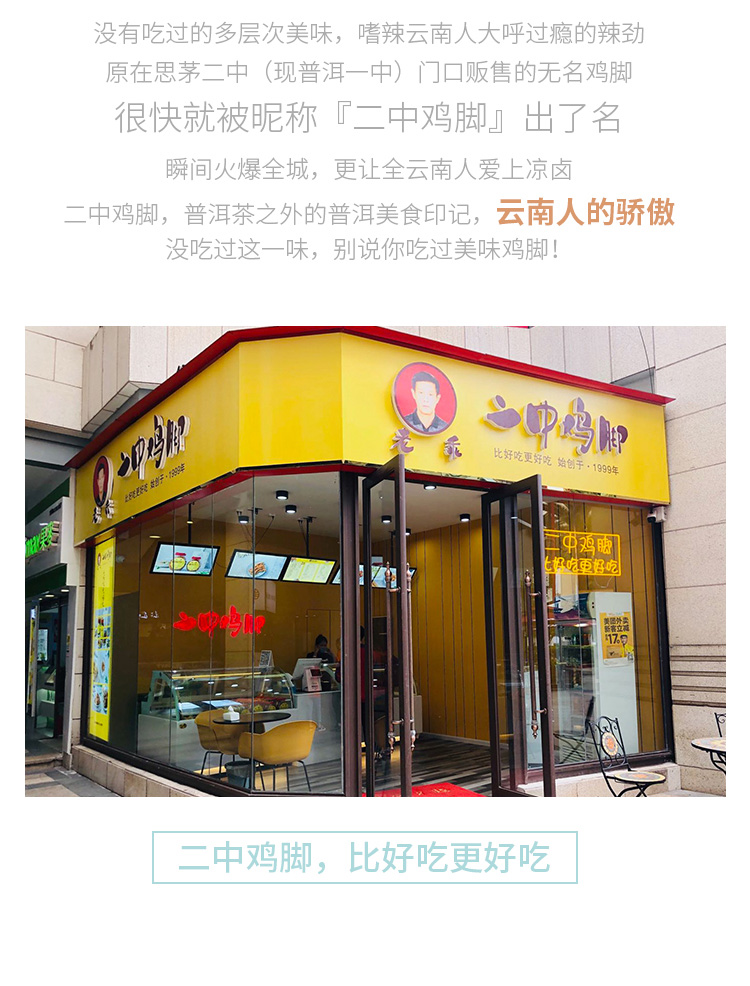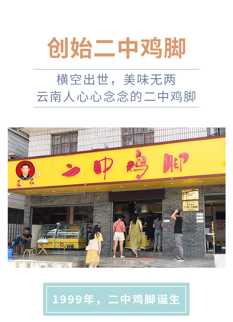- “二中鸡脚’’是云南普洱的苏建云&金建华夫妇于1999年在思茅二中(现普洱一中)门口售卖自家精心制作的私房鸡脚,因为美味独特让人食指大动而名声大噪,从而得名“二中鸡脚”(意为二中门口售卖的鸡脚)