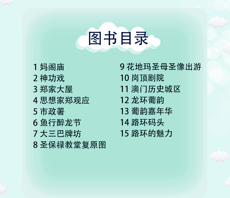 本书创作团队精心选材,将历史、建筑、人物、故事和文化五大元素以主题串联起来,使读者在趣味阅读中发现澳门之美。当中,既有重大历史事件,又有人物故事;既有文物建筑,又有非物质文化遗产;既有中华传统文化,又有西方文明;既有历史城区,又有离岛风貌……可谓绚丽多姿!