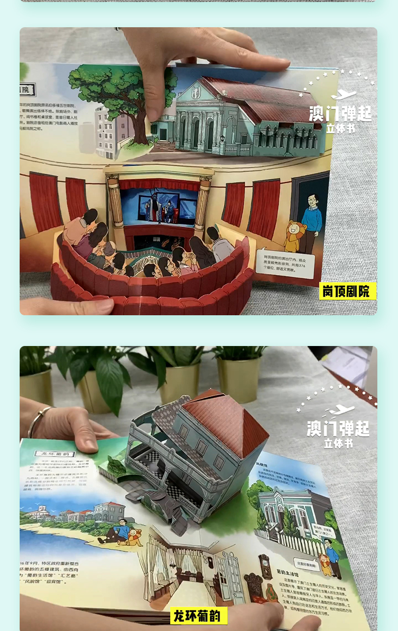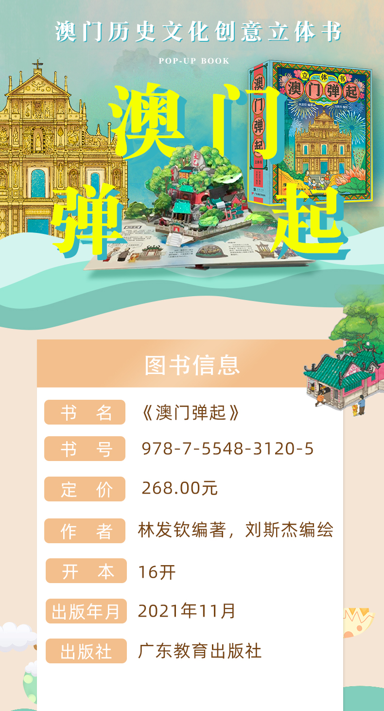 作为一本粤港澳三地团队联袂创作开发的立体书,《澳门弹起》由澳门著名历史文化学者林发钦撰文、香港著名立体书设计师刘斯杰实地写生手绘设计、全国百佳图书出版单位广东教育出版社出版。本书以澳门著名人文景观为主线,梳理其中的历史、建筑、人物、故事等元素,有文物建筑、非物质文化遗产还有澳门特有的文化风情,用文字、插画和立体纸艺结构讲述澳门历史城区的前世今生,让读者在趣味阅读中发现澳门之美。