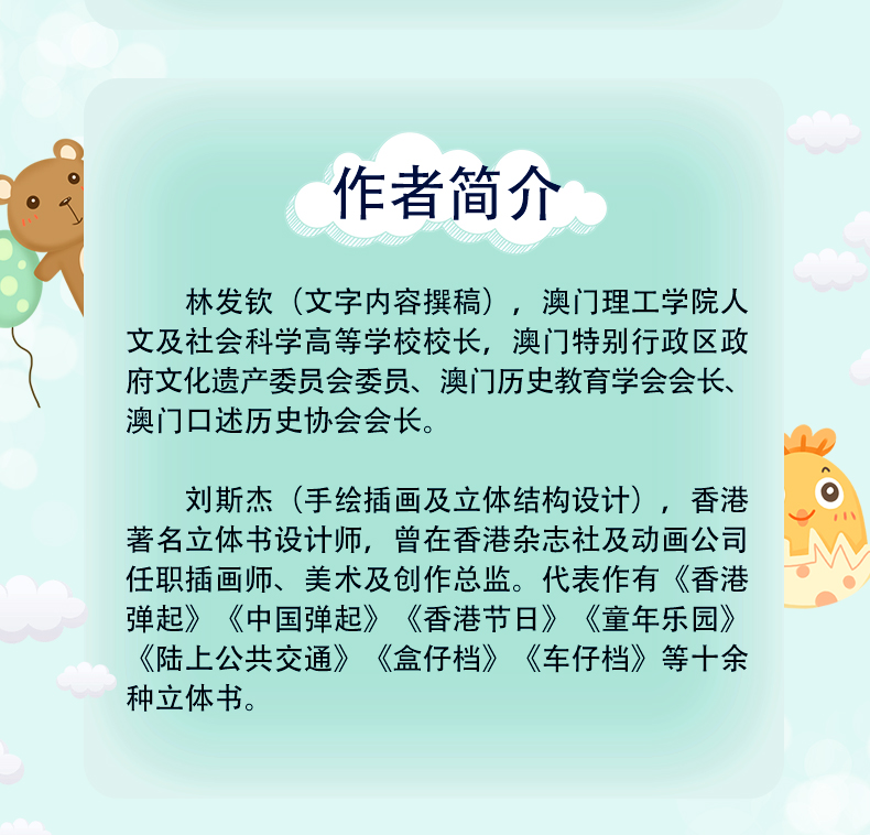 刘斯杰(手绘插画及立体结构设计),香港著名立体书设计师,曾在香港杂志社及动画公司任职插画师、美术及创作总监。代表作有《香港弹起》《中国弹起》《香港节日》《童年乐园》《陆上公共交通》《盒仔档》《车仔档》等十余种立体书。