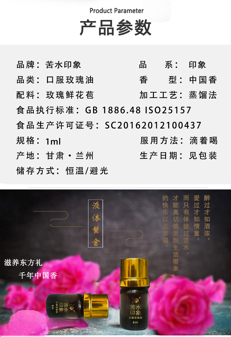 苦水印象牌口服玫瑰油1ml甘肃核心产区玫瑰蒸馏提取按摩护肤玫瑰纯精油