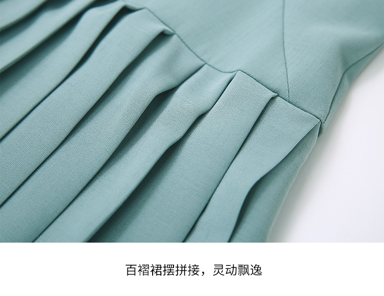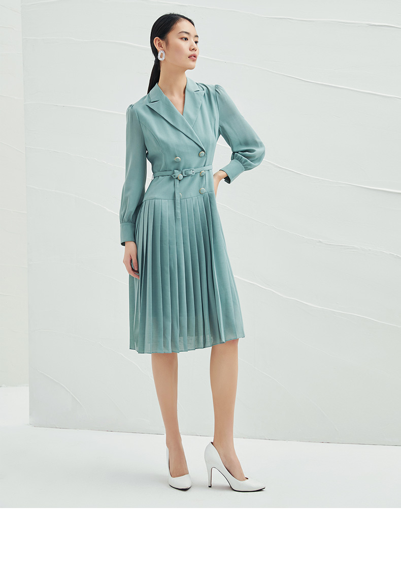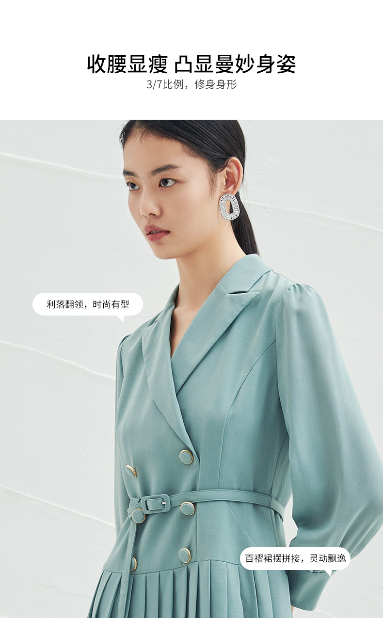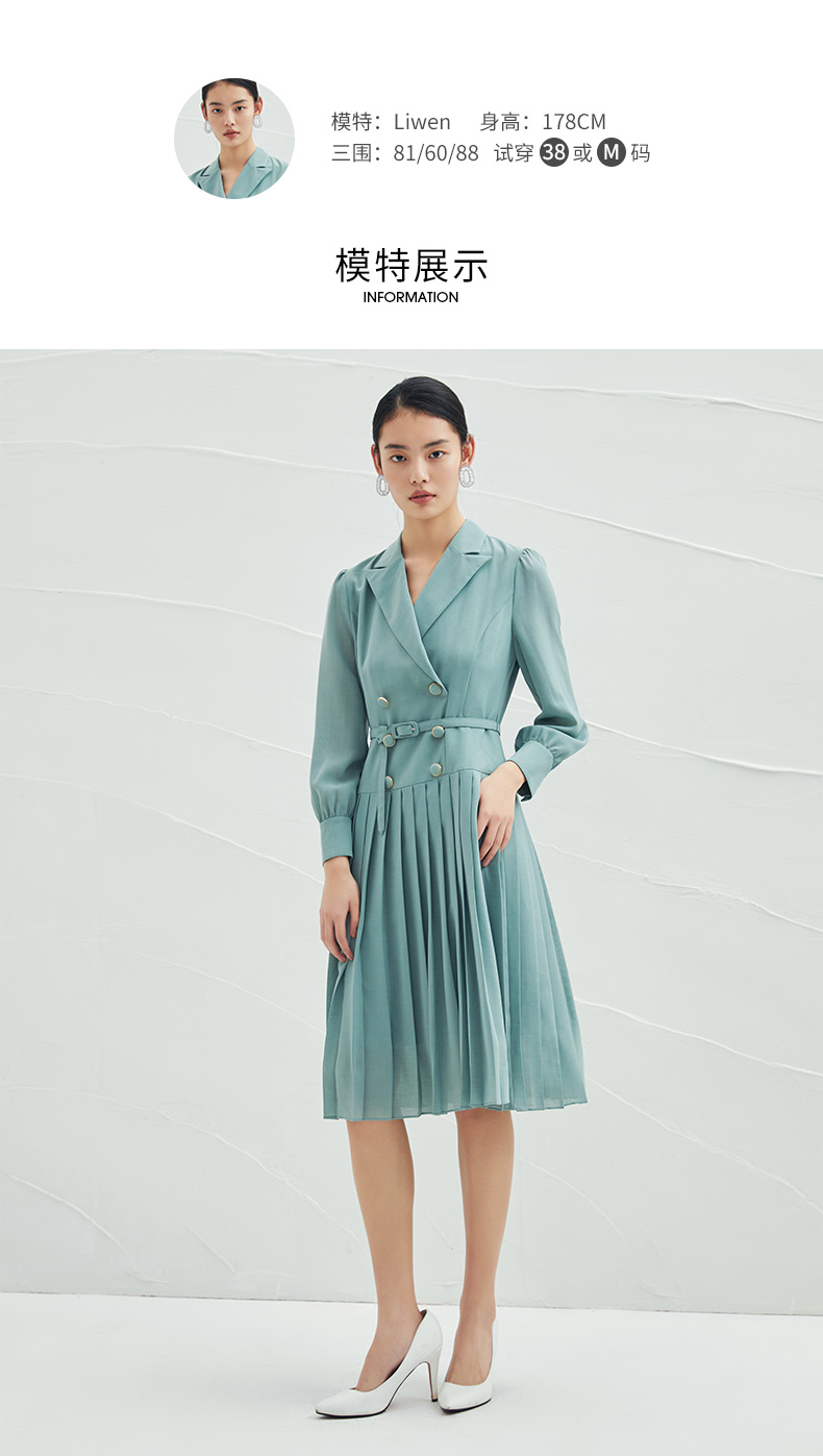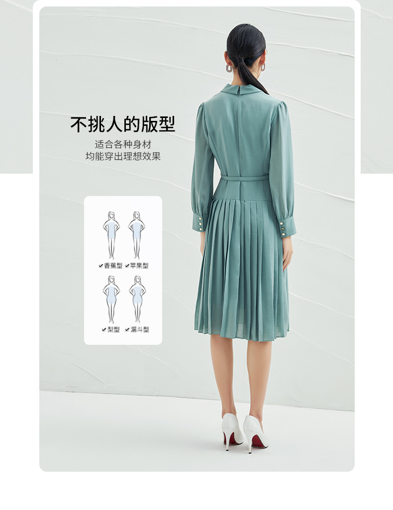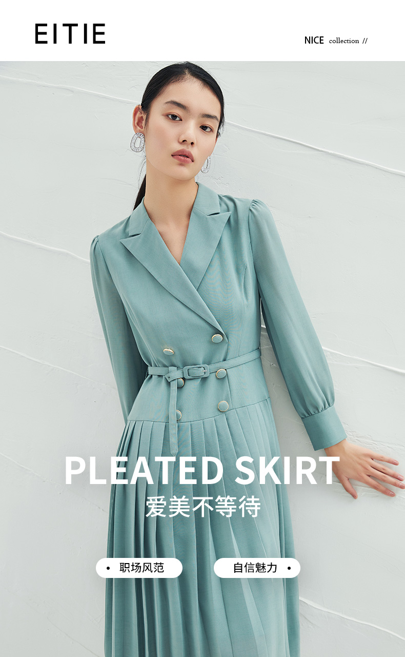 EITIE爱特爱春夏季女装V领简约长袖中裙修身褶皱连衣裙6507254