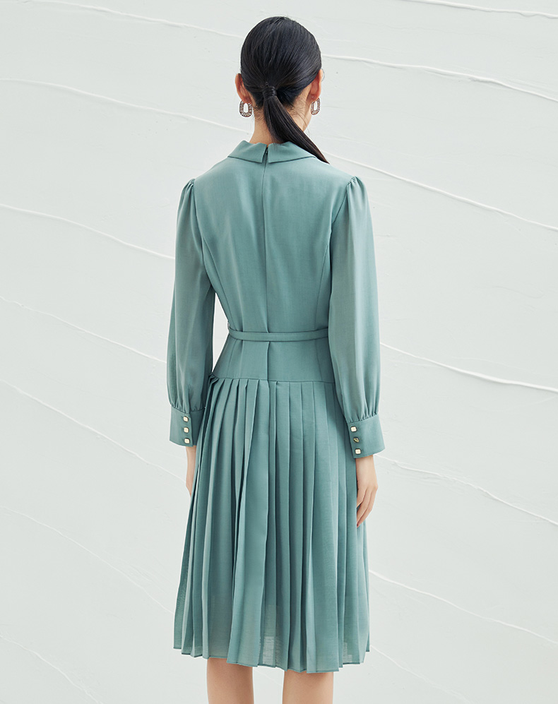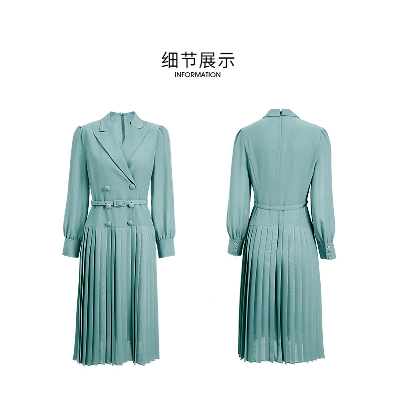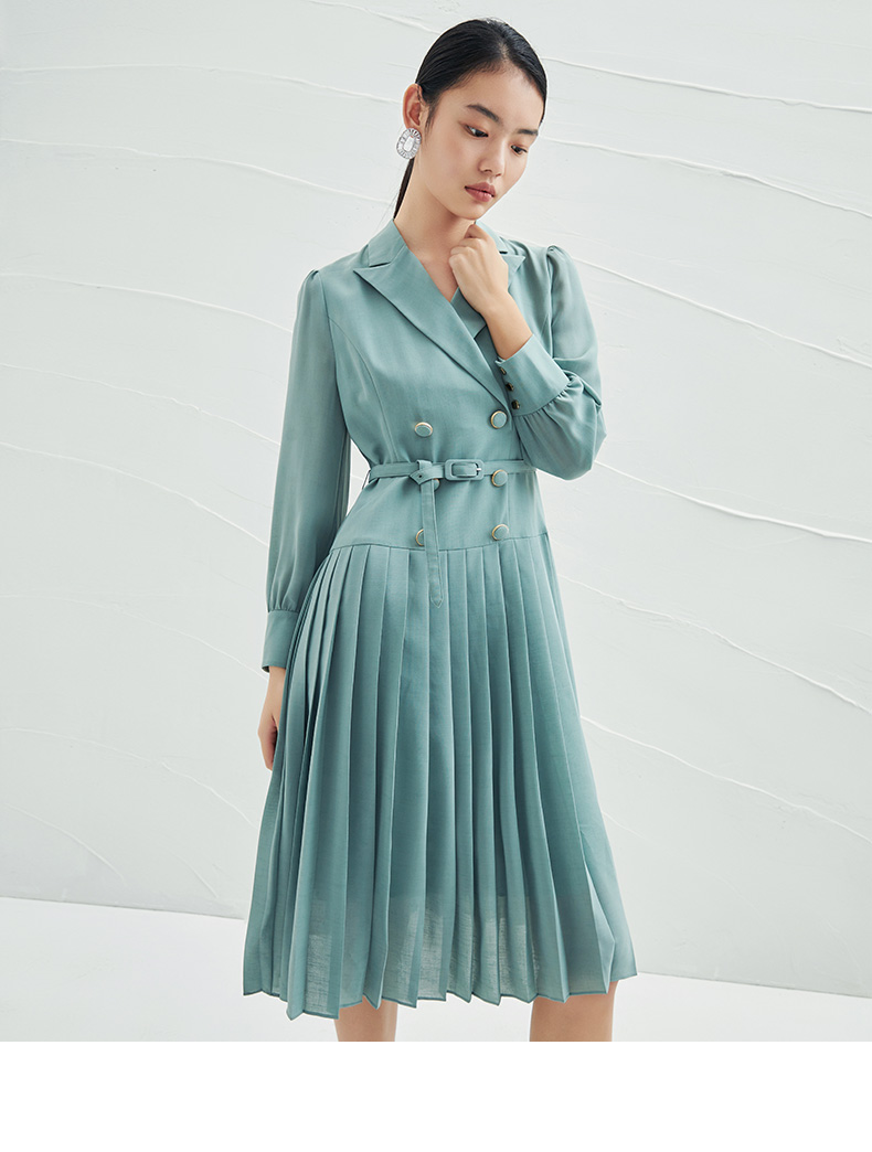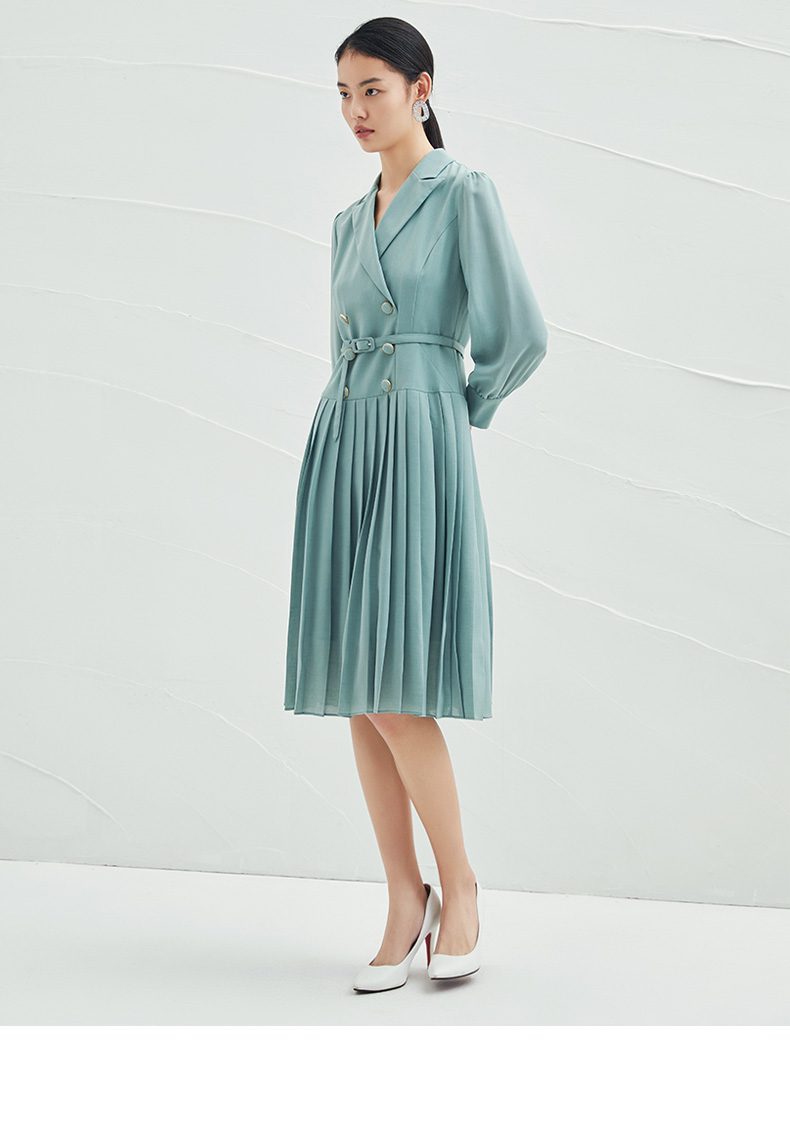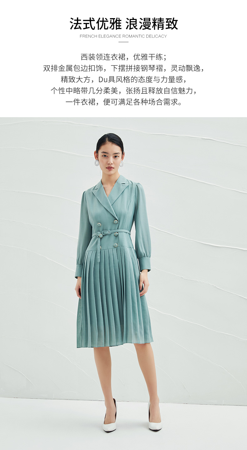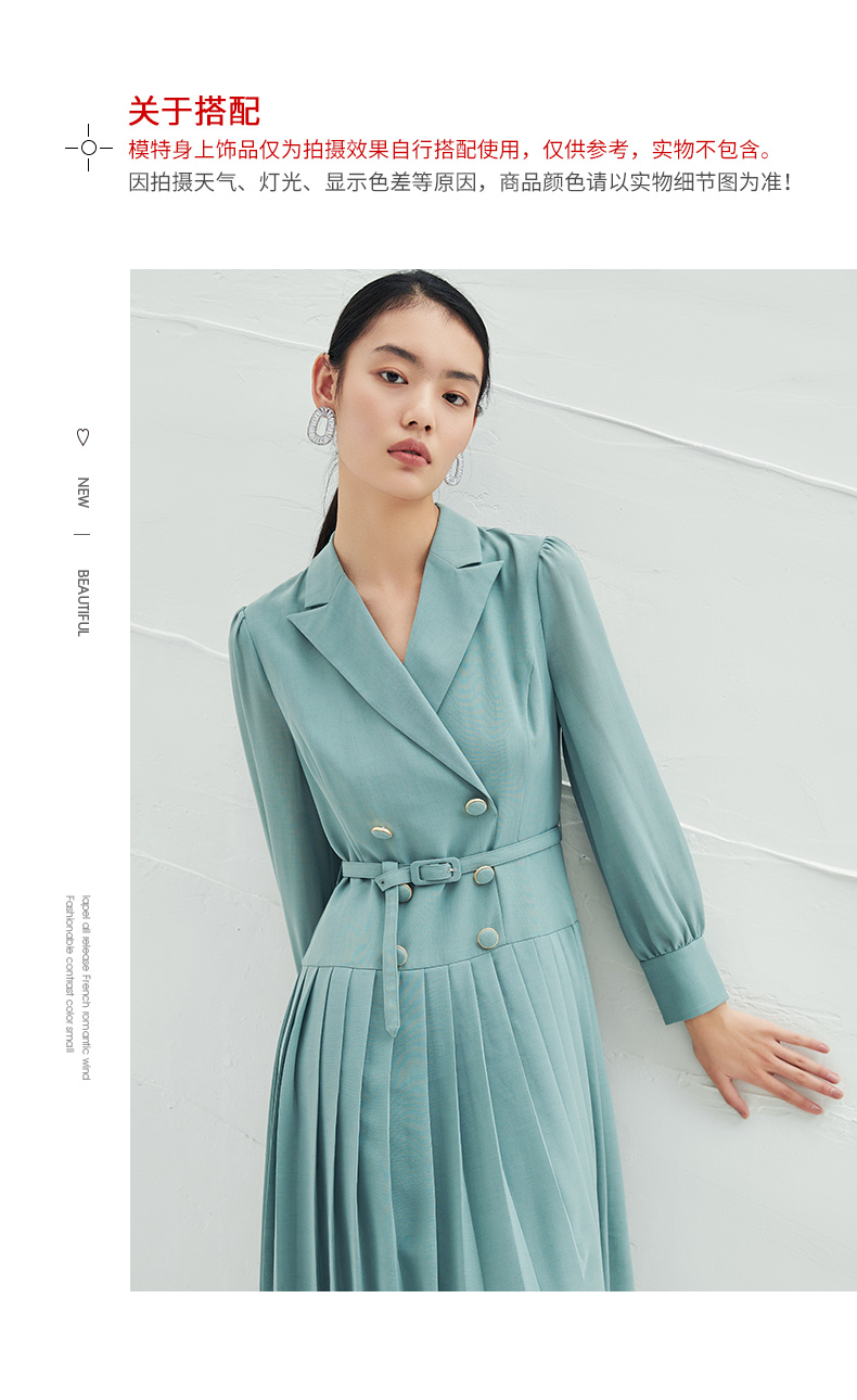 EITIE爱特爱春夏季女装V领简约长袖中裙修身褶皱连衣裙6507254