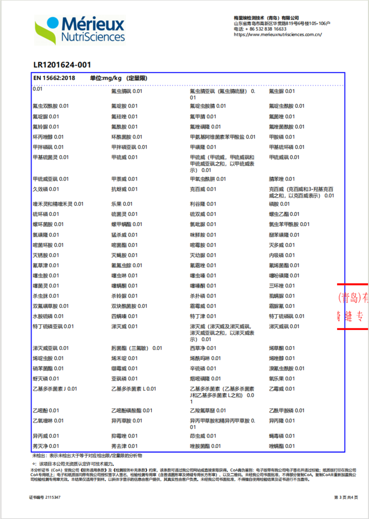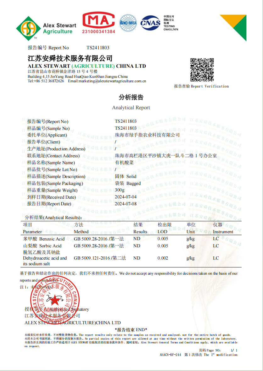 有机酸菜上架前,绿家也送检了第三方检测机构,检测了277项农残、亚硝酸盐以及总酸,农残和亚硝酸盐未检出,总酸也低于国标标准。