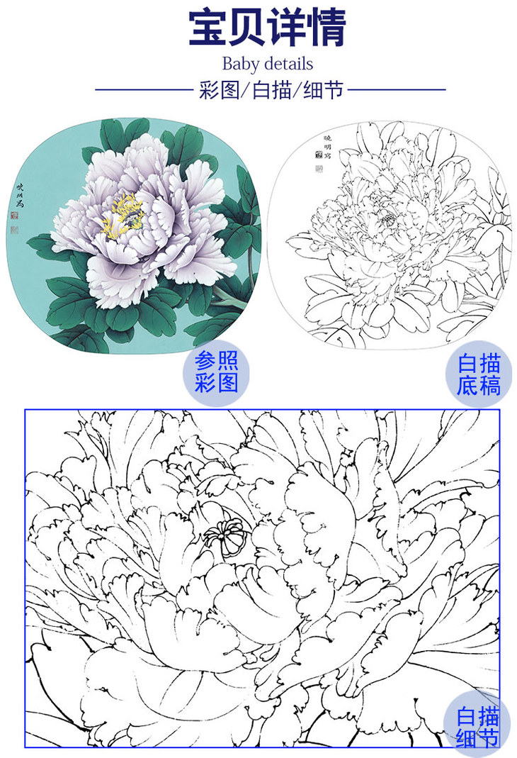 【大彩图】李晓明工笔画白描底稿斗方小品《牡丹灰文鸟》临摹勾线花鸟线稿KA10