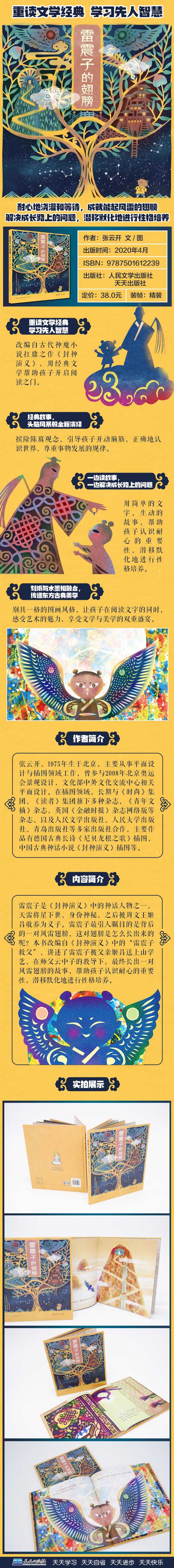 雷震子是《封神演义》中的神话人物之一,天雷将星下世,身份神秘,之后被周文王姬昌收养为义子。雷震子最引人瞩目的是背后的一对风雷翅膀,这对翅膀是怎么长出来的呢?本书改编自《封神演义》中的“雷震子救父”,讲述了雷震子被父亲姬昌送上山学艺,在师父云中子的教导下,最终长出一对风雷翅膀的故事,帮助孩子认识耐心的重要性,潜移默化地进行性格培养。