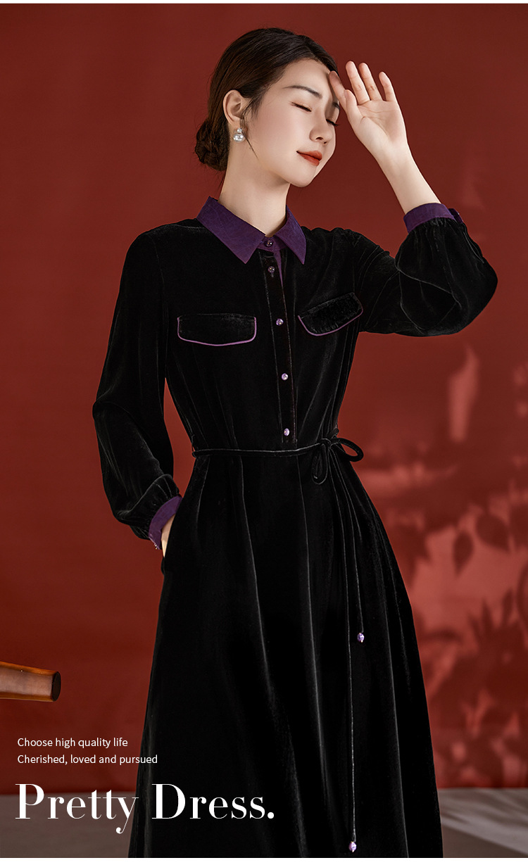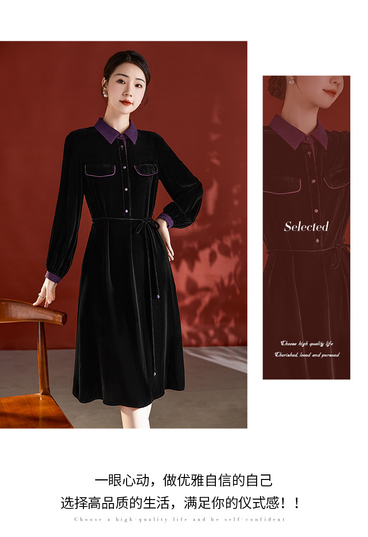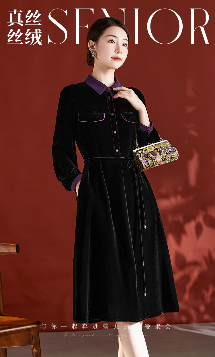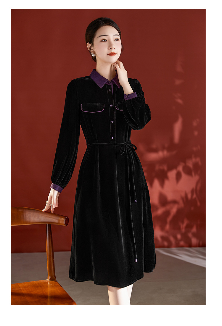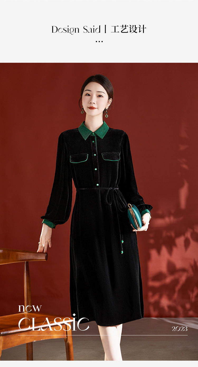 高贵气质时尚长袖,翻领真丝丝绒连衣裙SM-82395620