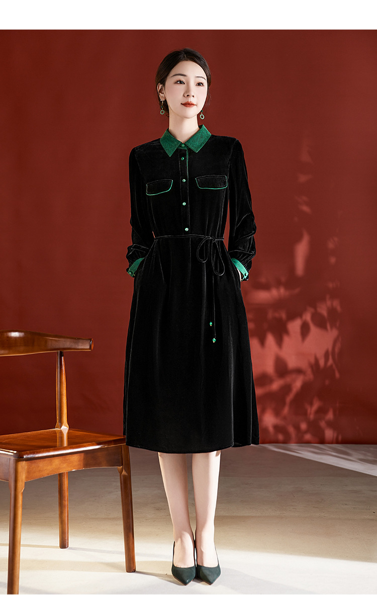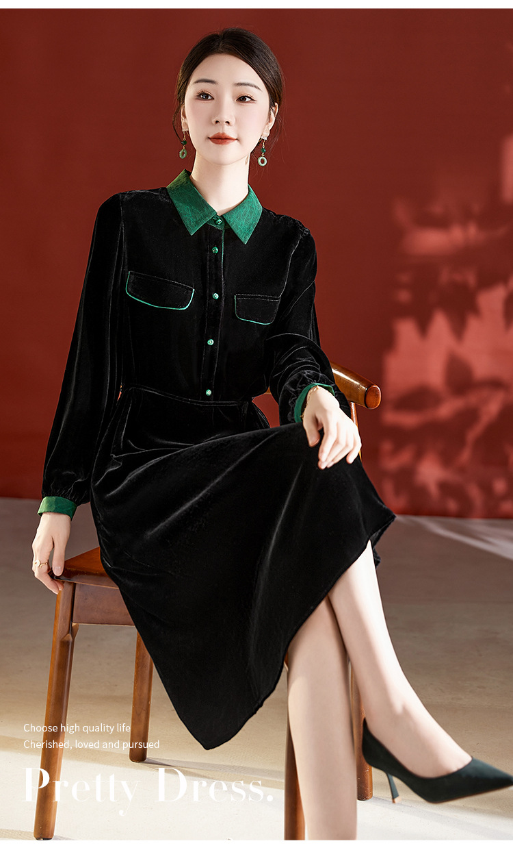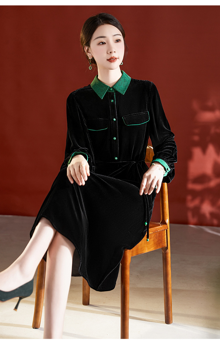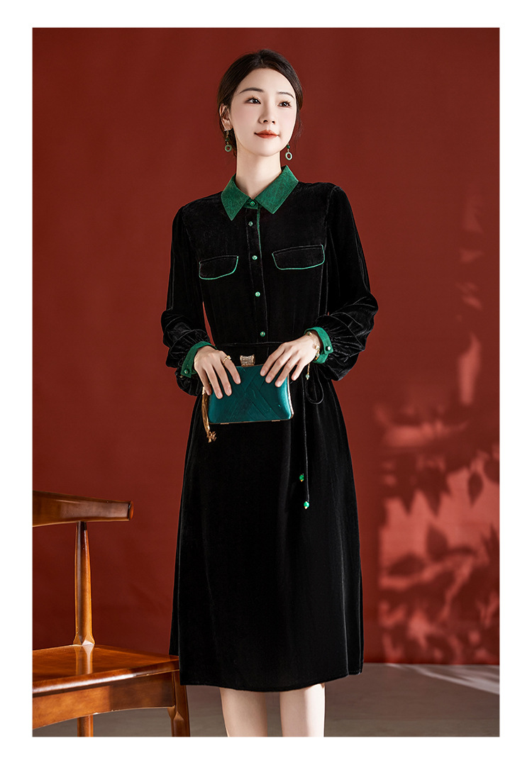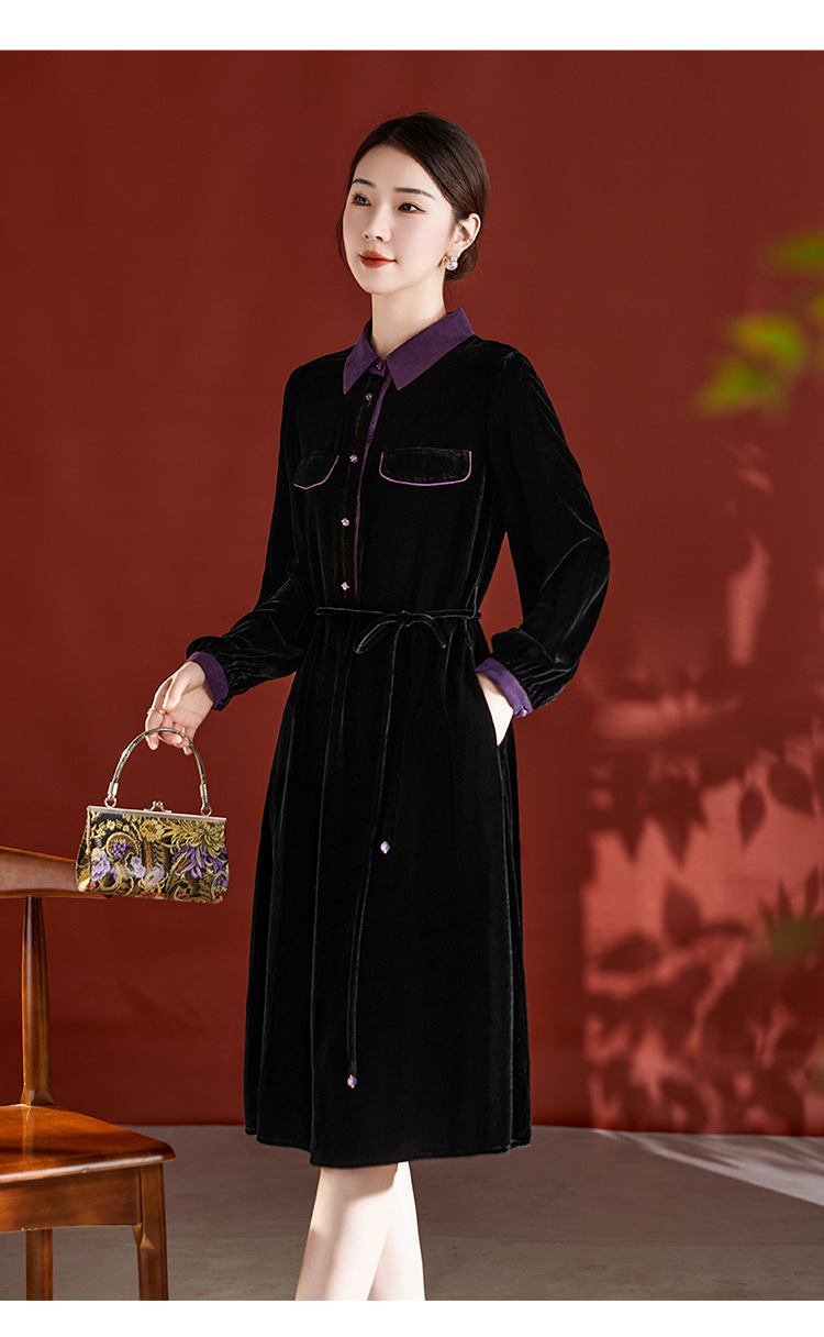 高贵气质时尚长袖,翻领真丝丝绒连衣裙SM-82395620