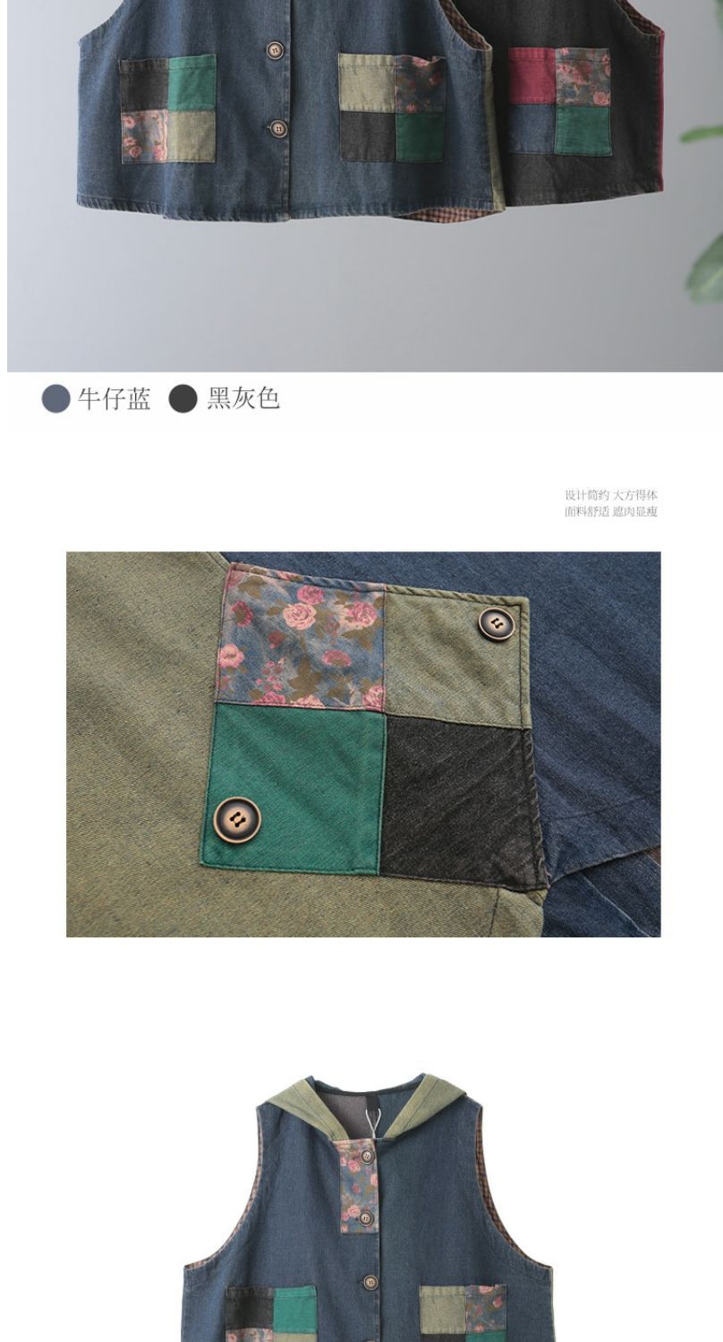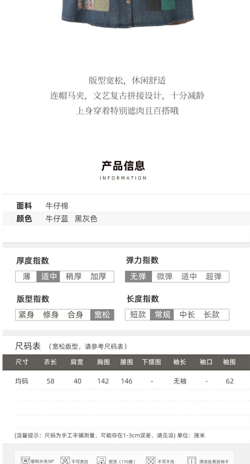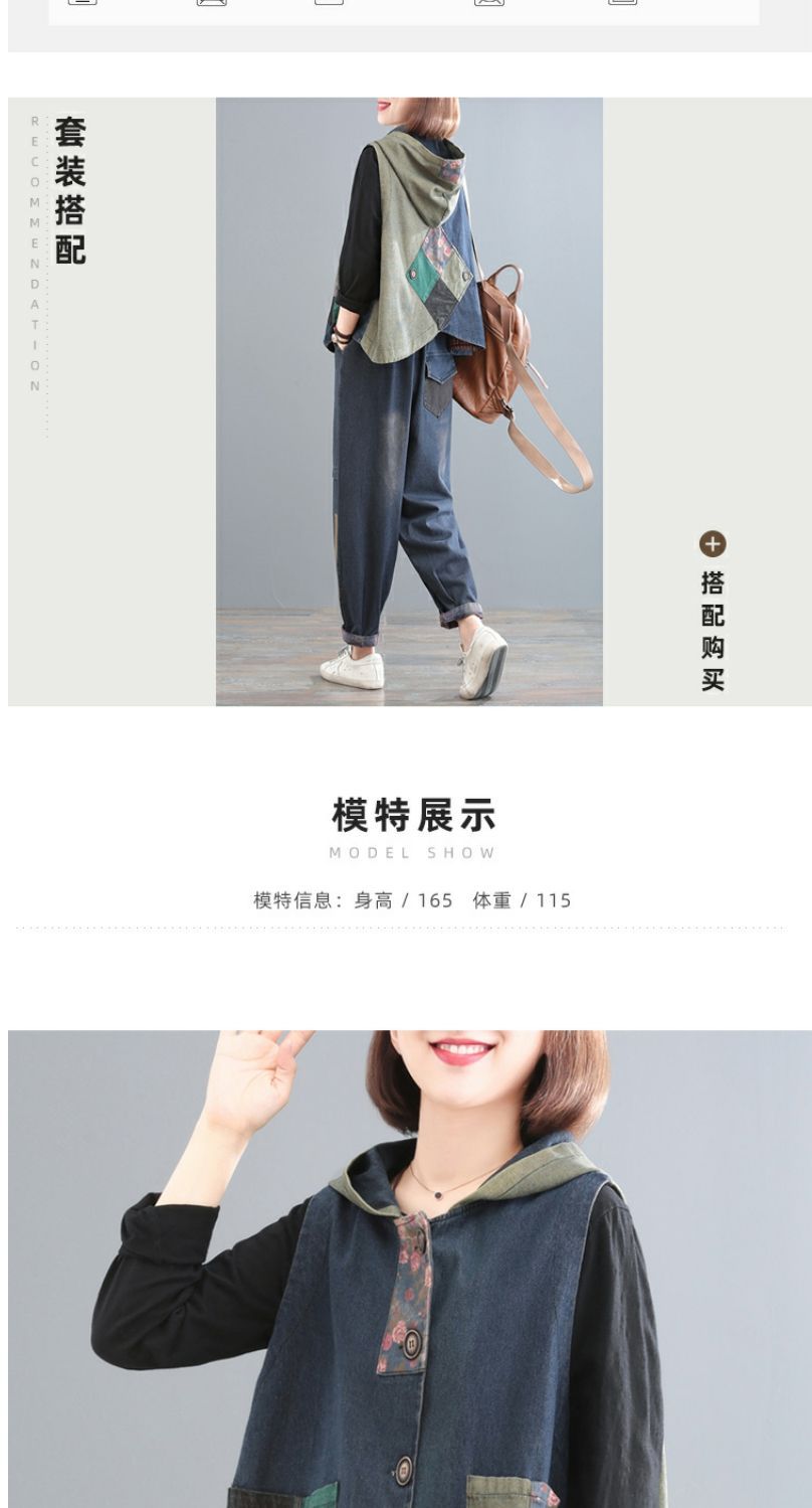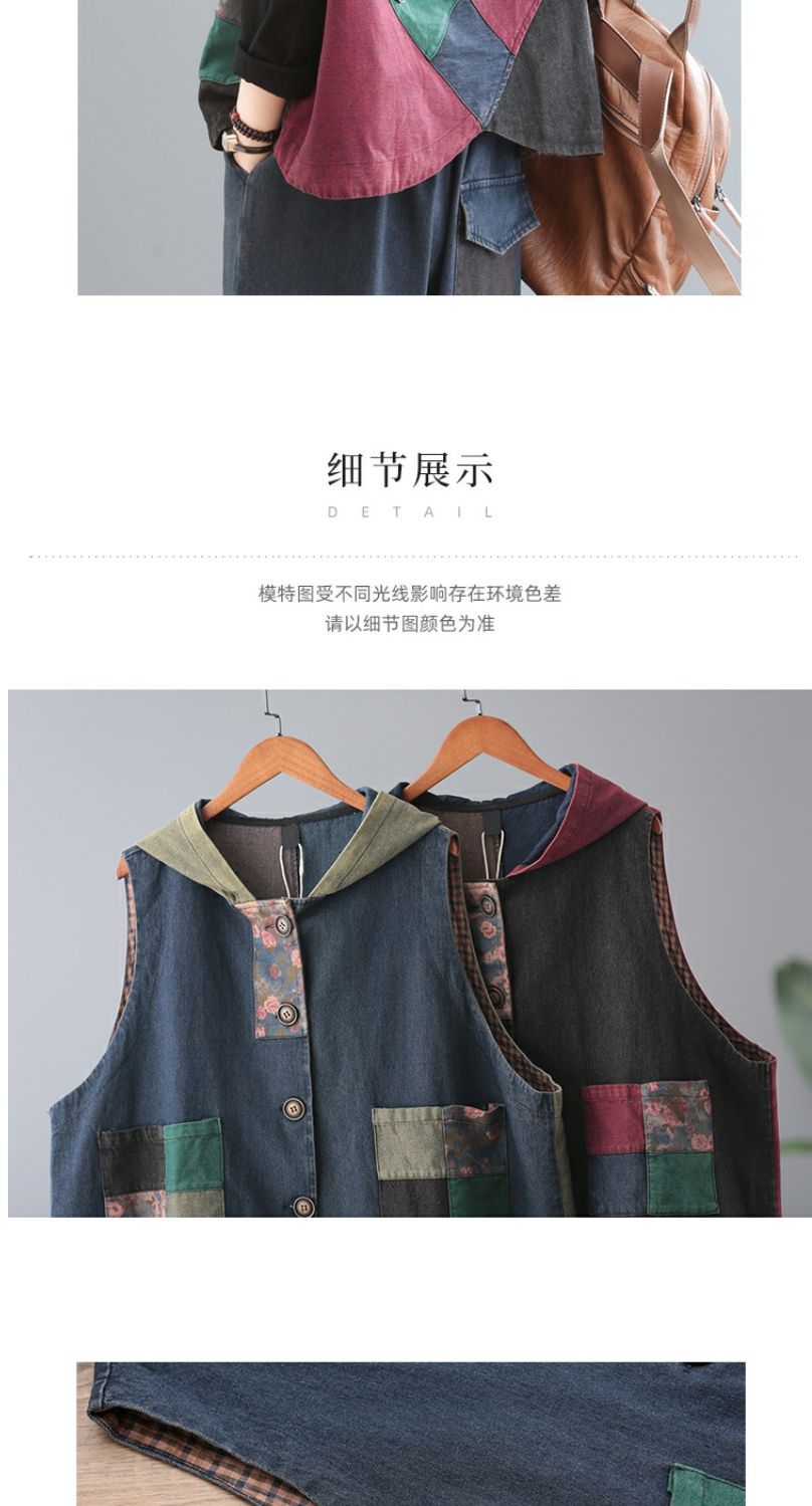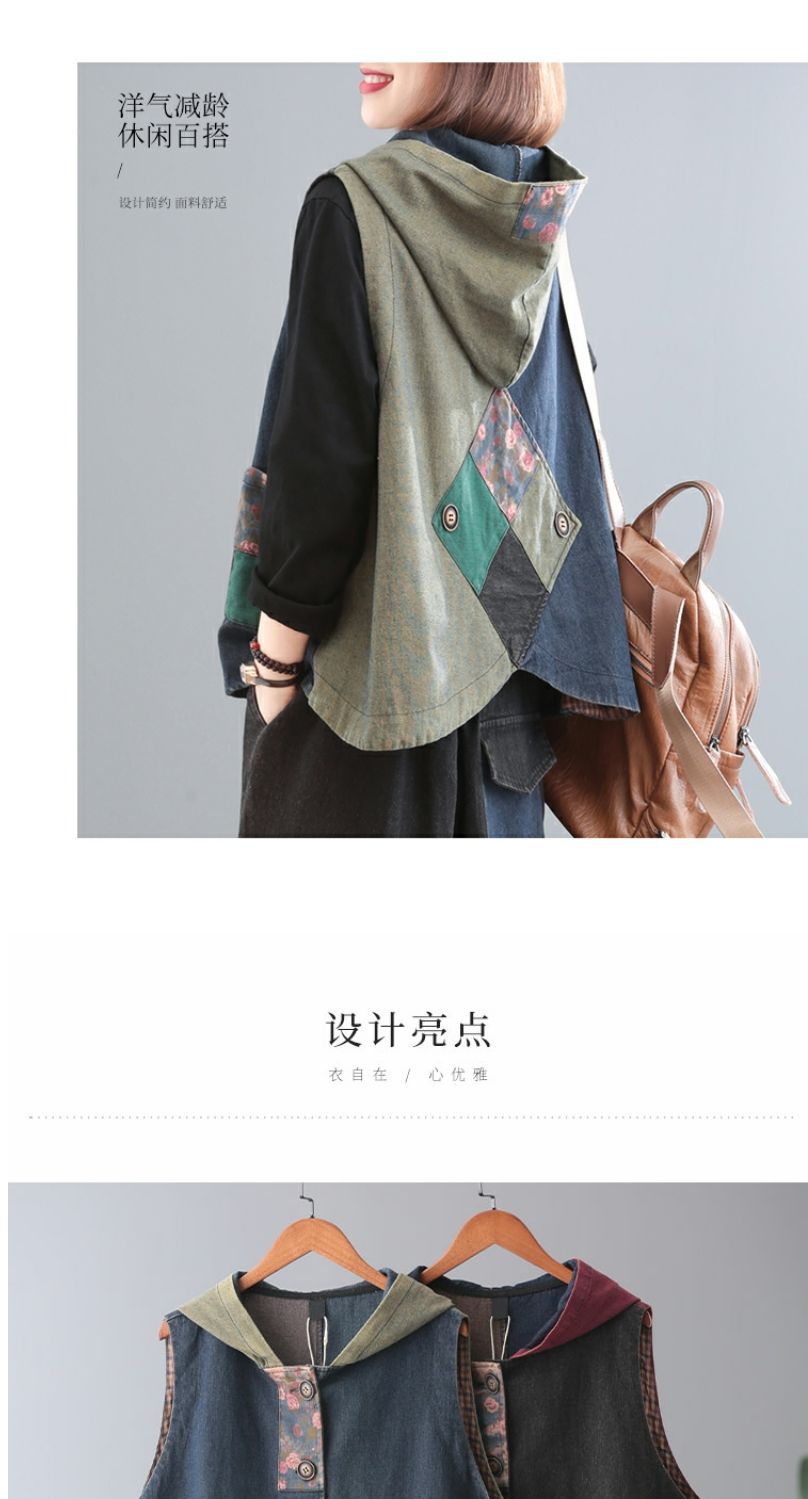 雀说 复古做旧连帽印花拼接牛仔马甲女617