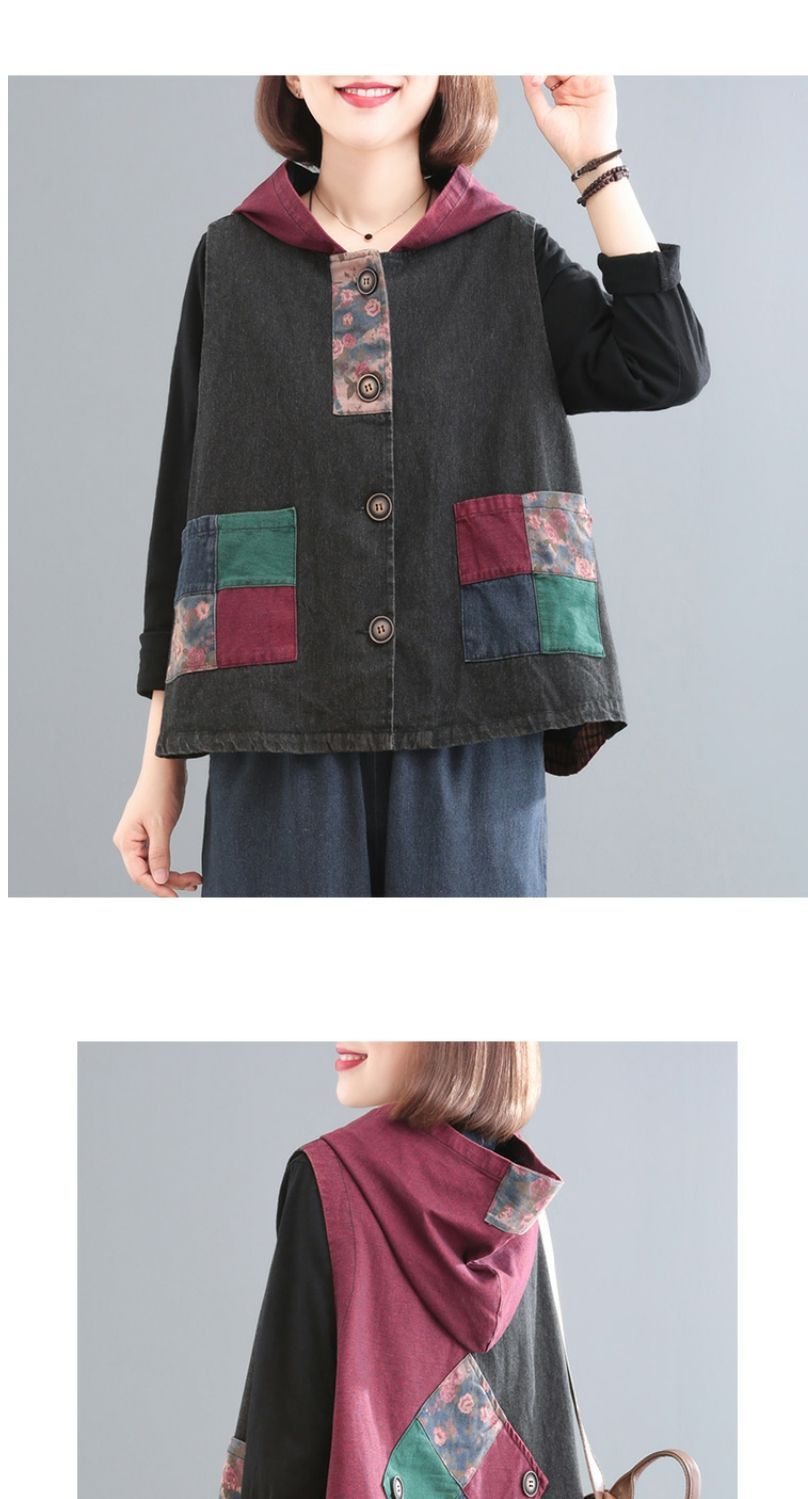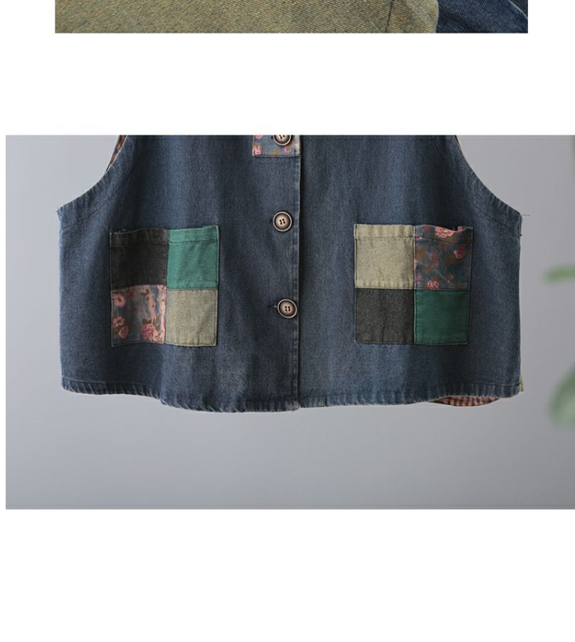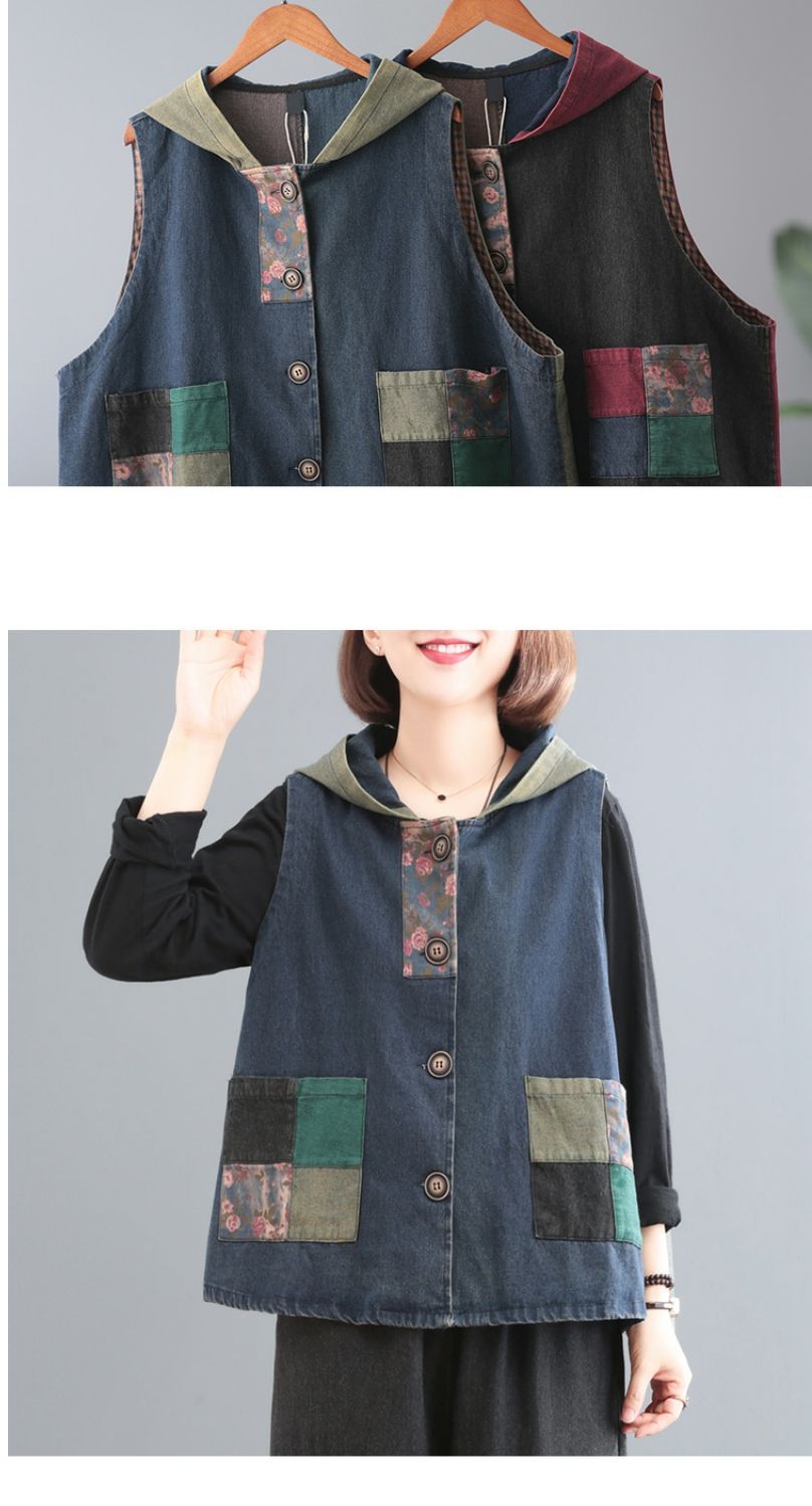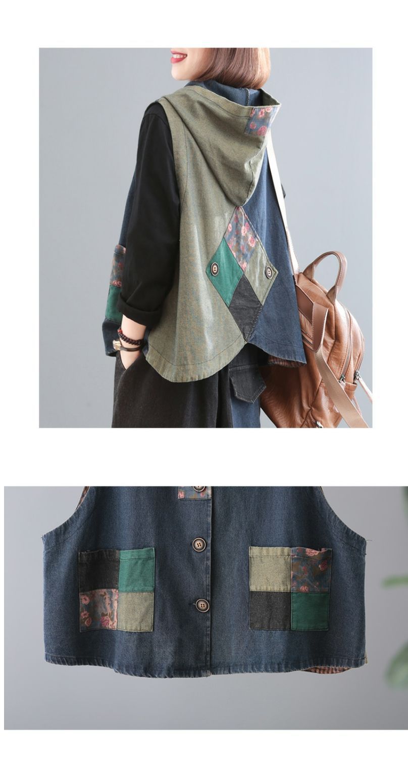 雀说 复古做旧连帽印花拼接牛仔马甲女617