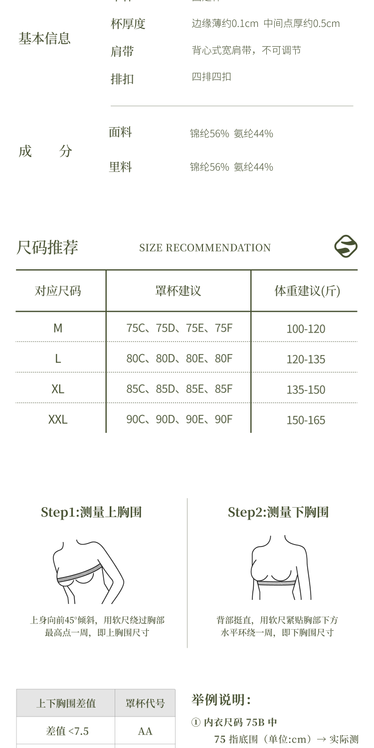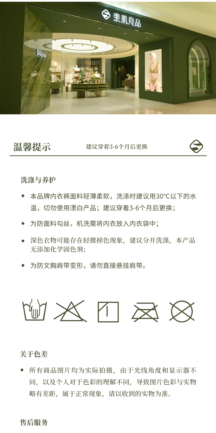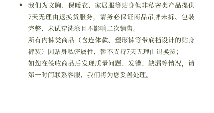 退换货规则:1.7天无理由退换货规则:品牌产品为贴身私密性衣物,务必保证所退产品吊牌水洗标齐全,无人为因素导致的破损、污渍、异味等影响二次销售的状况,否则,品牌有权不予退货退款,退货请将赠品一同寄回。内裤不支持7天无理由退换。换货差价将遵循多退少补的原则。