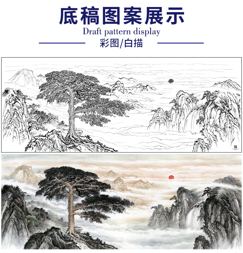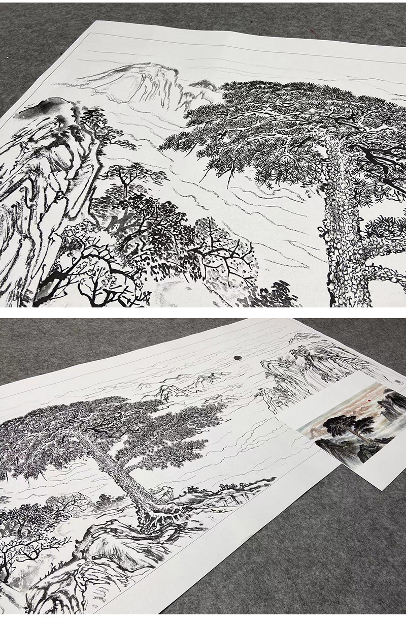 【大彩图】横幅工笔画白描底稿《迎客松》临摹勾线山水线稿FS15