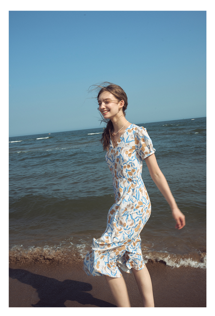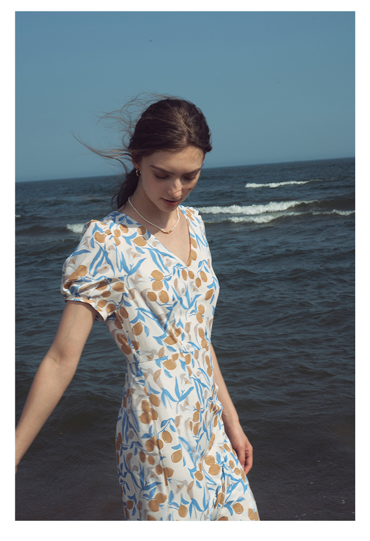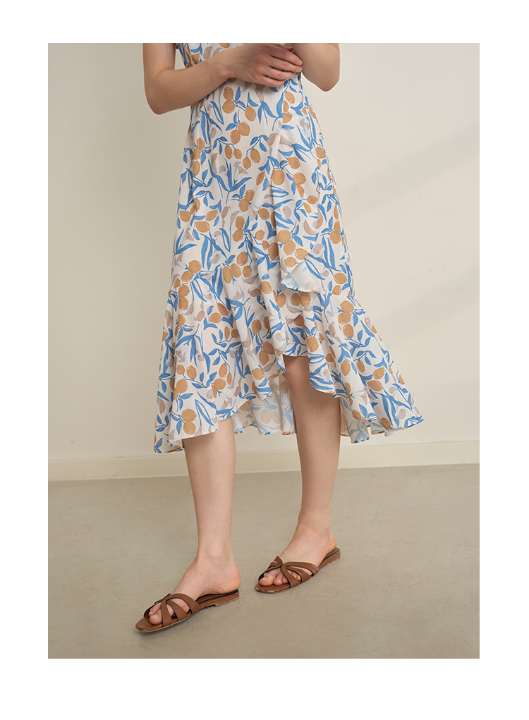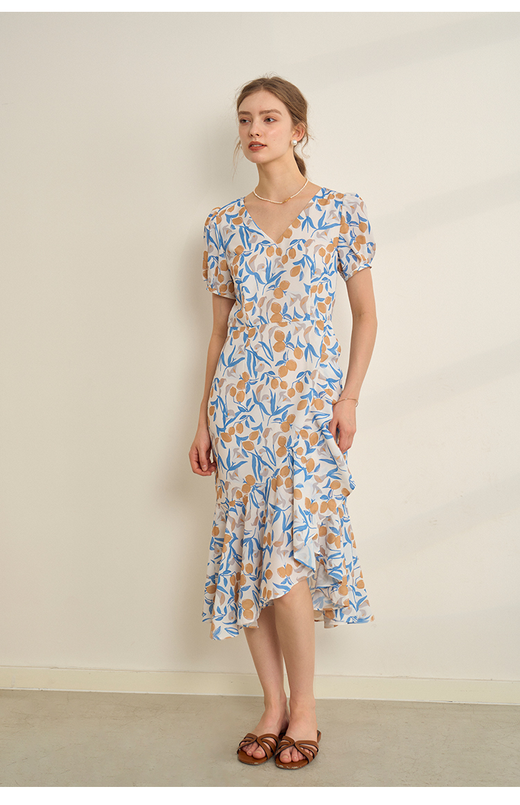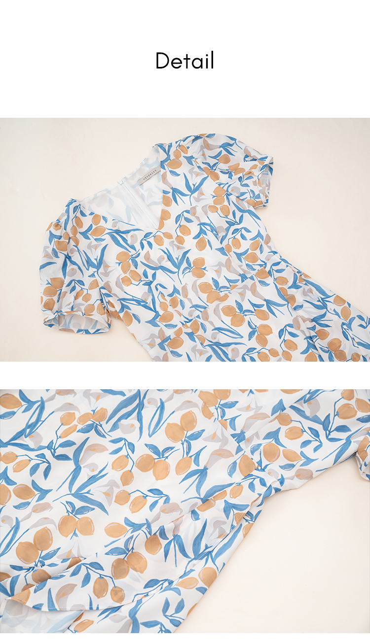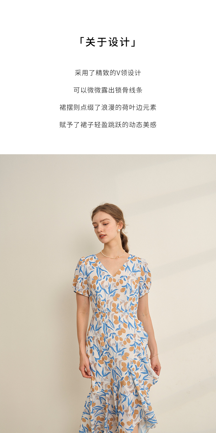 HeyDress原创柠檬碎花连衣裙女夏季法式V领荷叶设计浪漫度假裙子