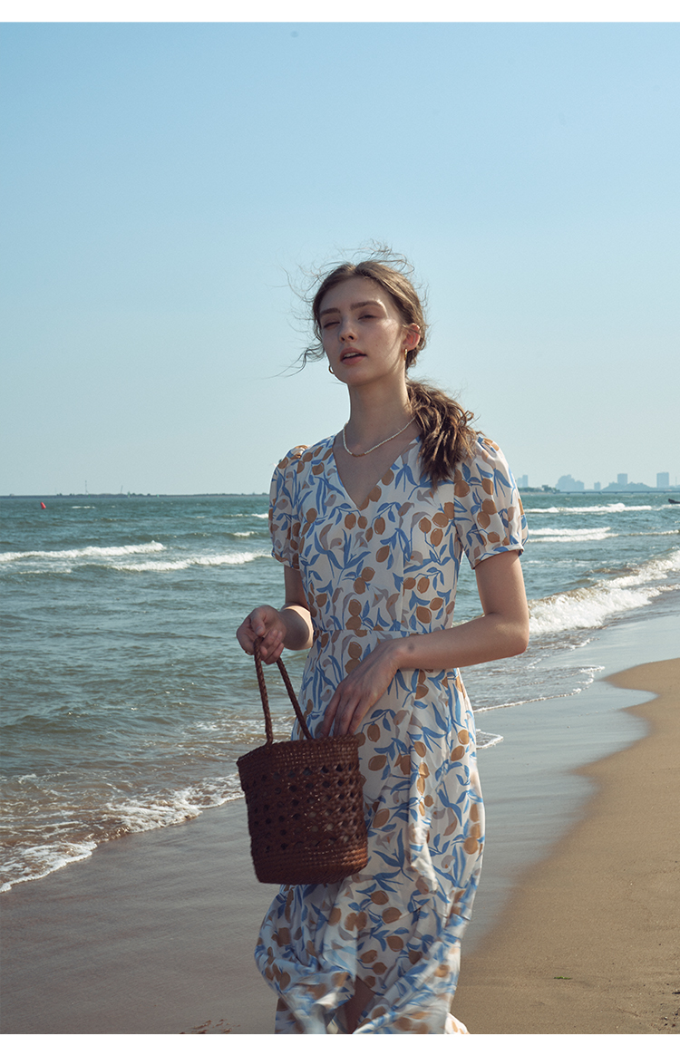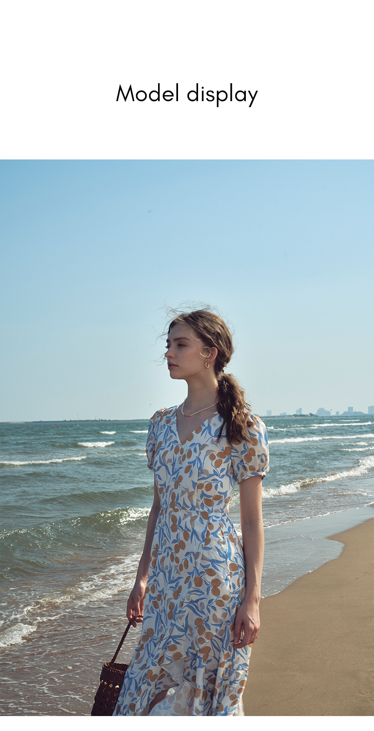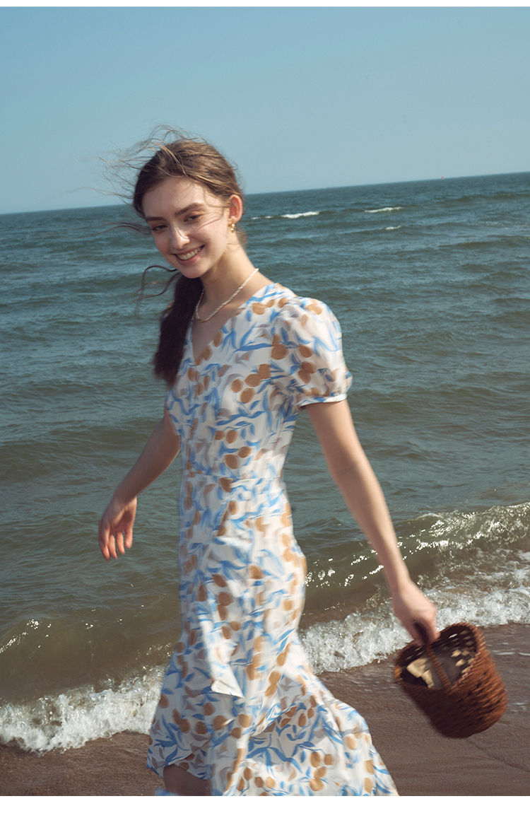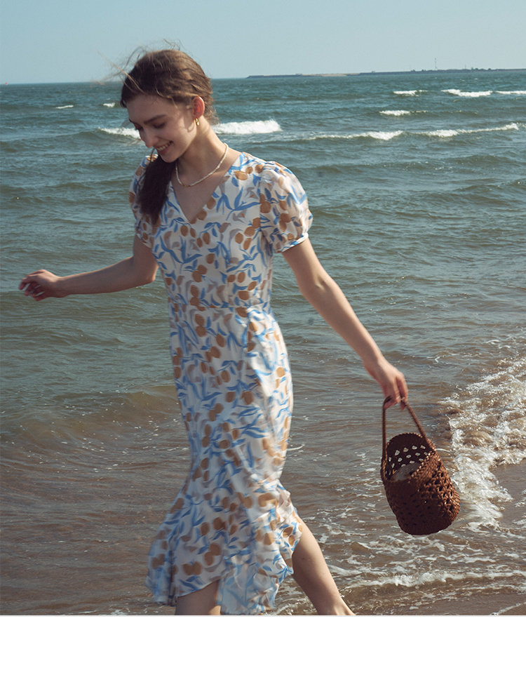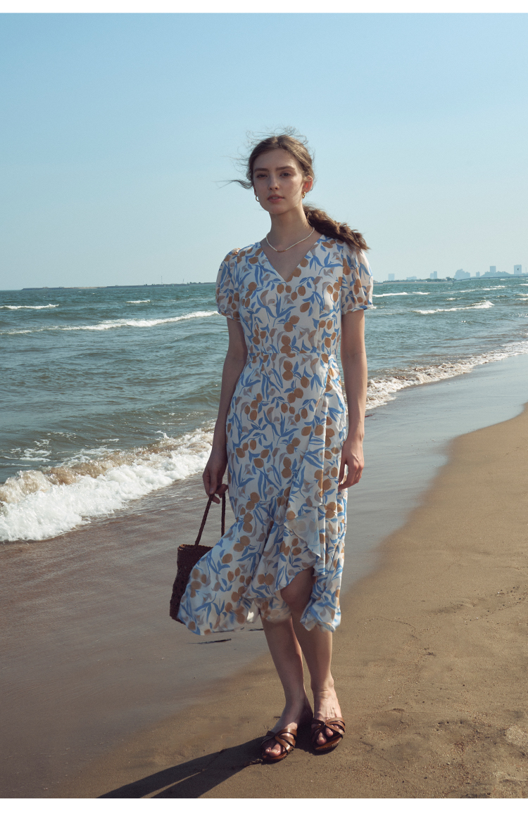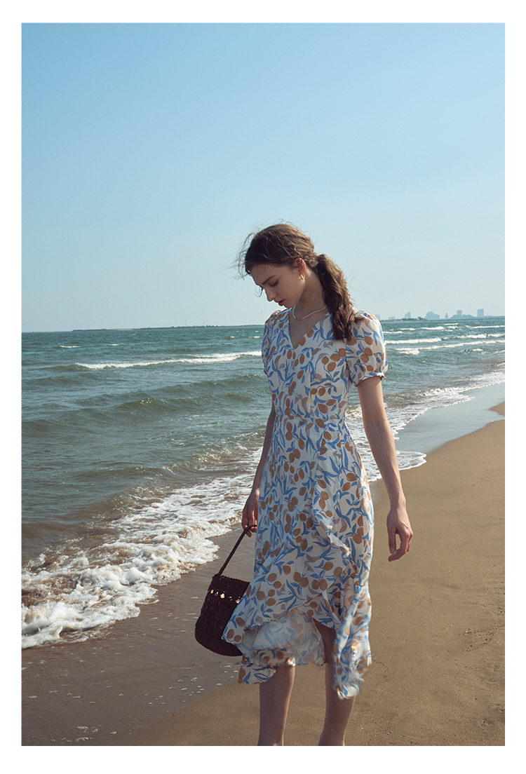 HeyDress原创柠檬碎花连衣裙女夏季法式V领荷叶设计浪漫度假裙子