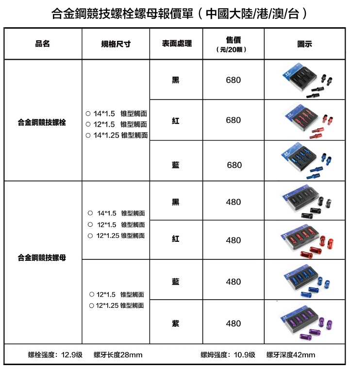 高强度合金钢材质: 螺栓为12.9级钢,螺帽为10.9级,确保锁附强度,适应日常驾驶与激烈操控。