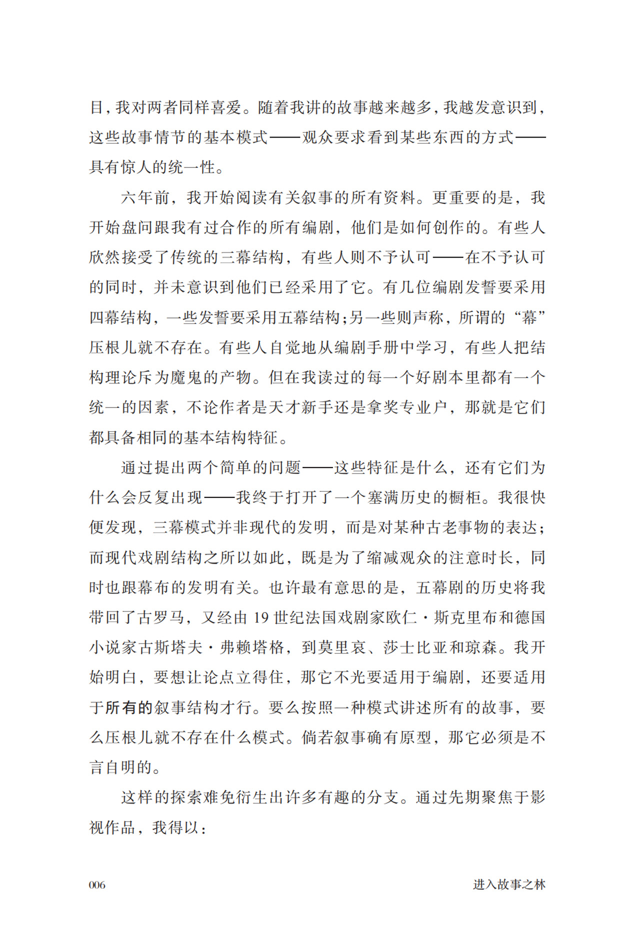 约翰·约克以故事的五段旅程,对应创作的五个部分,对一切叙事形态共享的基本结构进行了深度探索。我们跟随作品中的人物,踏上仿若进入森林一般的“往程—归程”之旅,通过探寻小结构模仿大结构的分形形态,研究反复出现的正题、反题、合题,通过激发事件、中点、危机、高潮,问题得以最终解决。在吸收了前人精华的五幕式创作法的框架下,主题有机浮现,叙事自然发生。