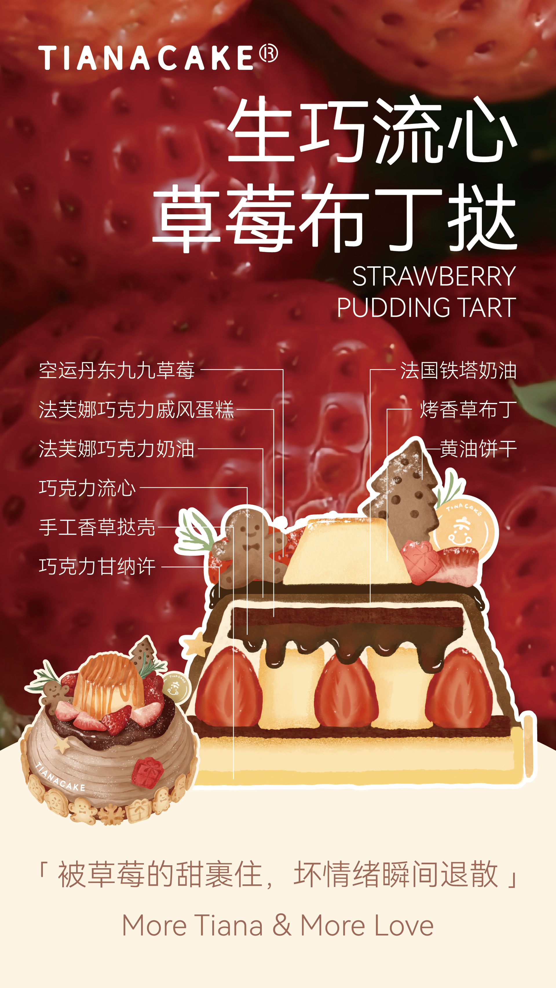 丹东空运九九草莓、烤香草布丁、巧克力流心、法国铁塔奶油、法芙娜巧克力奶油、巧克力甘纳许、手工香草挞壳、法芙娜巧克力戚风蛋糕、黄油饼干、椰蓉