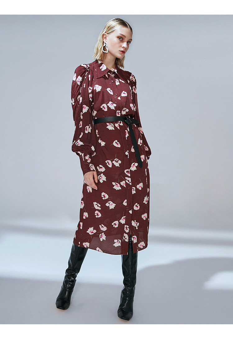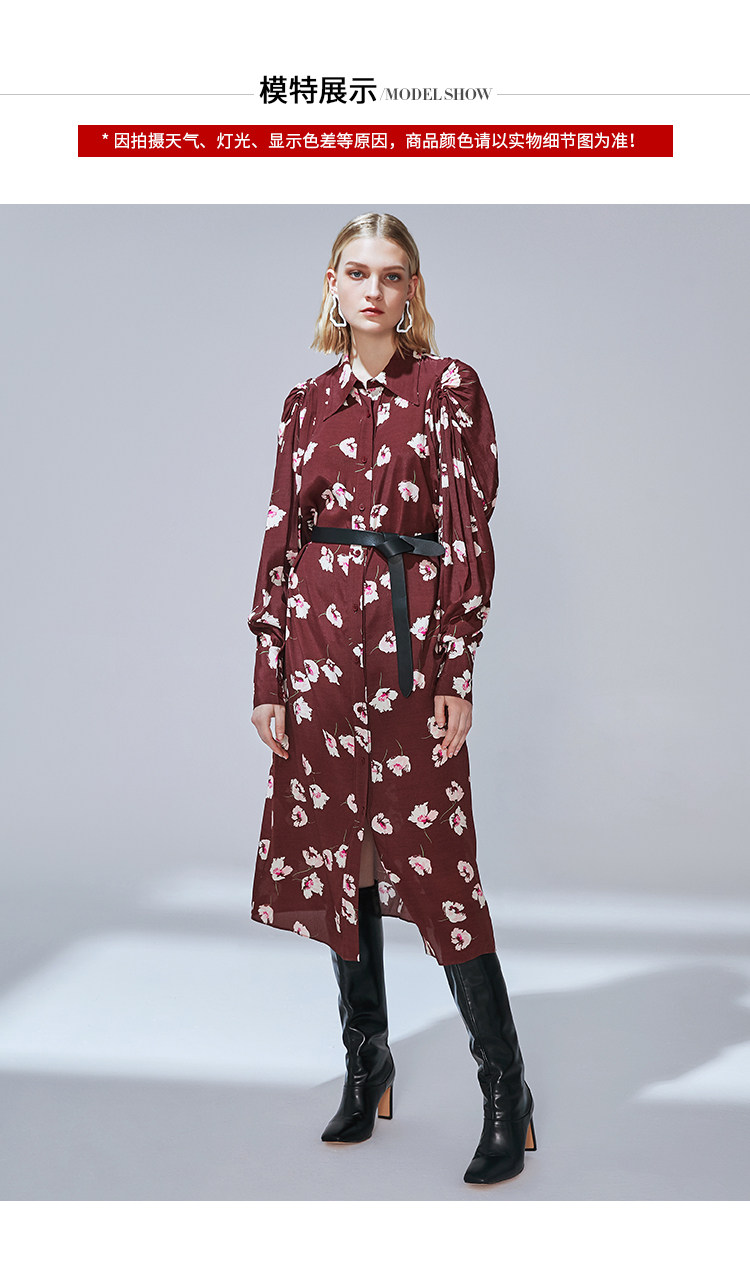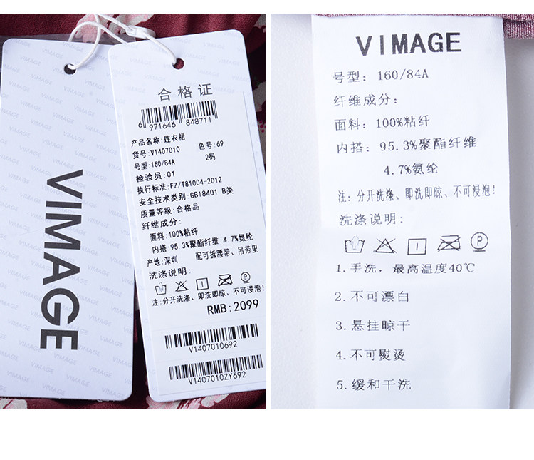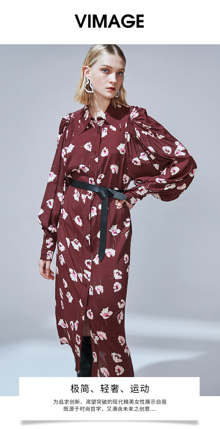 VIMAGE纬漫纪秋款个性百褶灯笼袖收腰显瘦复古印花连衣裙V1407010