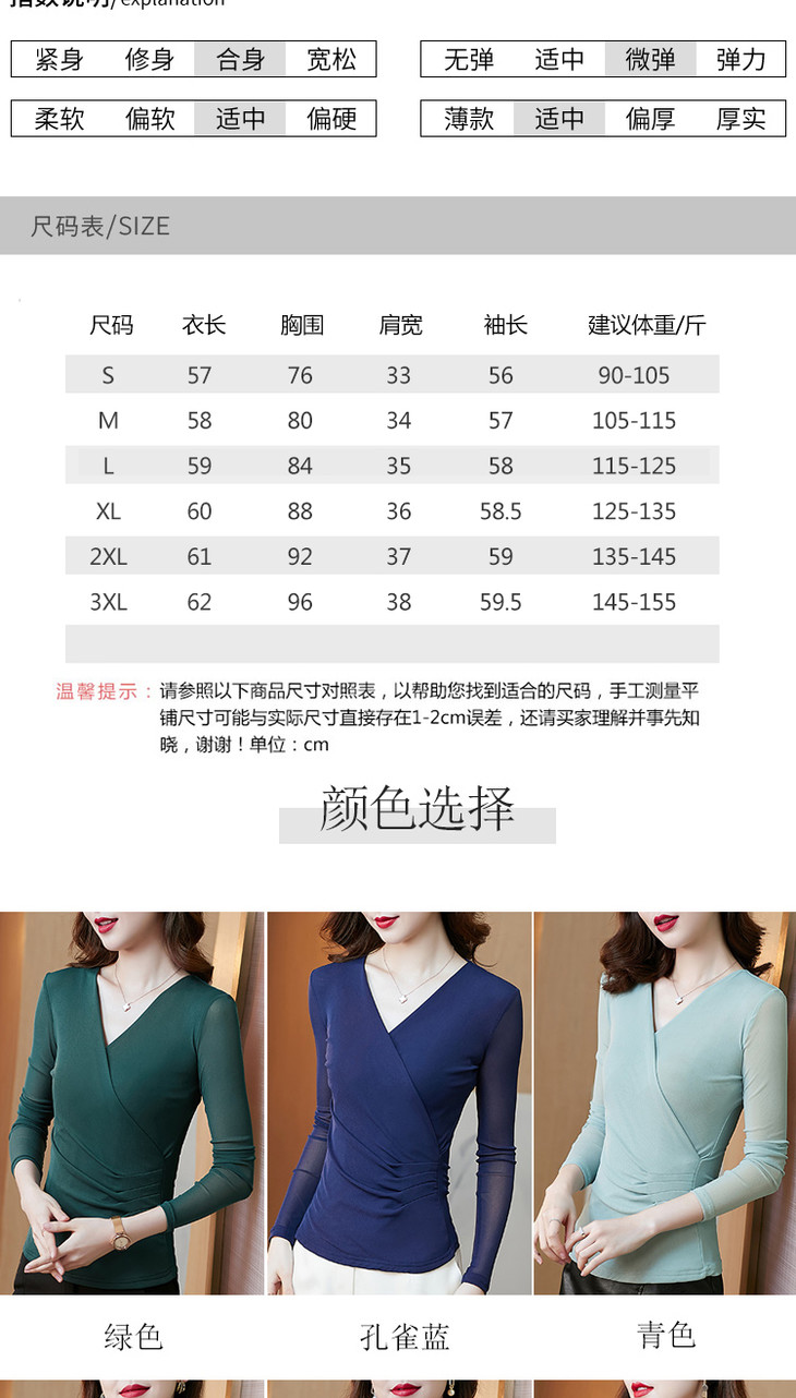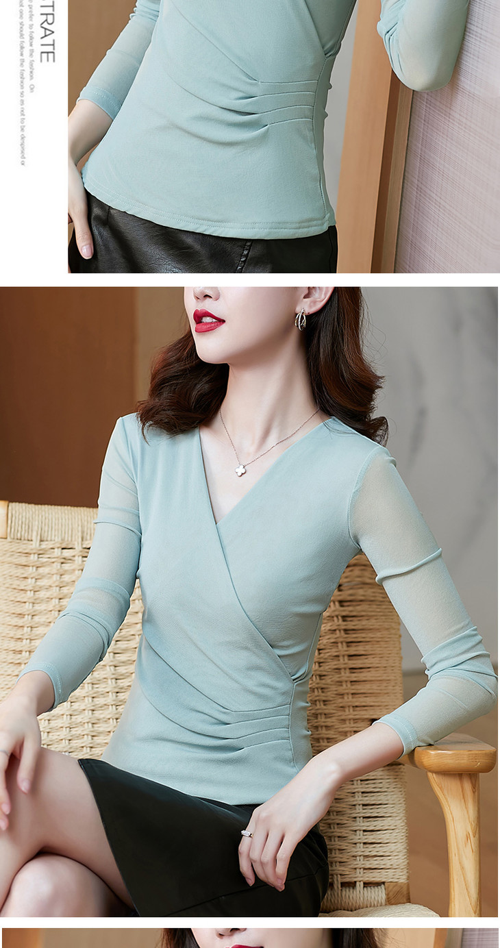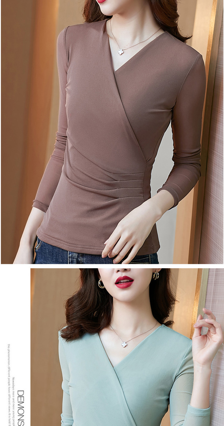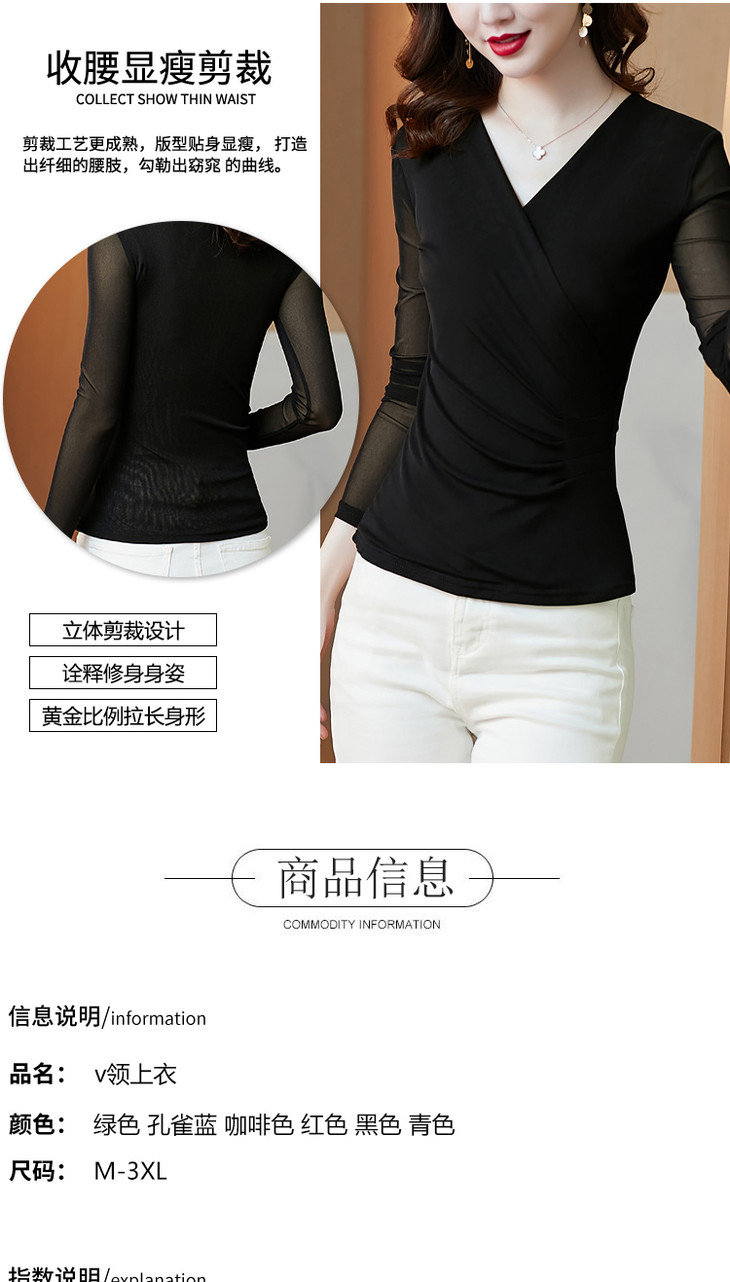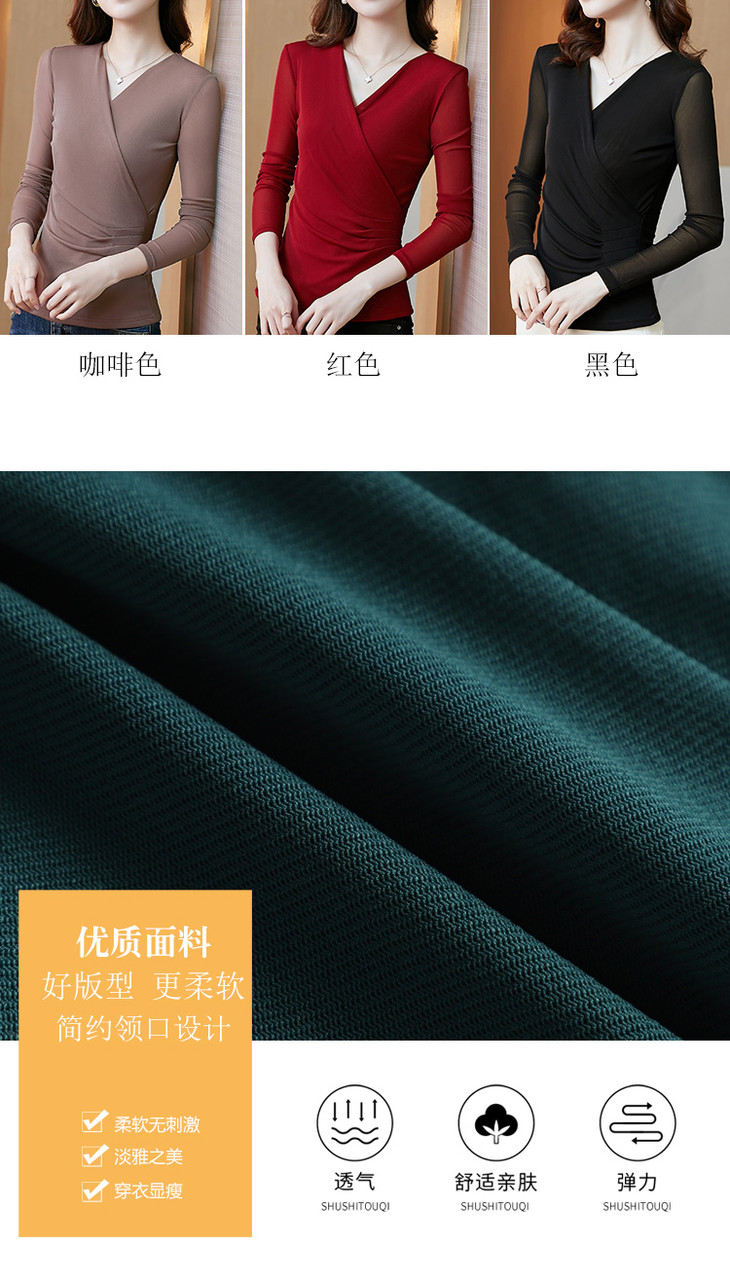 KQL- E001M6065 2021秋季新款时尚纯色网纱交叉V领打底衫长袖女修身显瘦大码T恤