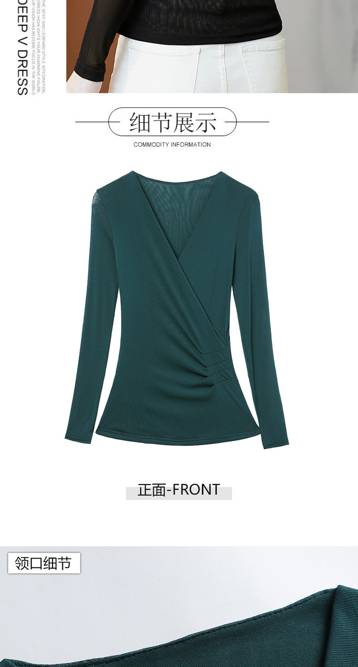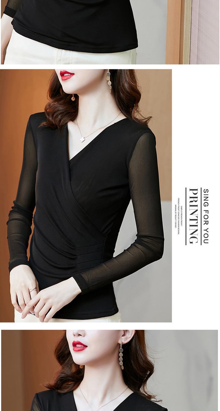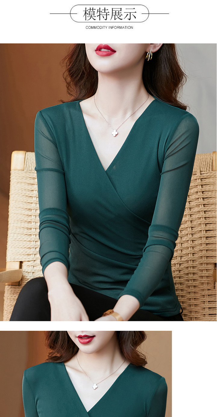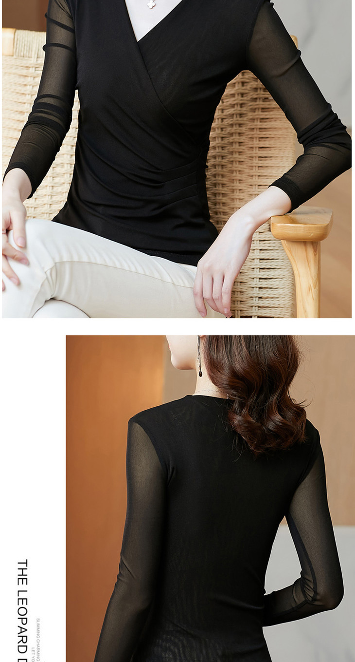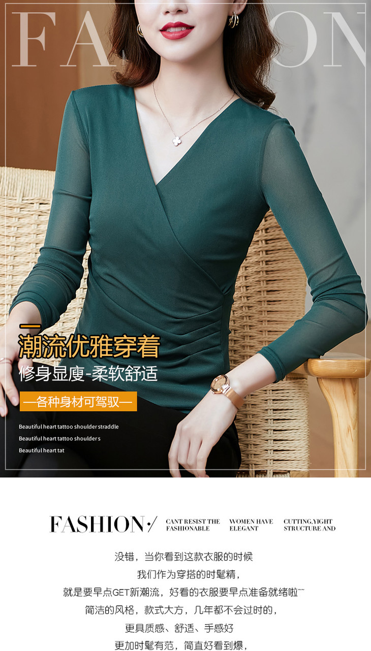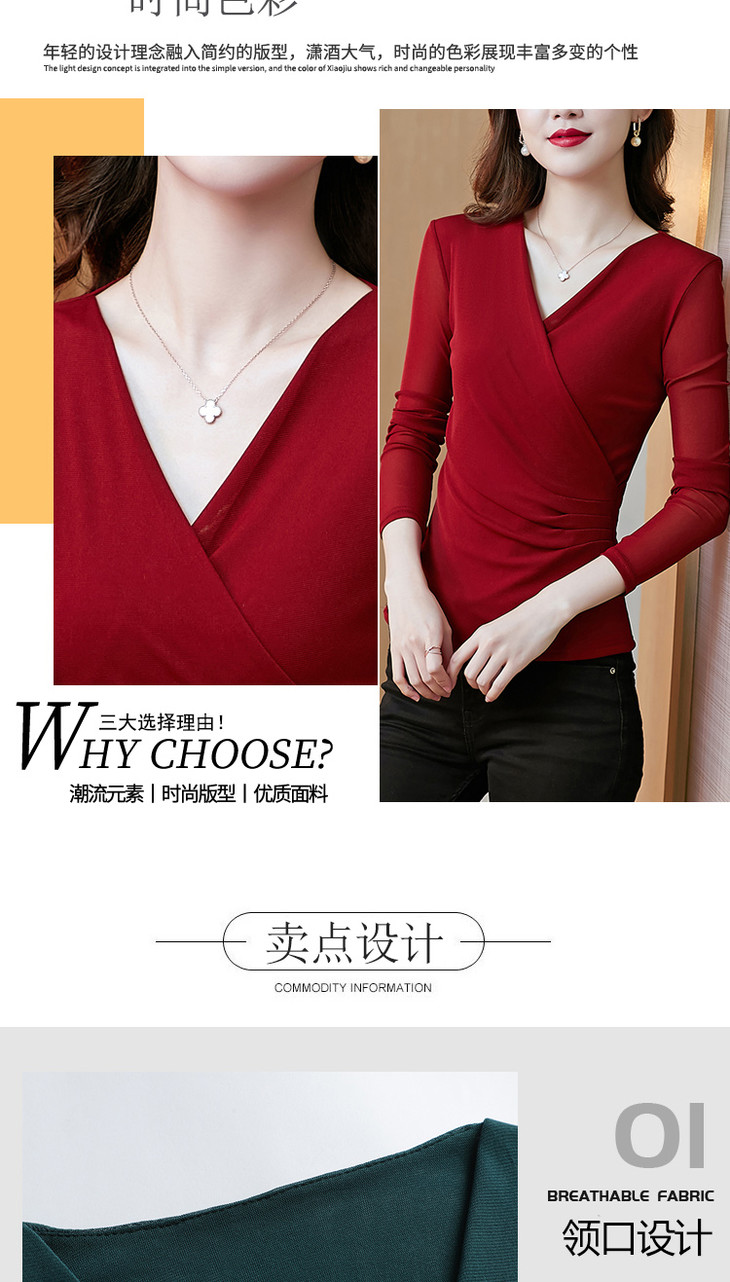 KQL- E001M6065 2021秋季新款时尚纯色网纱交叉V领打底衫长袖女修身显瘦大码T恤