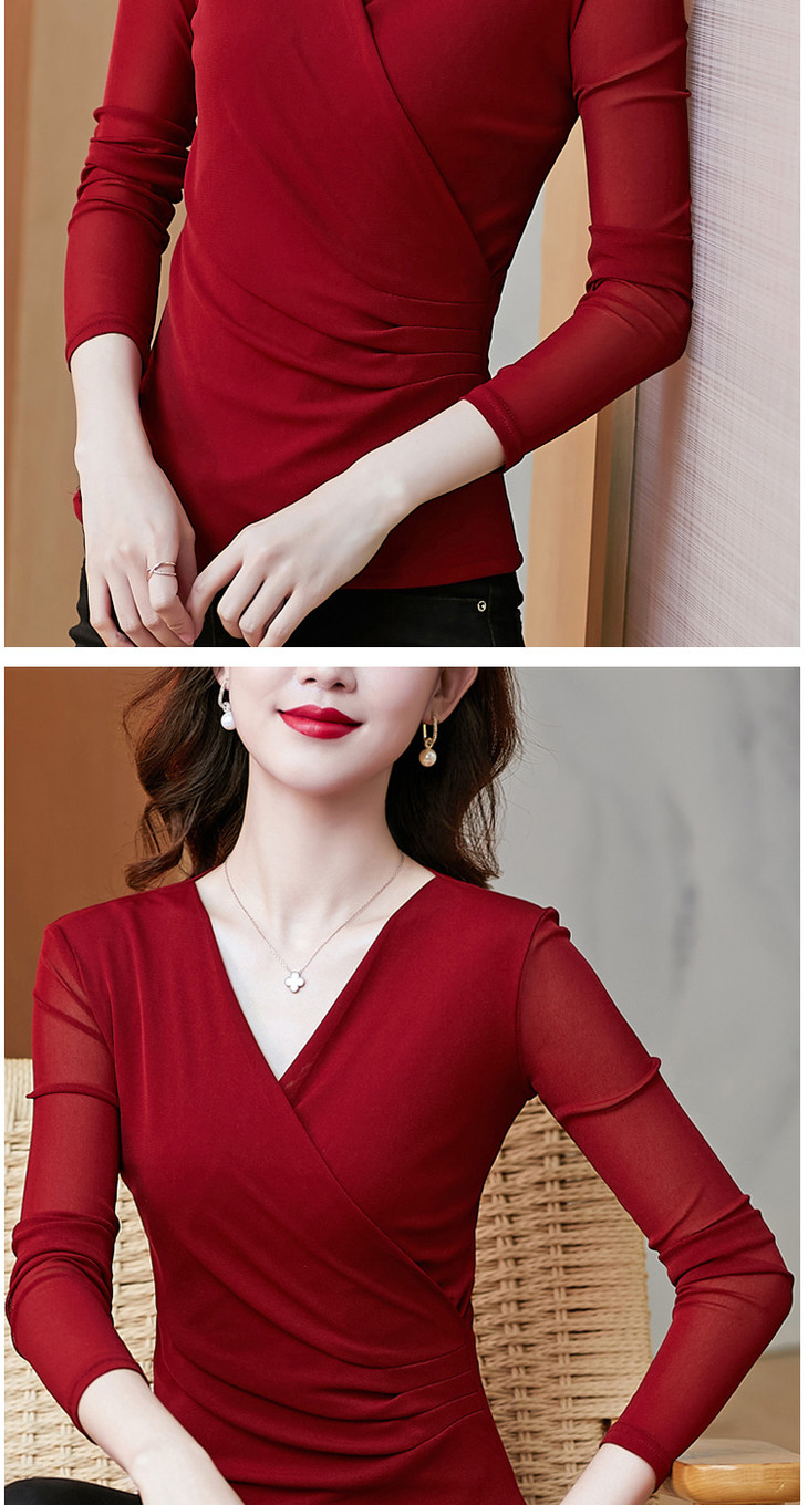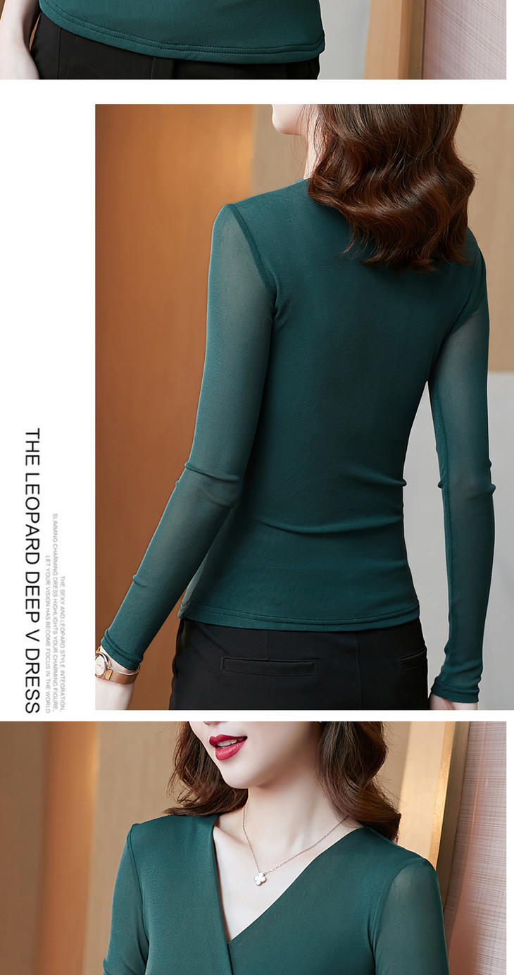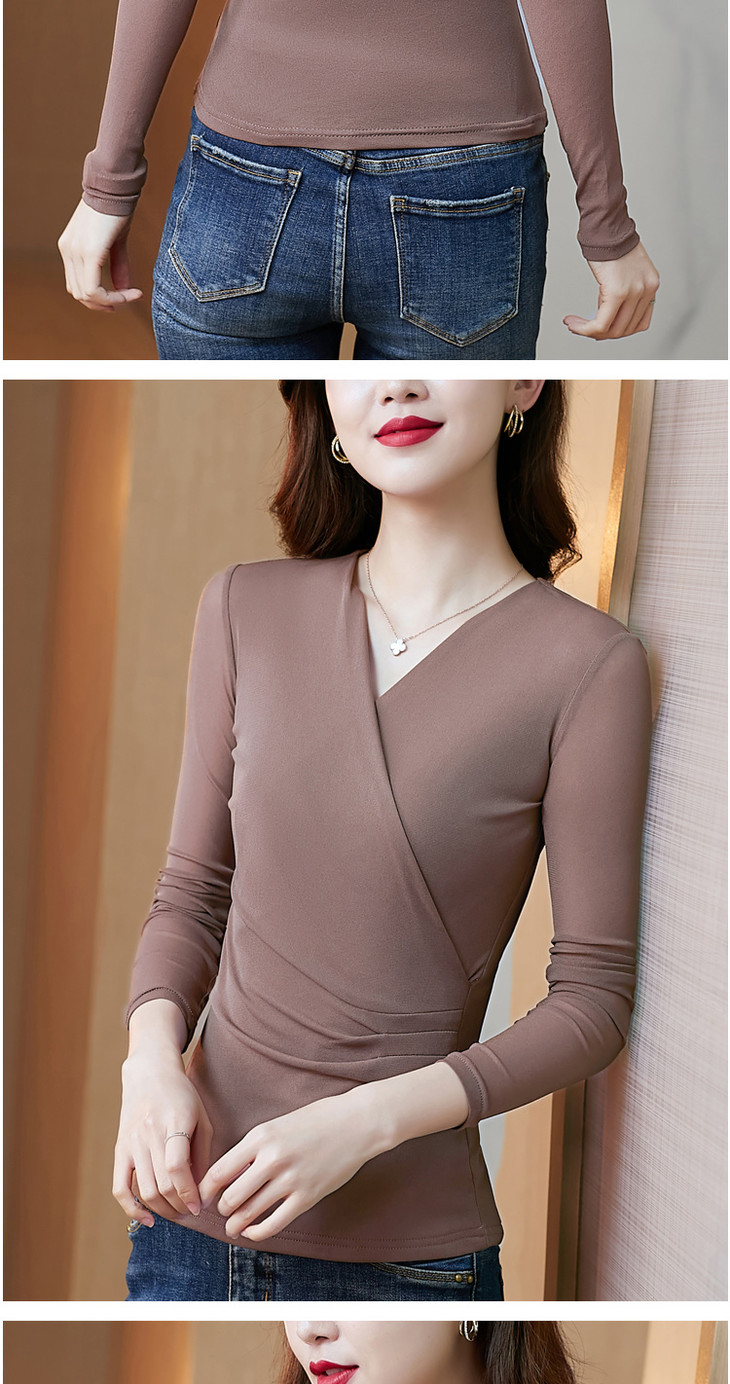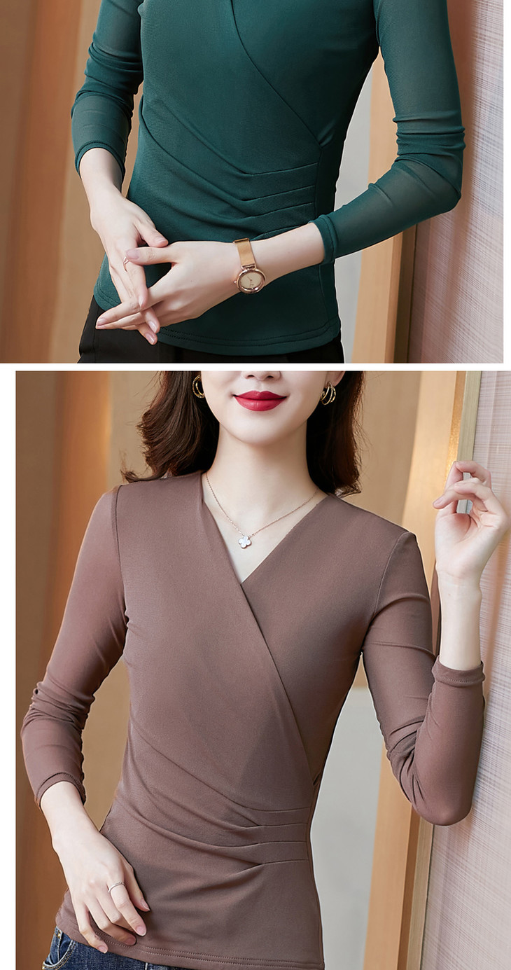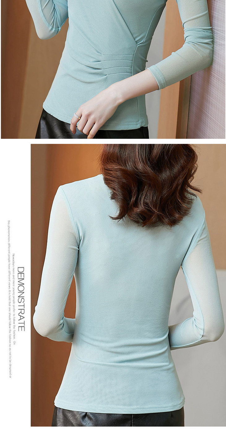 KQL- E001M6065 2021秋季新款时尚纯色网纱交叉V领打底衫长袖女修身显瘦大码T恤