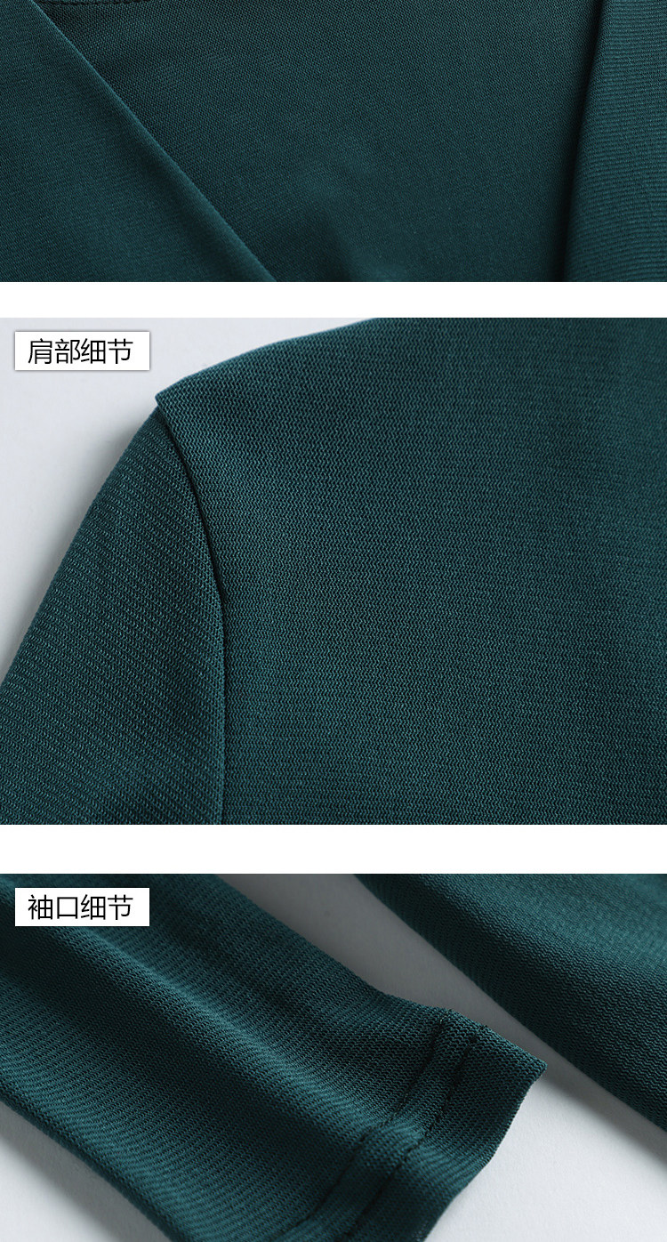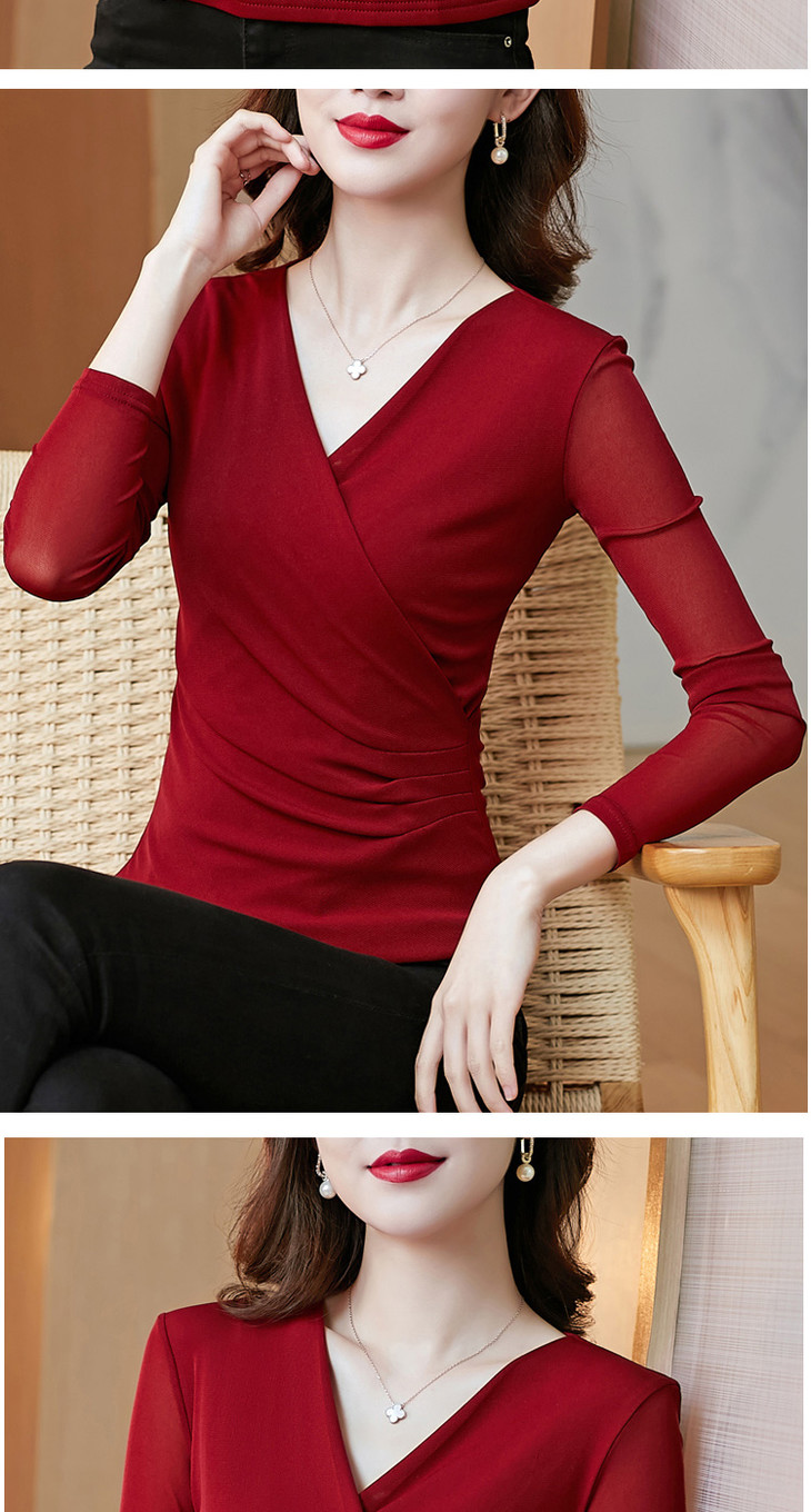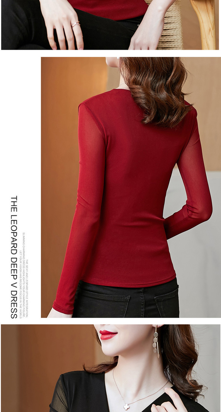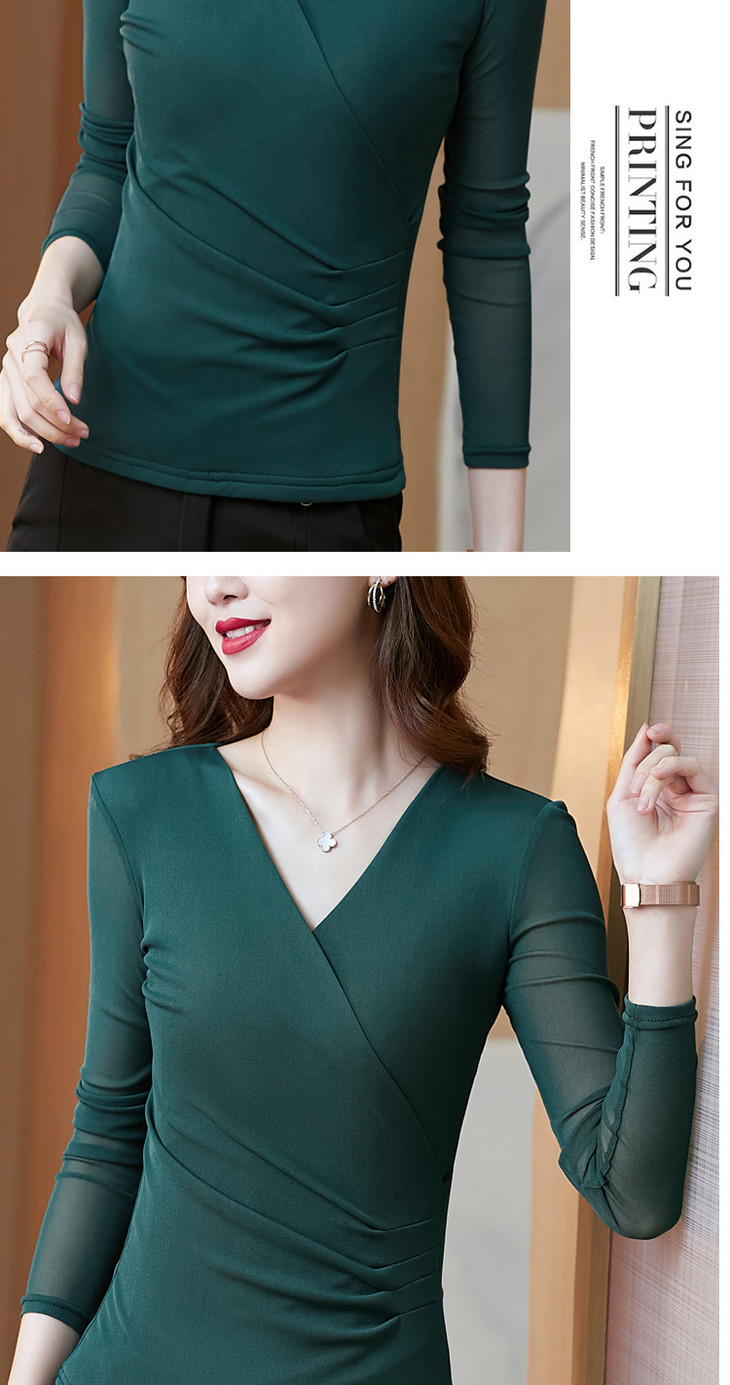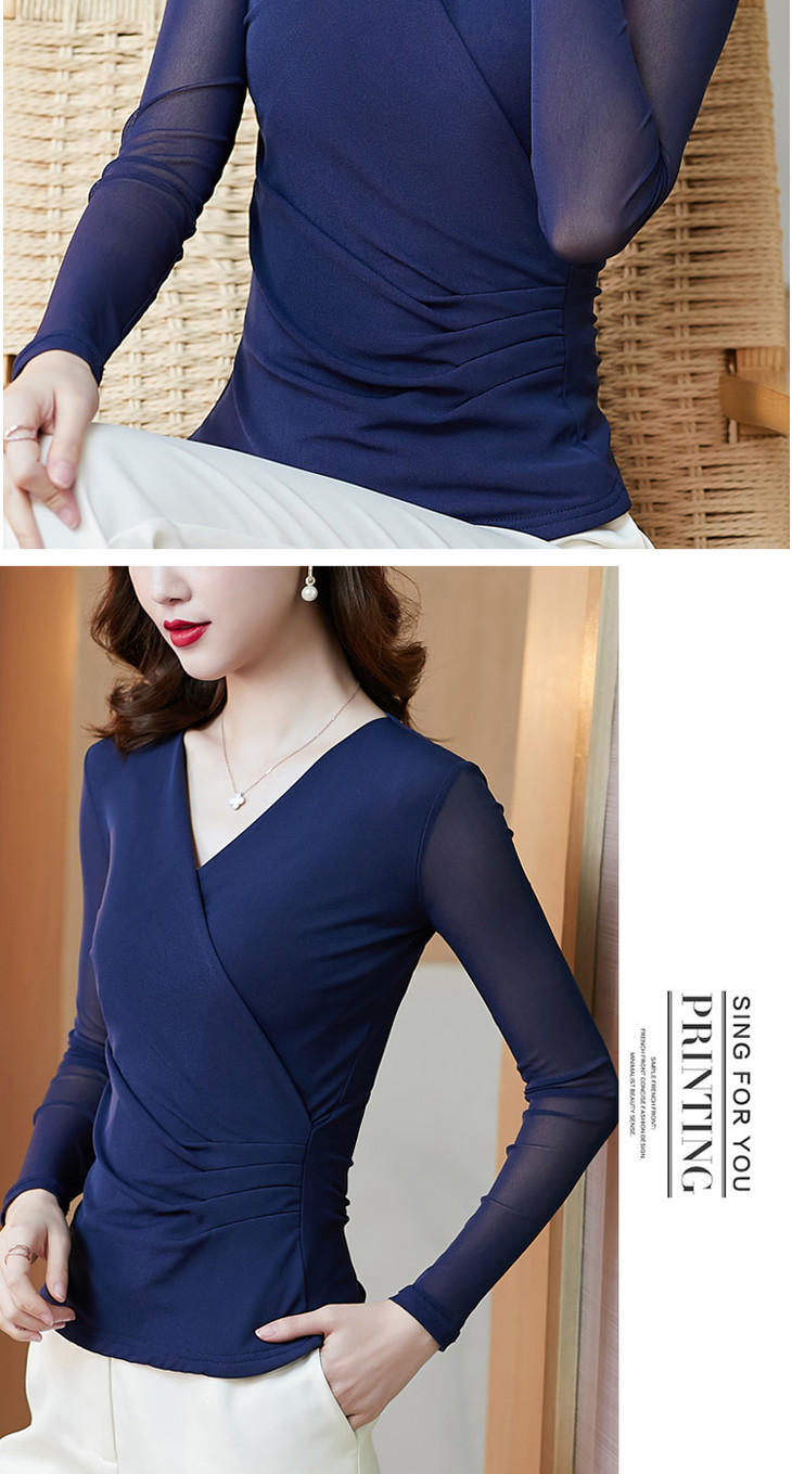 KQL- E001M6065 2021秋季新款时尚纯色网纱交叉V领打底衫长袖女修身显瘦大码T恤